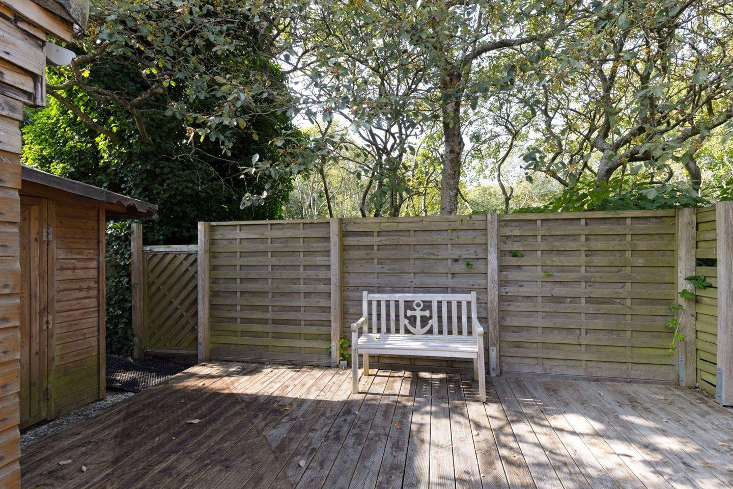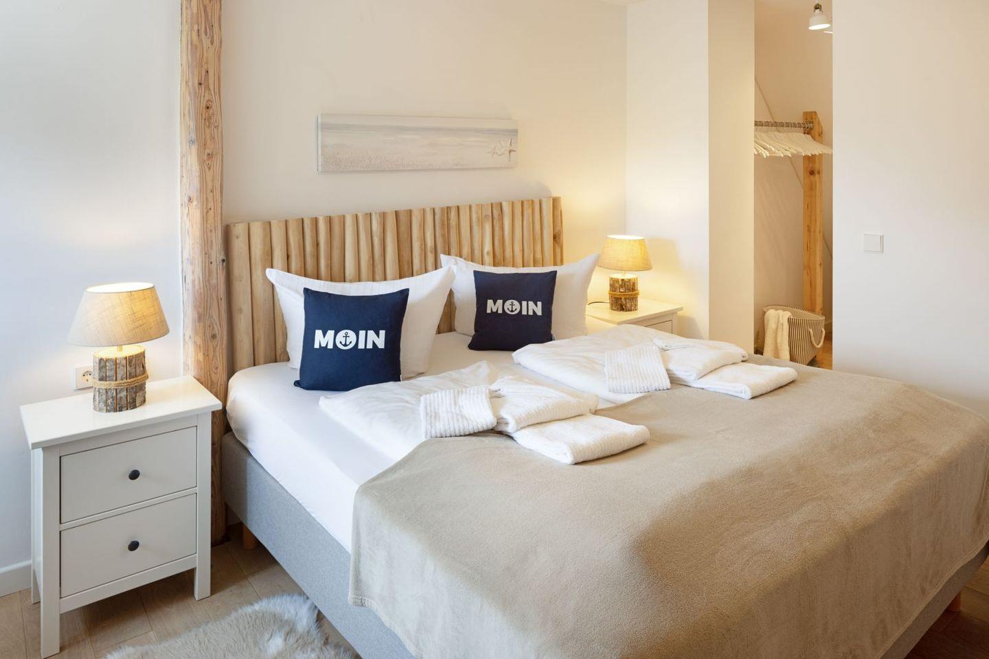 Im Erdgeschoss befindet sich ein Masterbedroom mit Doppelbett und Duschbad en suite, im Obergeschoss zwei weitere Schlafzimmer mit Doppelbett