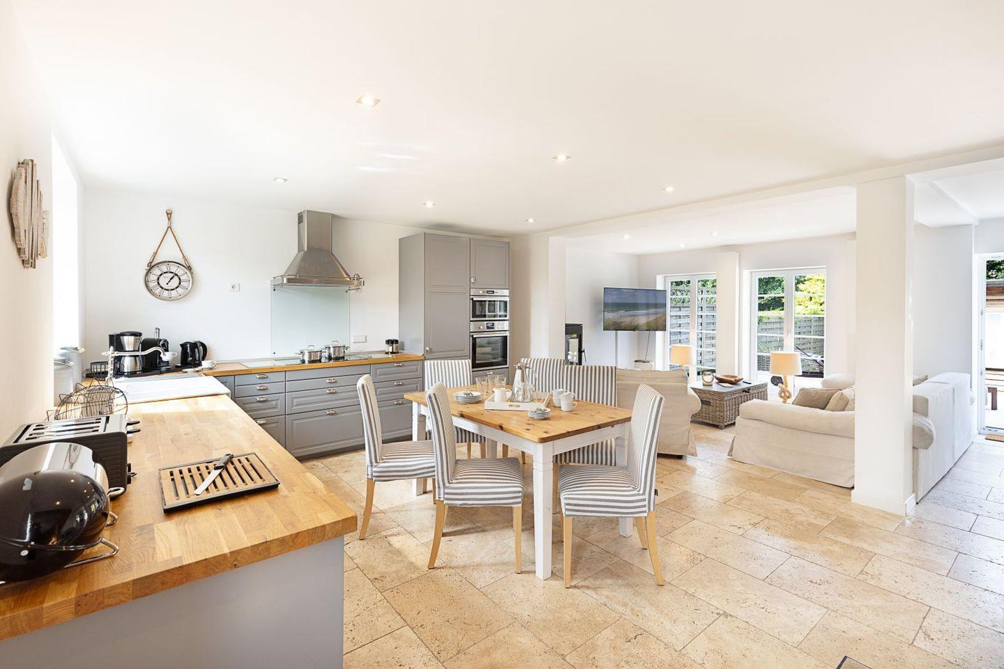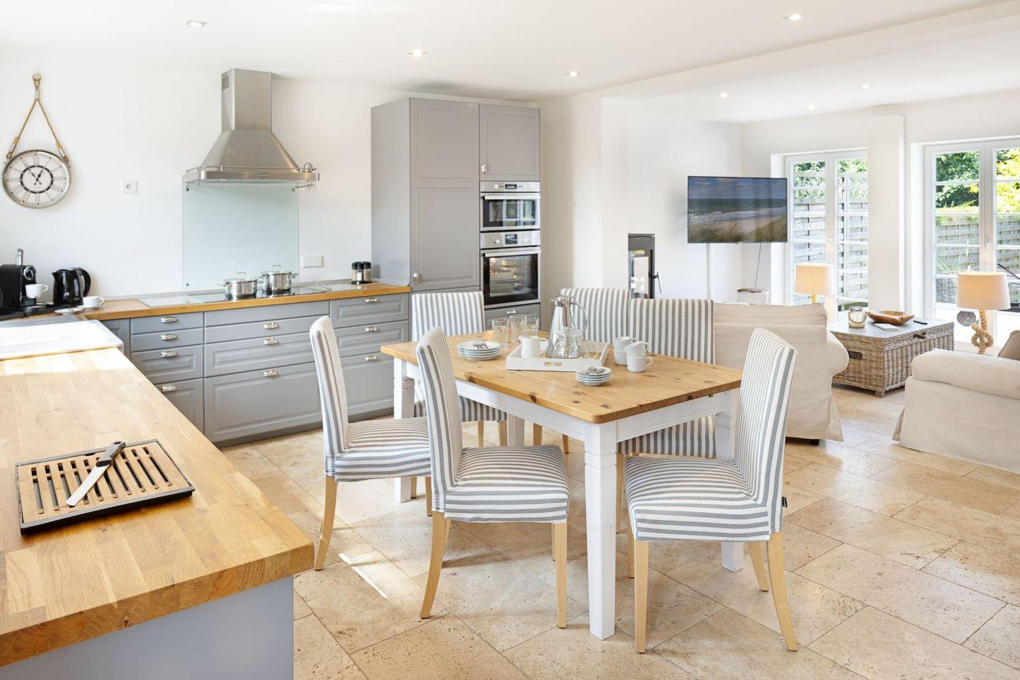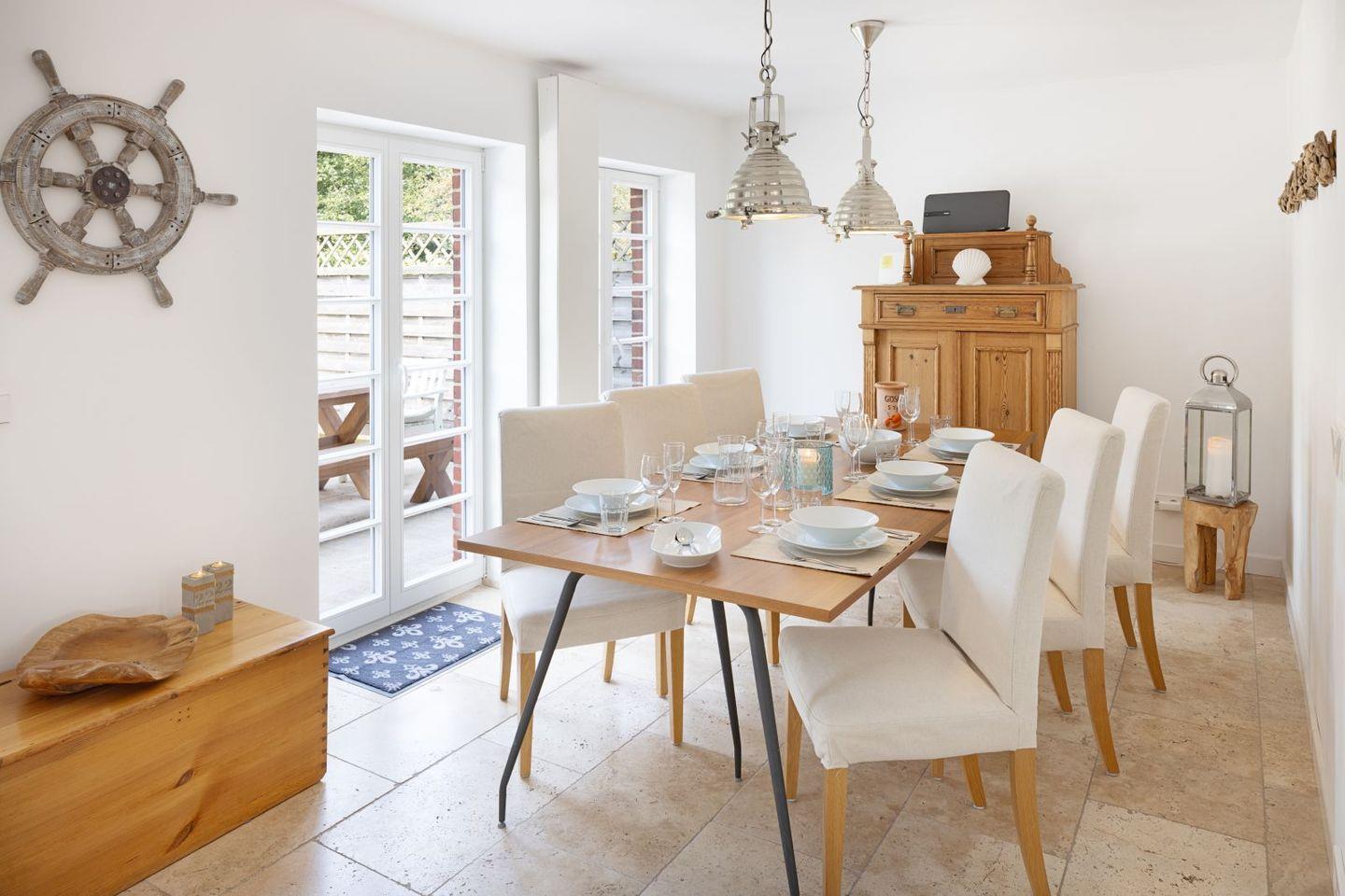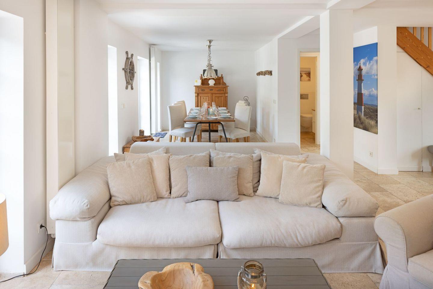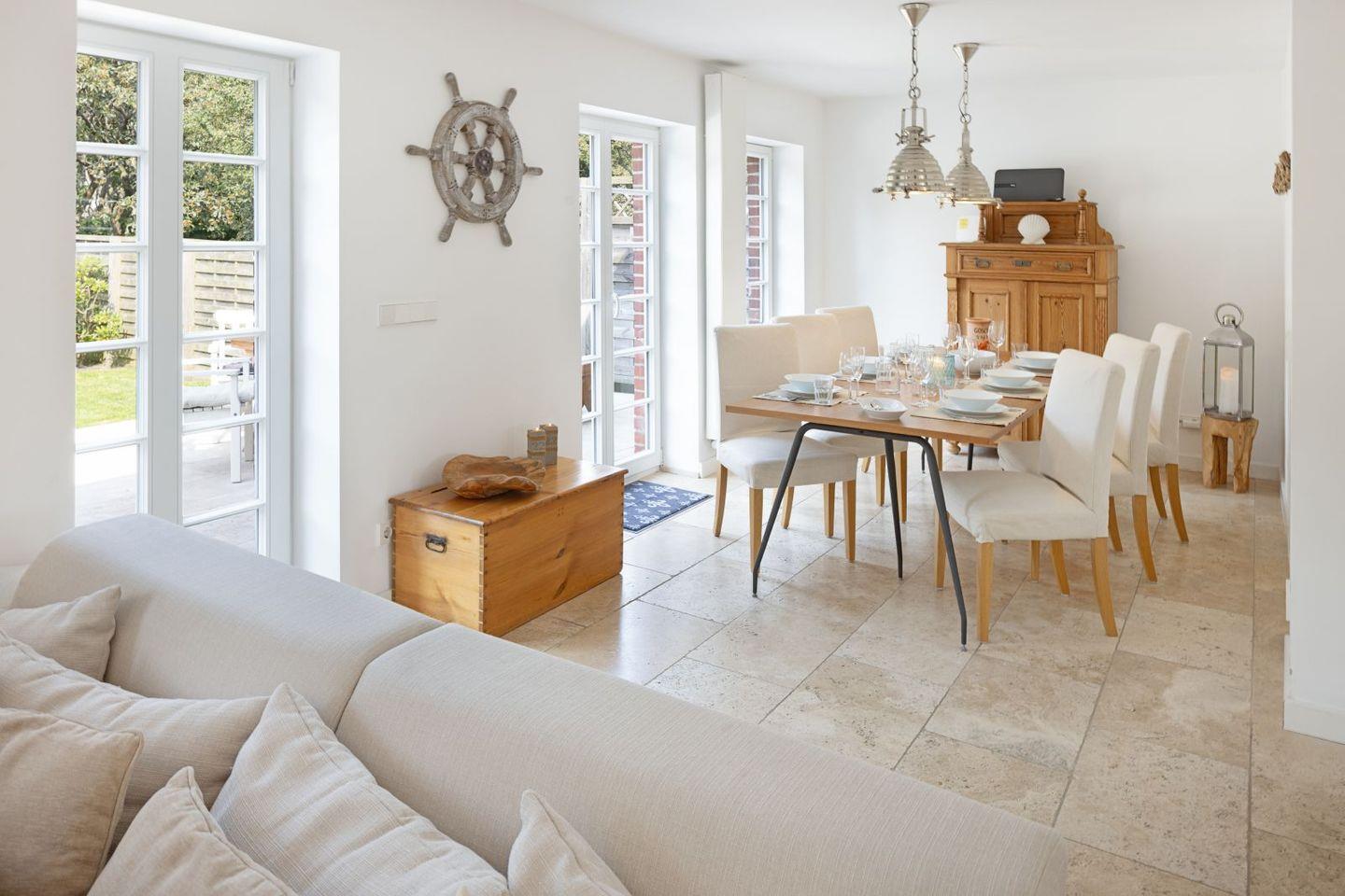 Das Erdgeschoss Ihres Feriendomizils besticht durch seine offene lichtdurchflutete Struktur, die sich bis auf die große Terrasse fortsetzt.