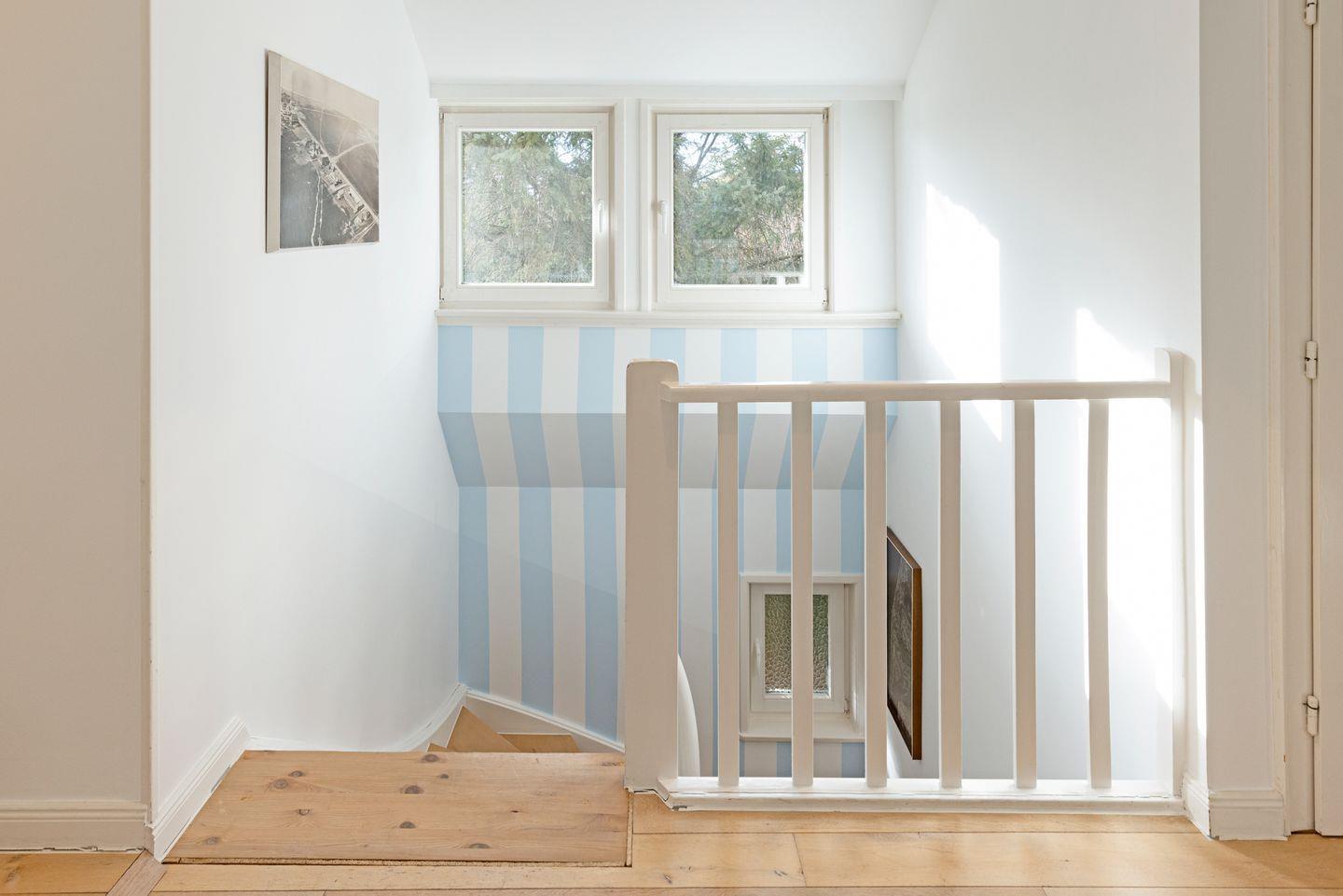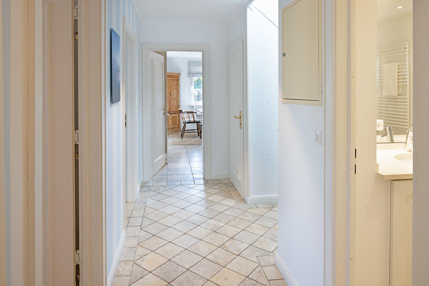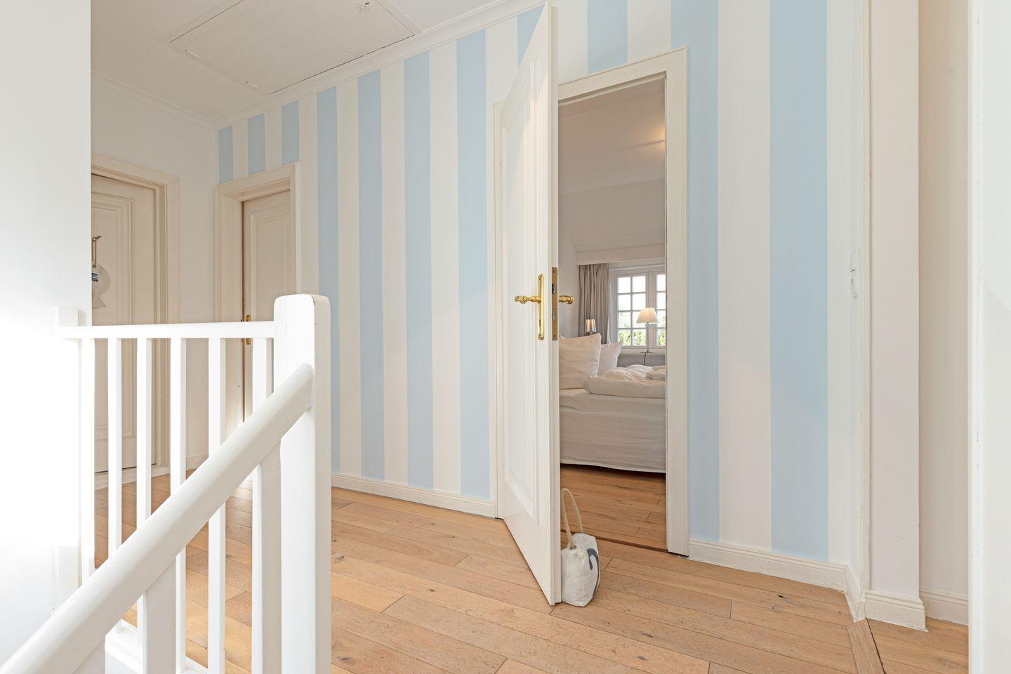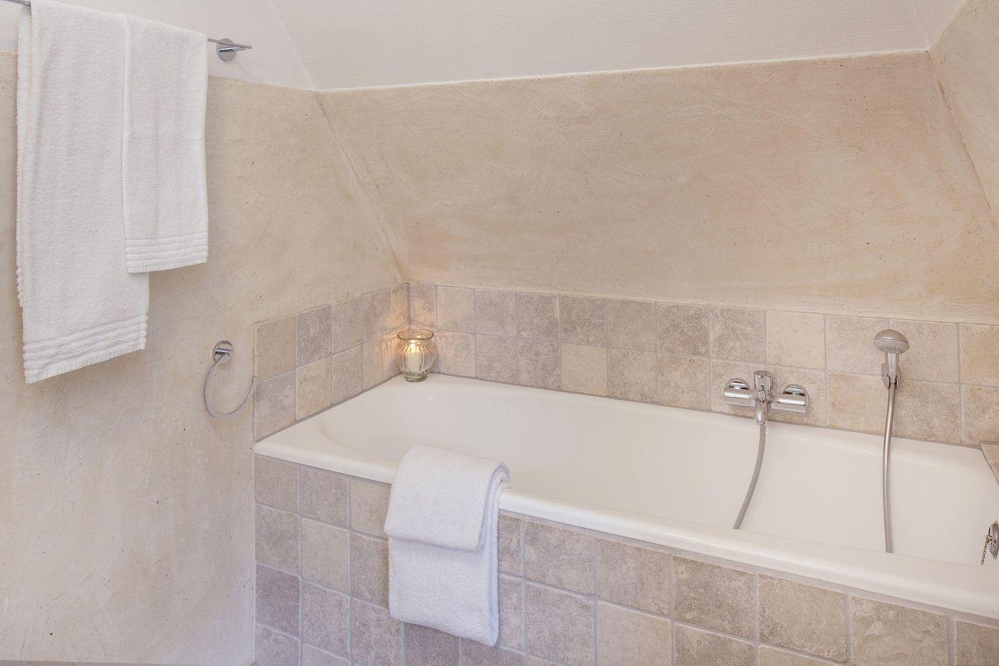 Im ersten Stock liegen drei weitere Schlafräume, jeweils mit Doppelbett und ein Bad mit Badewanne. Eine Waschmaschine steht zur Verfügung.