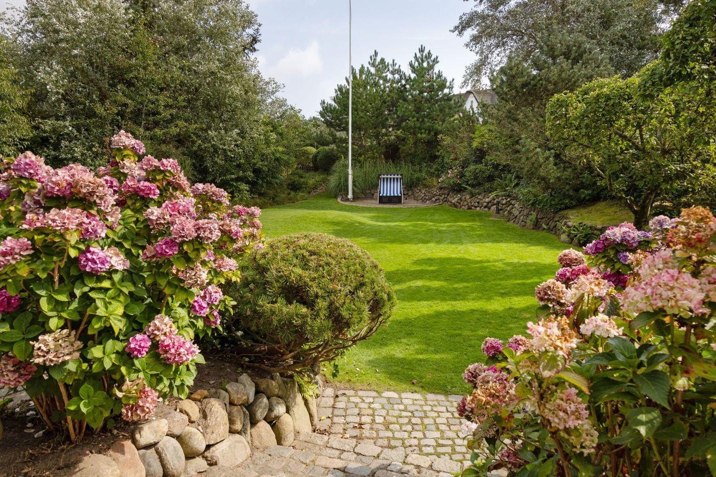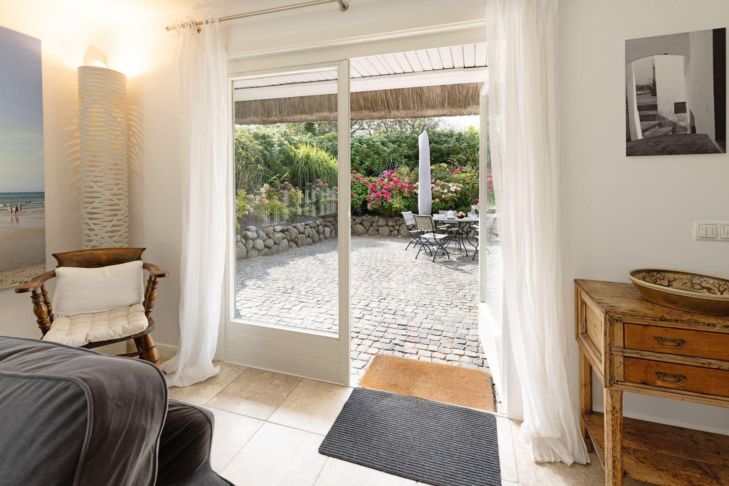 Vom Wohnzimmer aus gelangen Sie in den großen Garten mit Strandkorb, Tischtennisplatte - und Gartenmöbeln. Vom Gartentor aus erreichen Sie den 30 Meter entfernten Oststrand.