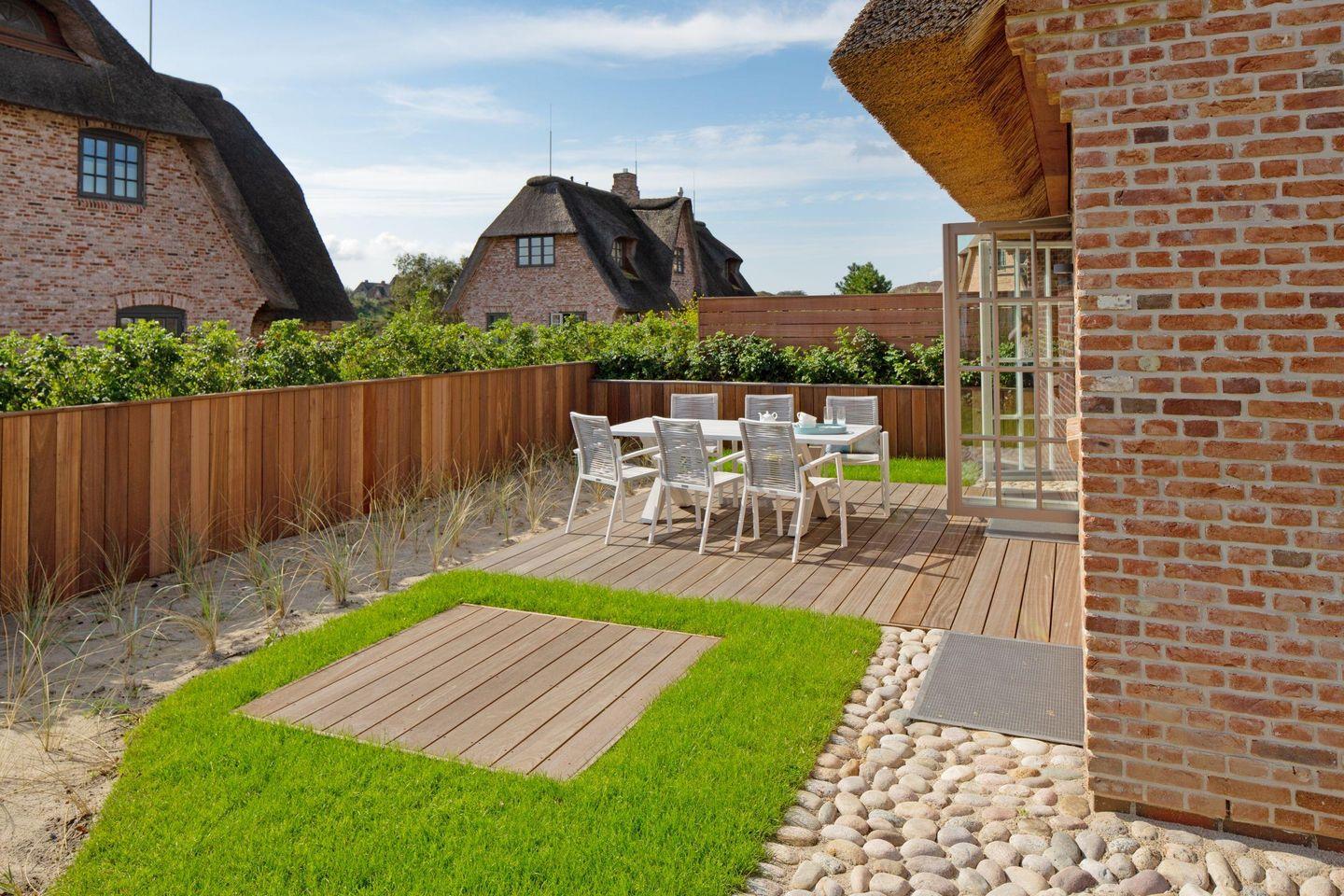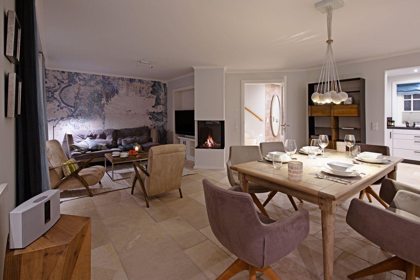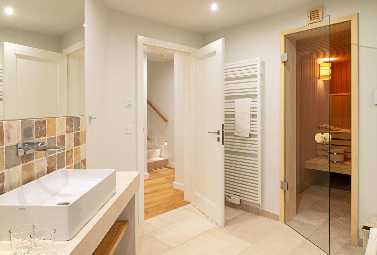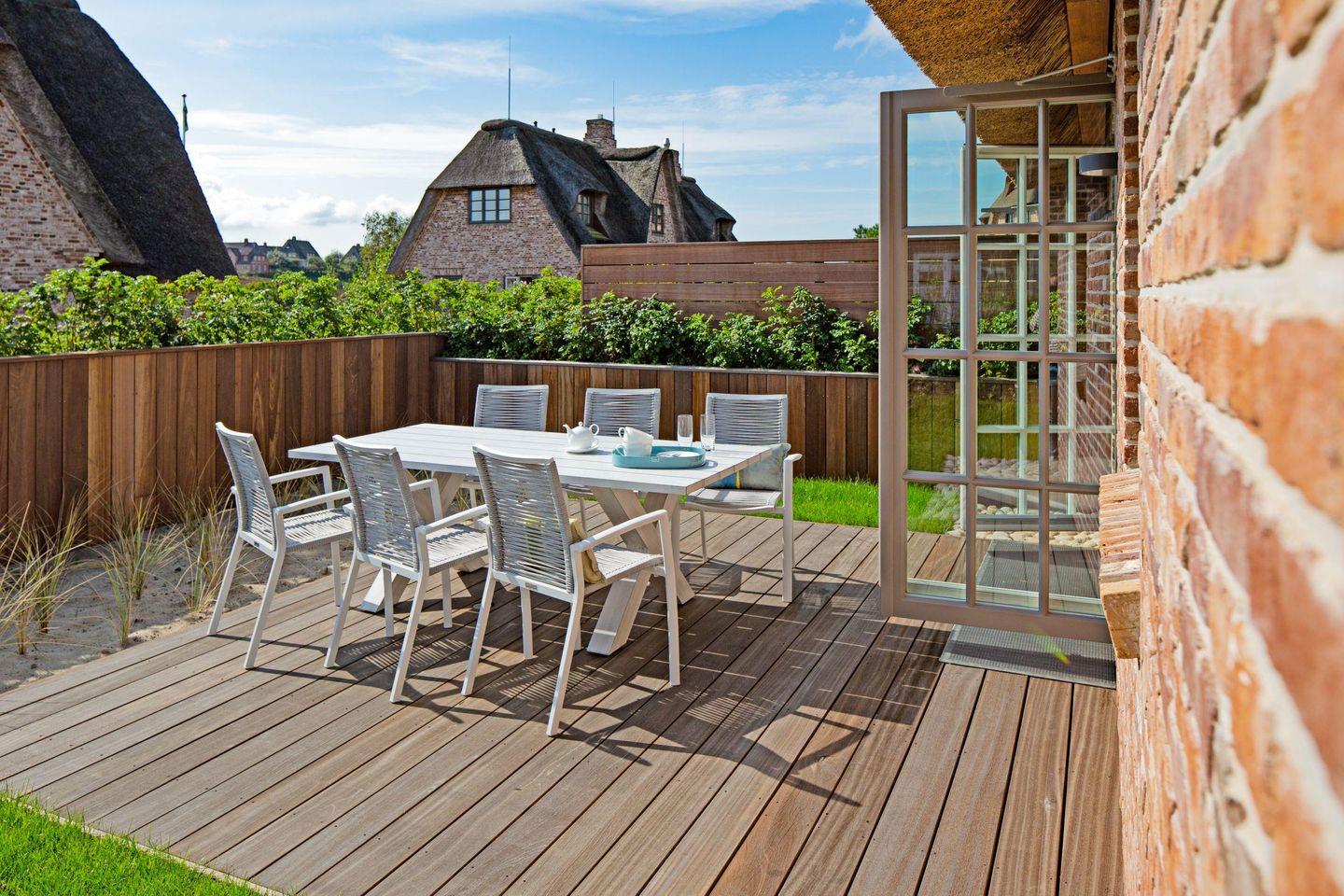 Großzügiges Feriendoppelhaus unter Reet für bis zu sechs Personen mit Saunalandschaft, Gas-Kamin, Garten und Terrasse in Strandnähe.