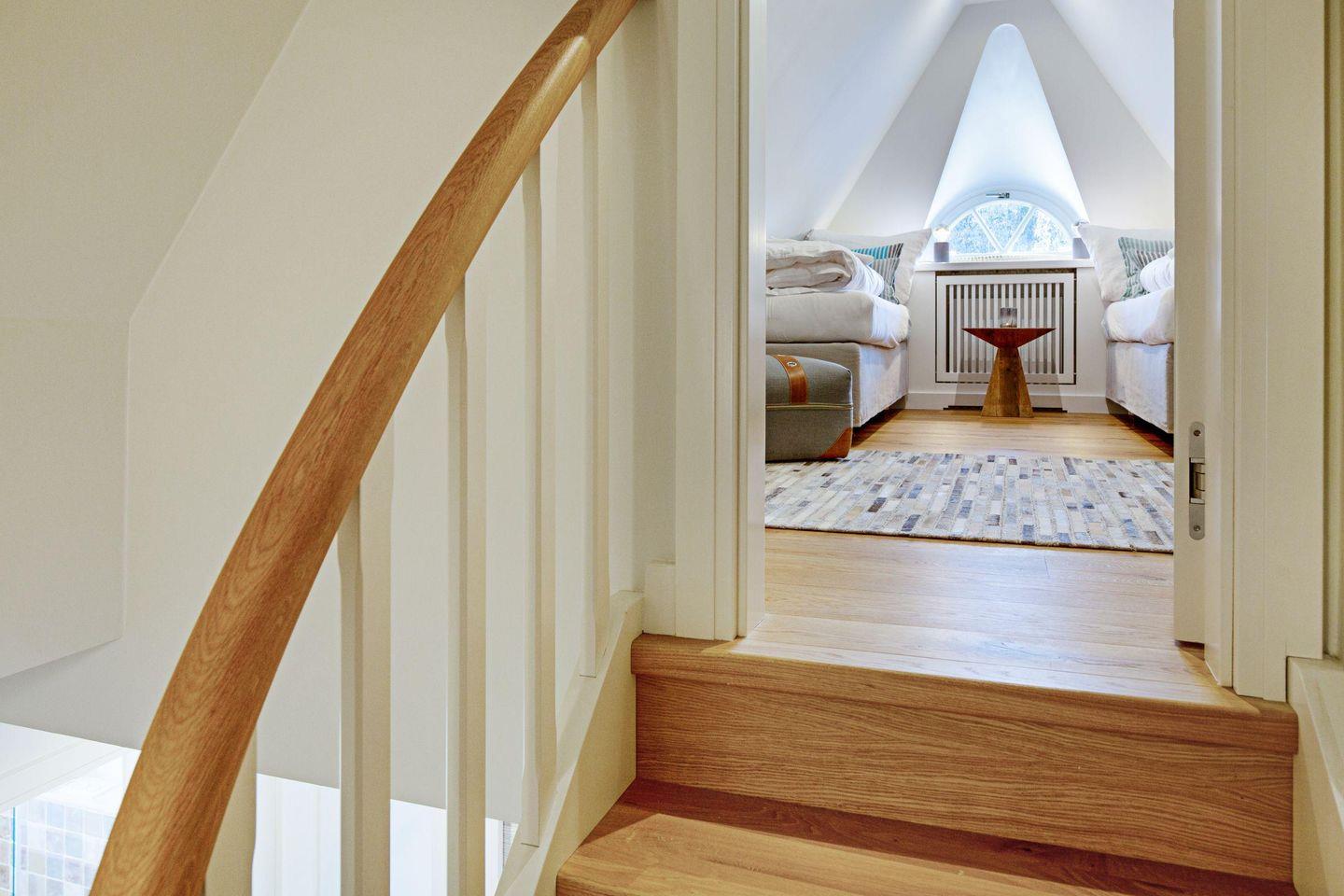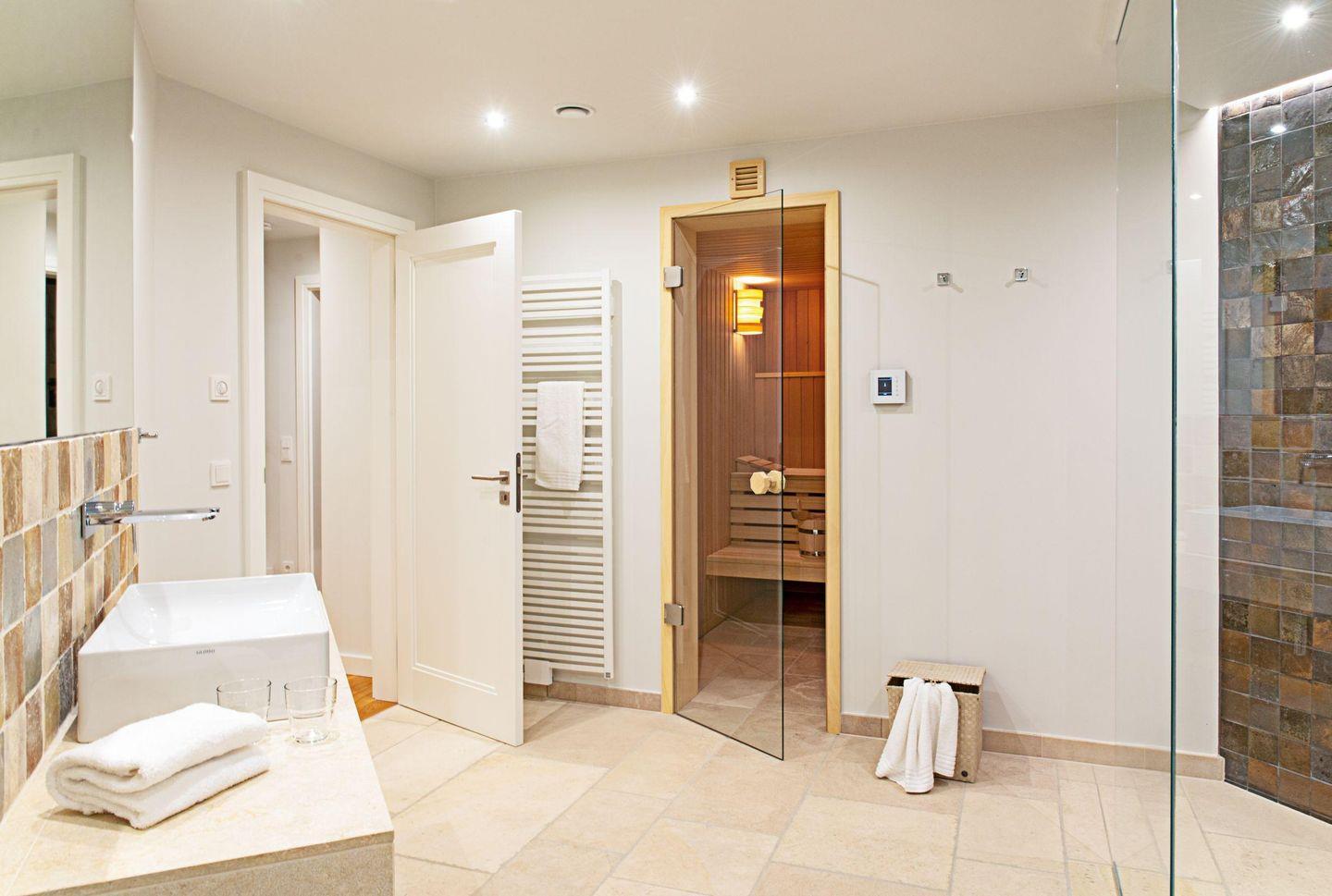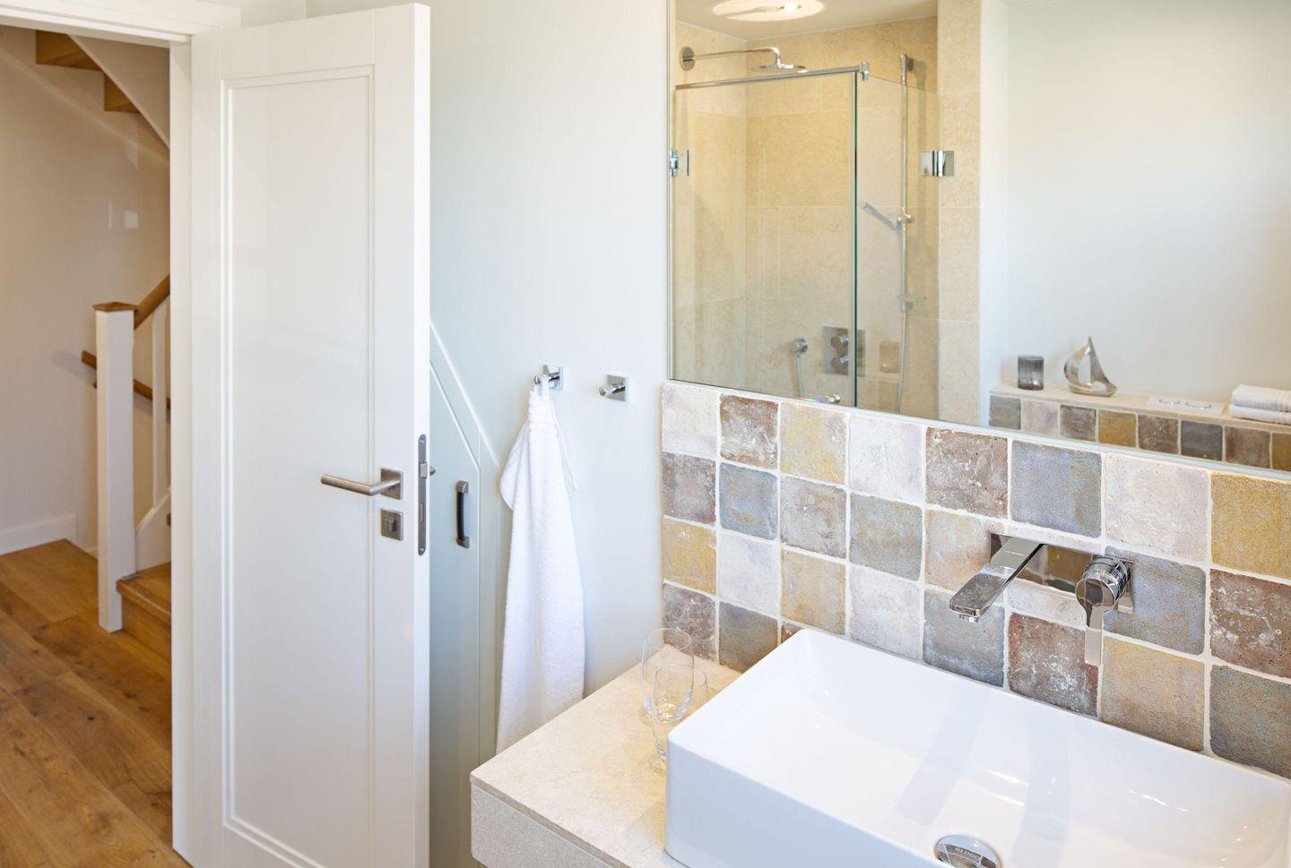 Im Erdgeschoss befinden sich das Wohnzimmer mit Kamin und eine separate Küche. Ein luxuriöses Wellnessbad mit Saunalandschaft und großer Regendusche und ein weiteres Schlafzimmer mit Doppelbett befinden sich im Souterrain. Vom Wohnzimmer aus gelangen Sie in den Garten mit Terrasse. Ein zusätzliches Gäste-WC befindet sich im EG. Ein Parkplatz befindet sich direkt vor dem Haus.