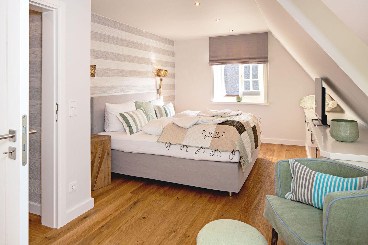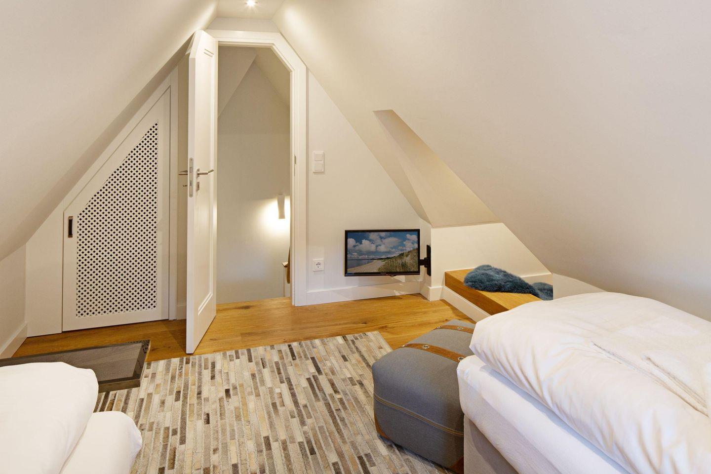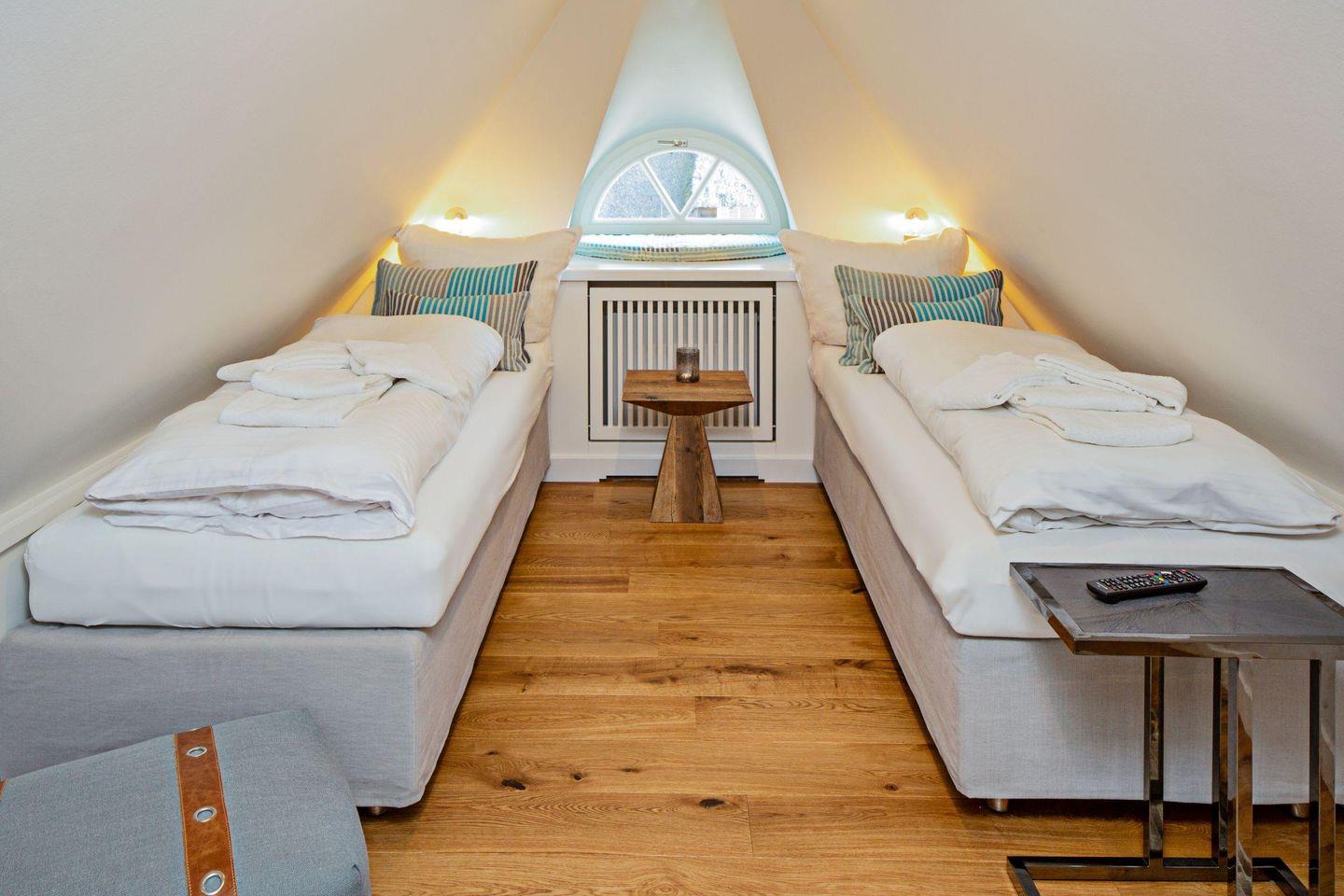 Das Haus ist in den oberen Etagen mit zwei Schlafzimmern – eines mit Doppelbett und eines mit zwei Einzelbetten - sowie einem Badezimmer ausgestattet.