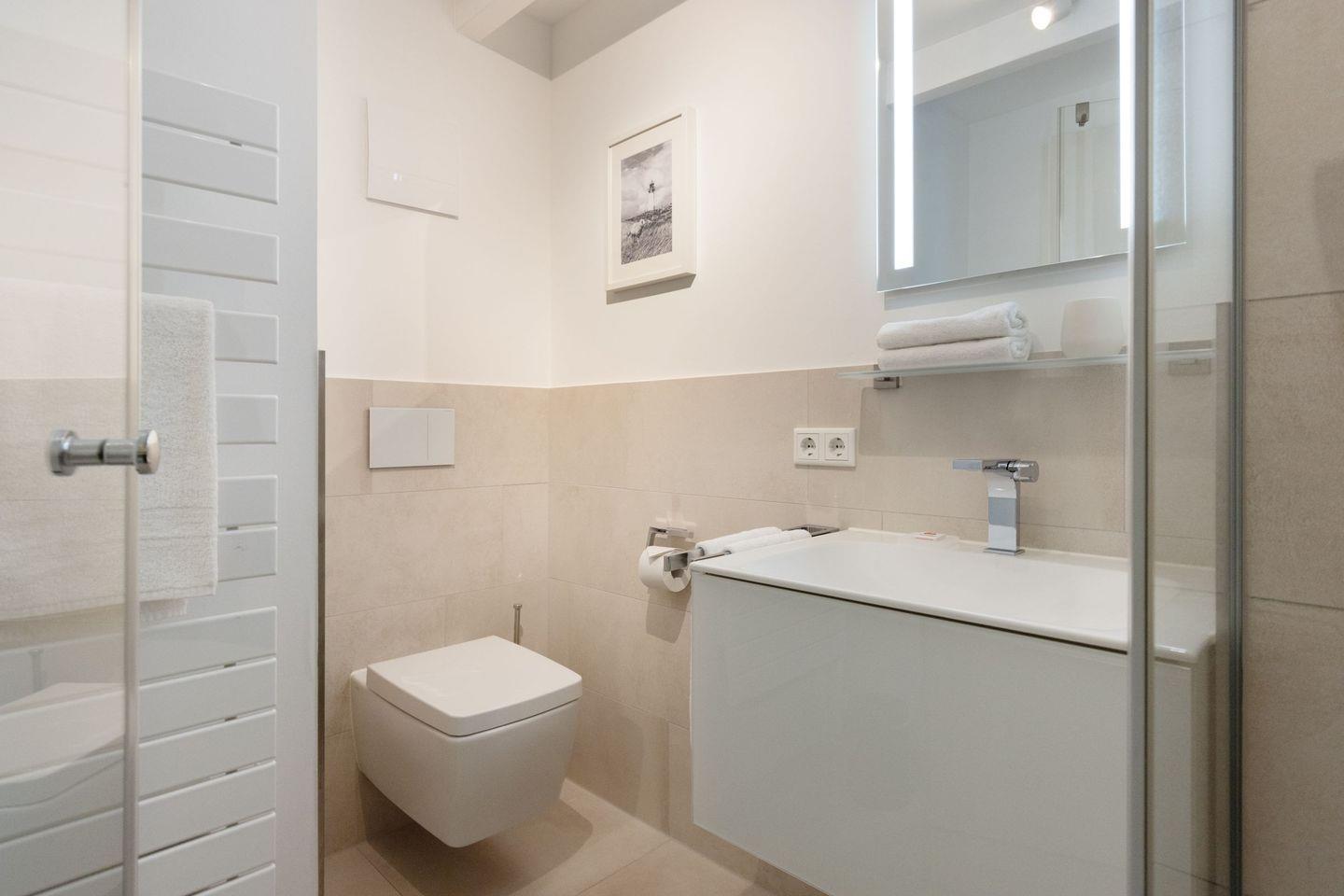 Das Badezimmer mit Regendusche ist modern und freundlich eingerichtet für einen guten Start in den Tag.