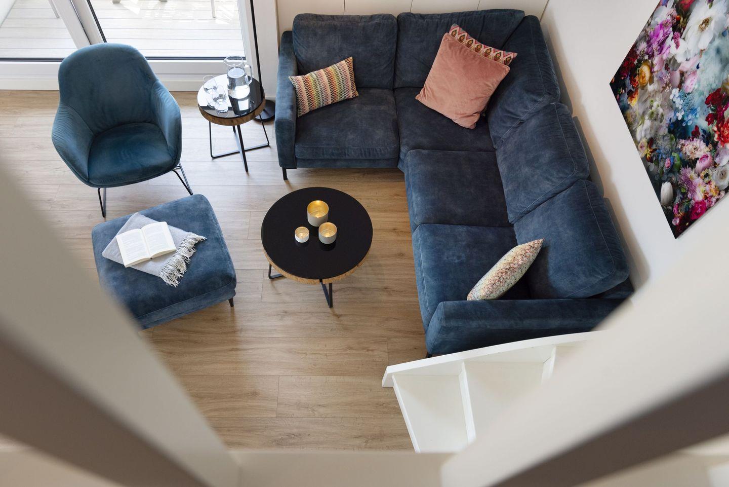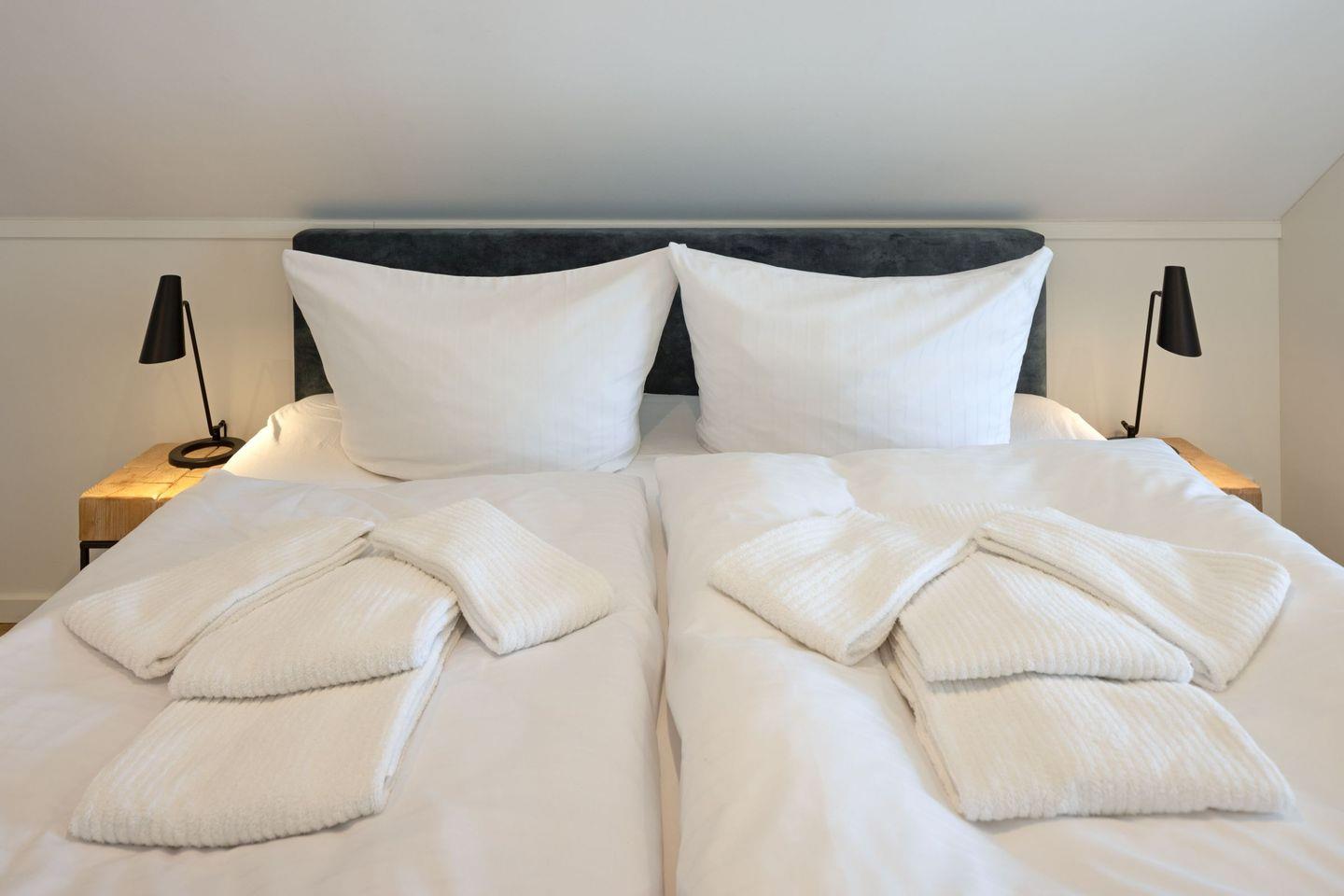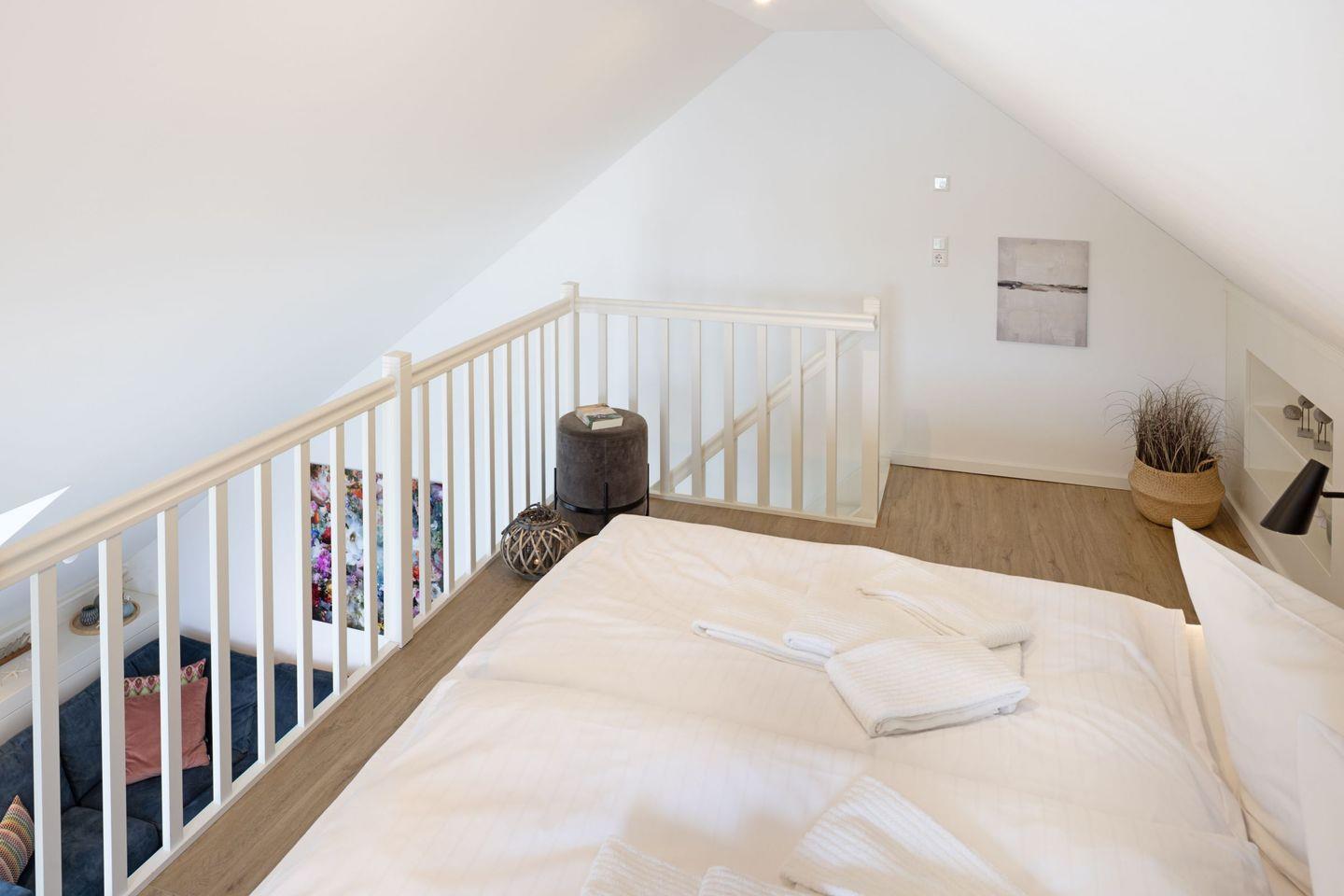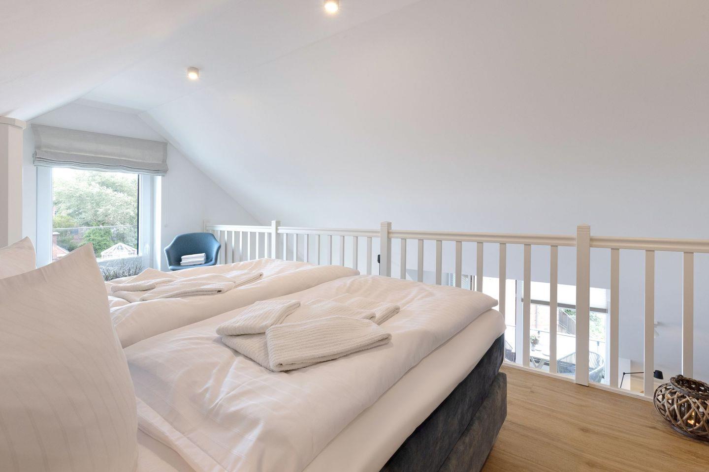 Das Schlafzimmer ist großzügig gestaltet, ausgestattet mit einem Boxspringbett und bietet viel Stauraum sowie ein zweites Smart TV für gemütliche Fernsehabende im Bett. Ein weiteres Schlafzimmer befindet sich in der Galerie des Appartements.
