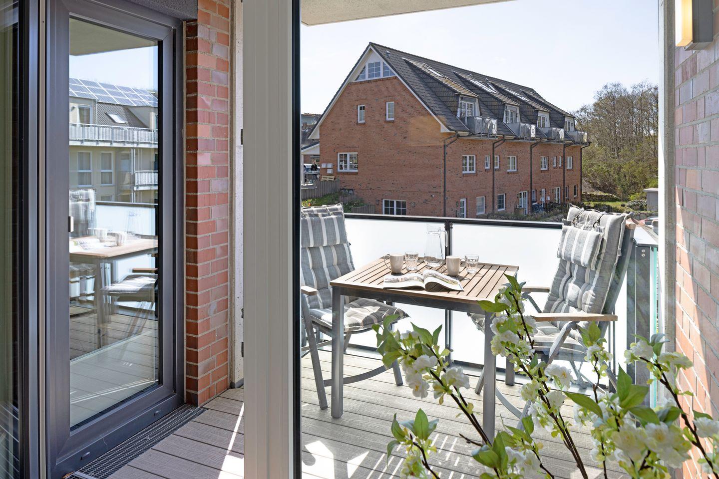 Vom Wohnzimmer gelangen Sie auf den Balkon, der saisonal mit Balkonmöbeln eingerichtet ist und zum Verweilen im Freien einlädt.