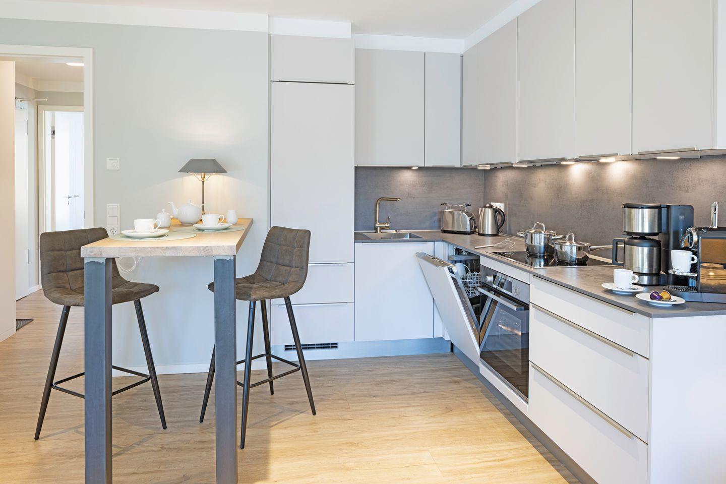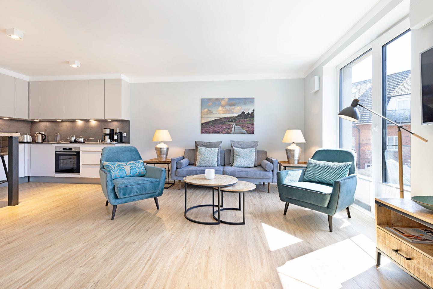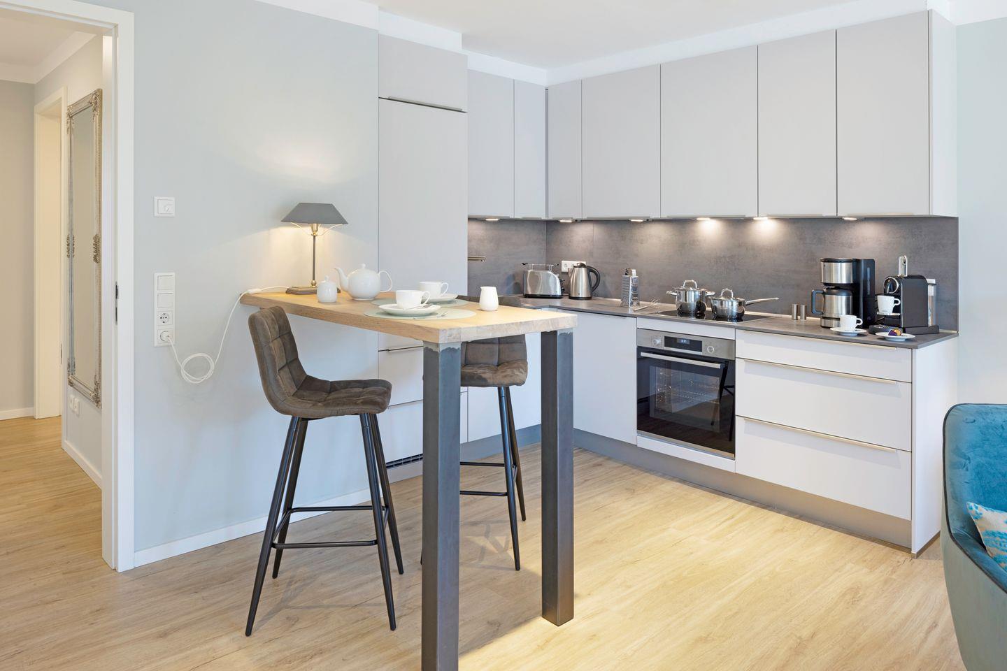 Das helle Wohnzimmer lädt mit einem Sofa, zwei Sesseln und einem Fernseher zum Entspannen ein. Angrenzend befindet sich die moderne offene Küche mit Tresen, ausgestattet mit Nespresso-Maschine, Filterkaffeemaschine, Toaster und Wasserkocher. Direkt neben Küche und Wohnzimmer finden Sie den Essbereich mit einem Tisch und vier Sitzplätzen – perfekt für gemütliche Mahlzeiten.