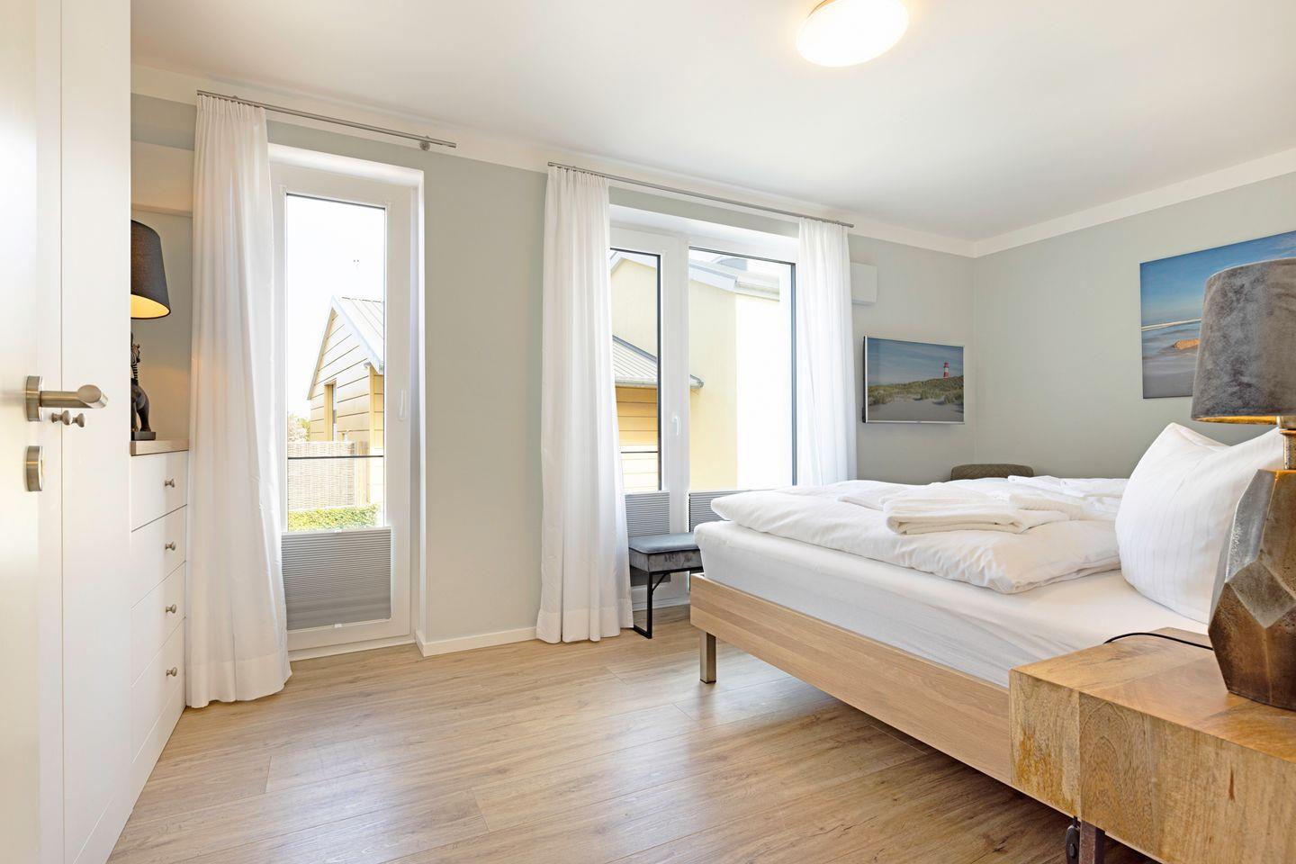 Das große Schlafzimmer verfügt über ein Doppelbett (180 x 200 cm), einen Fernseher, eine Sitzbank, einen großzügigen Kleiderschrank sowie einen Safe.