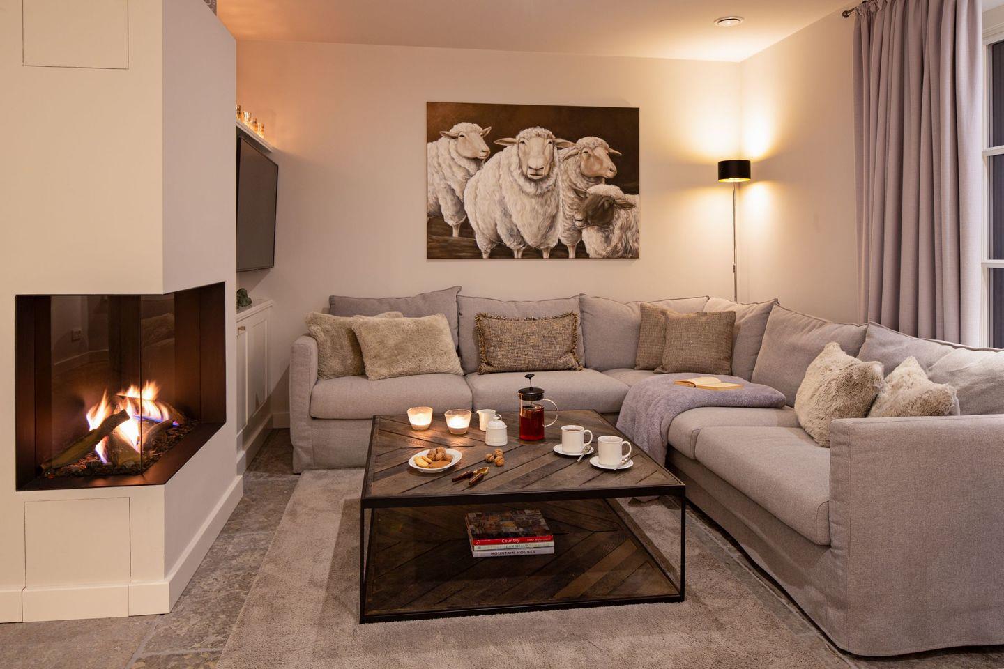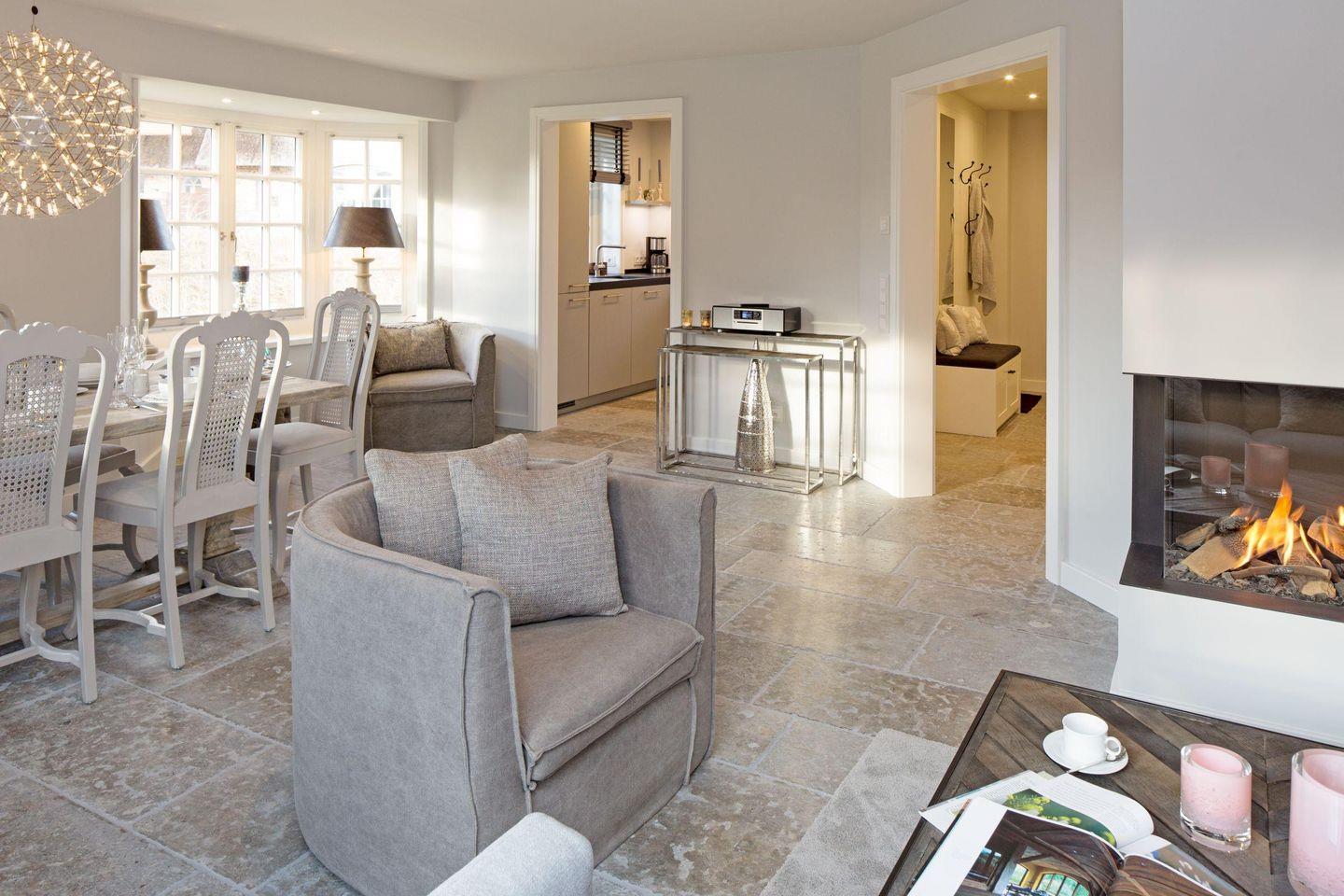 Vom Wohnzimmer mit Kamin und separater Küche aus gelangen Sie in den Garten mit Terrasse.