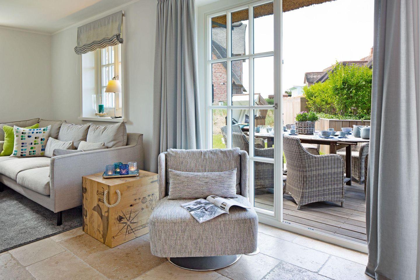 Hochwertig ausgestattetes Feriendoppelhaus unter Reet für bis zu acht Personen mit Saunalandschaft, Gas-Kamin, Garten und Terrasse in Strandnähe.