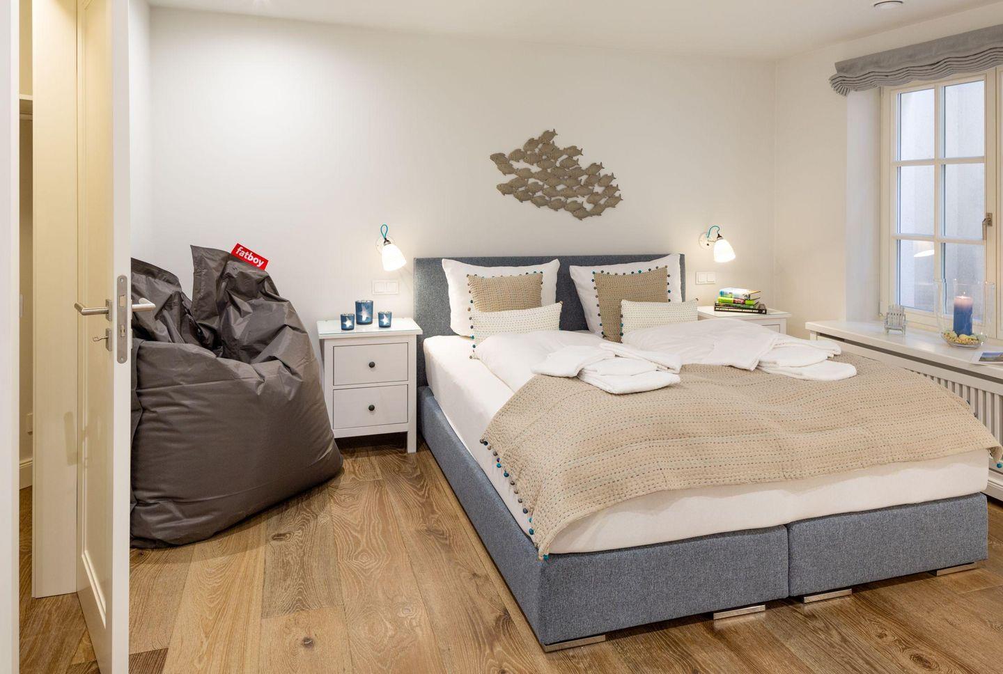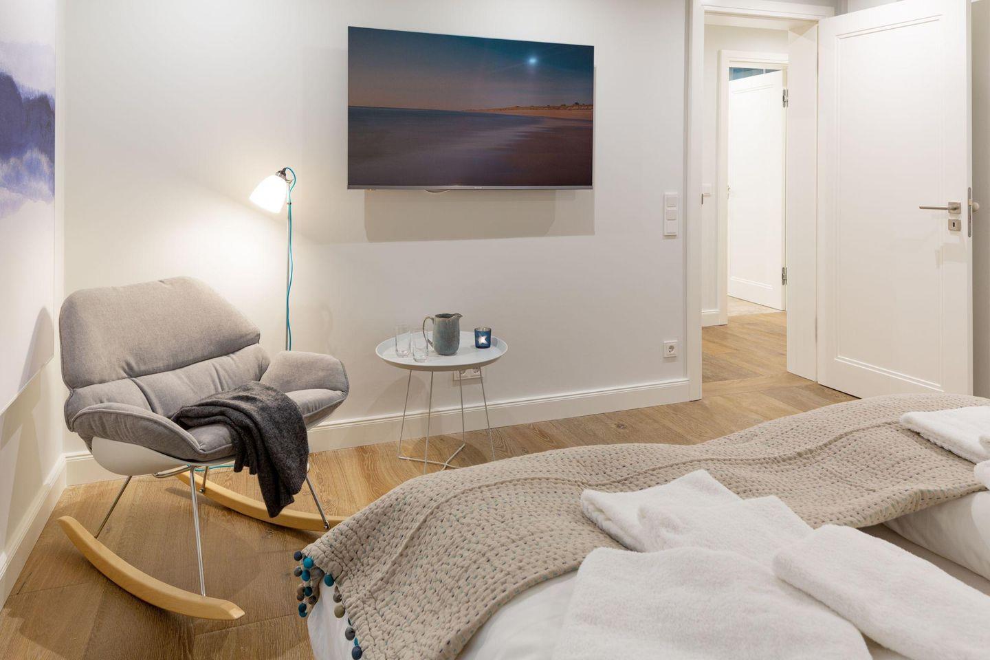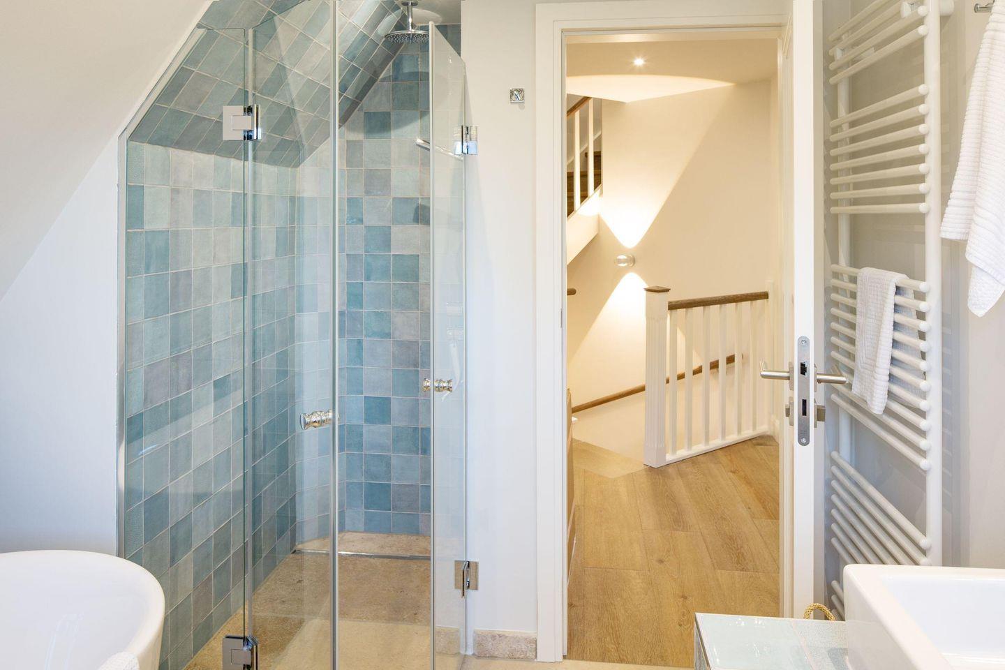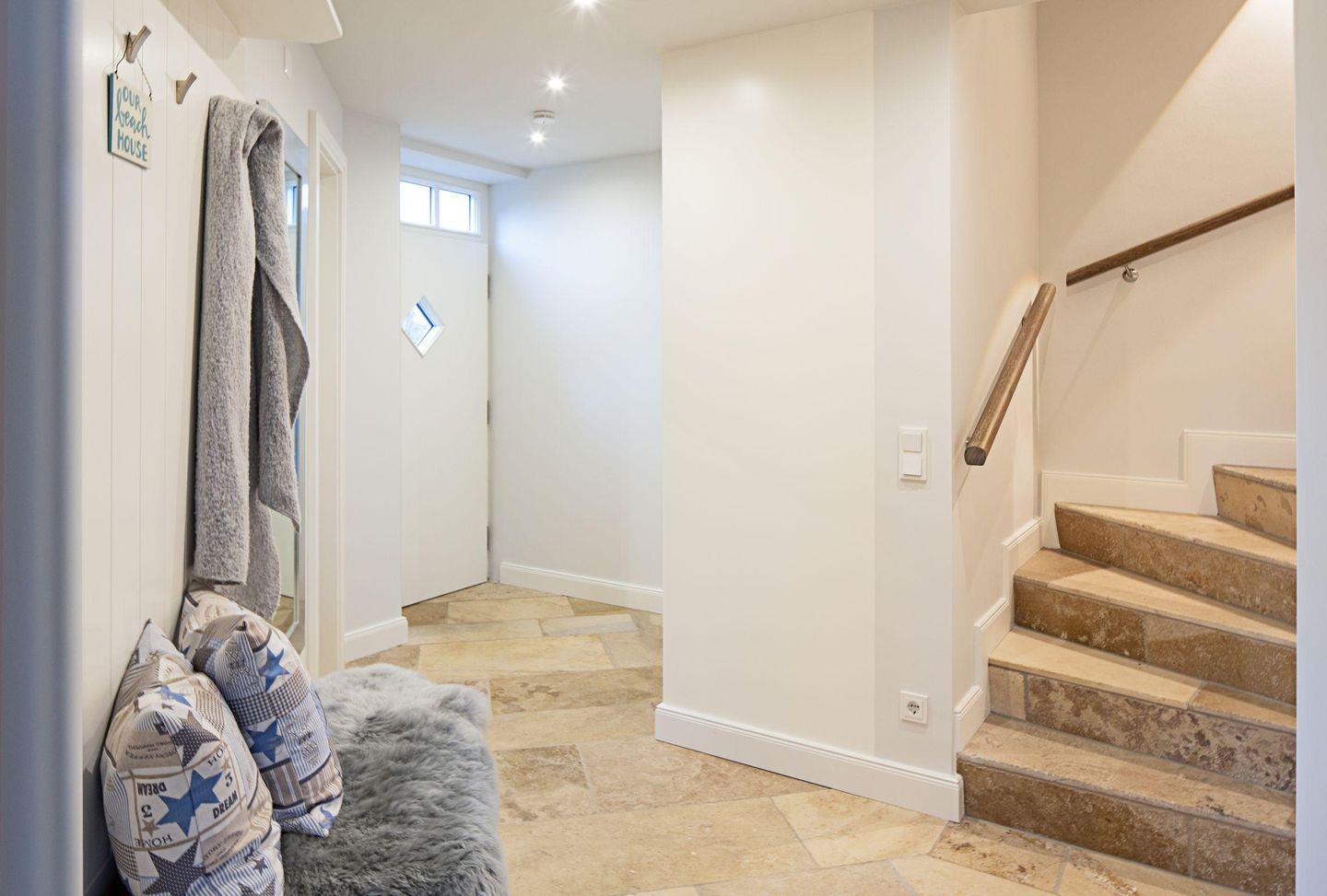 Es gibt eine Sonos-Soundanlage, einen Weinkühlschrank und einen Saunabereich mit Wellnessdusche, der das Wohlbefinden im Haus abrundet. Es stehen Ihnen in der ersten Etage zwei Schlafzimmer mit Boxspring-Doppelbetten ein Gäste-WC und ein Bad mit Badewanne zur Verfügung. Im Souterrain befinden sich ein weiteres Schlafzimmer mit mit Boxspring-Doppelbett und ein SZ mit zwei Einzelbetten, sowie ein weiteres Badezimmer.