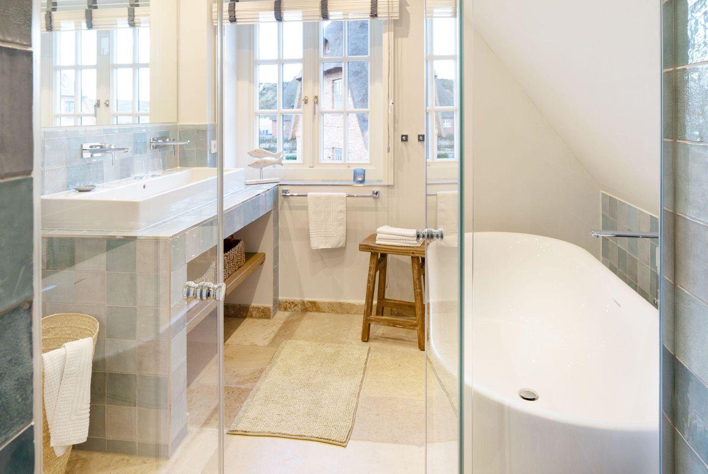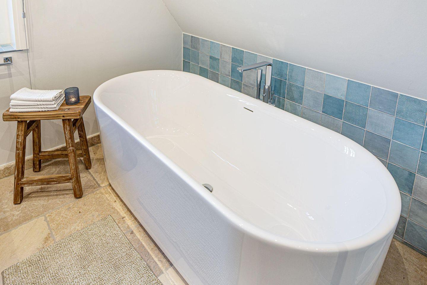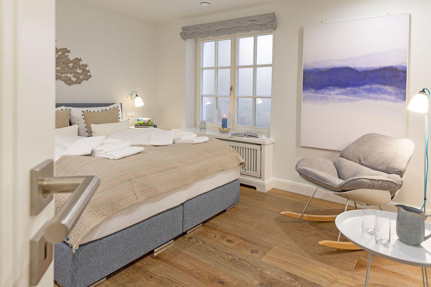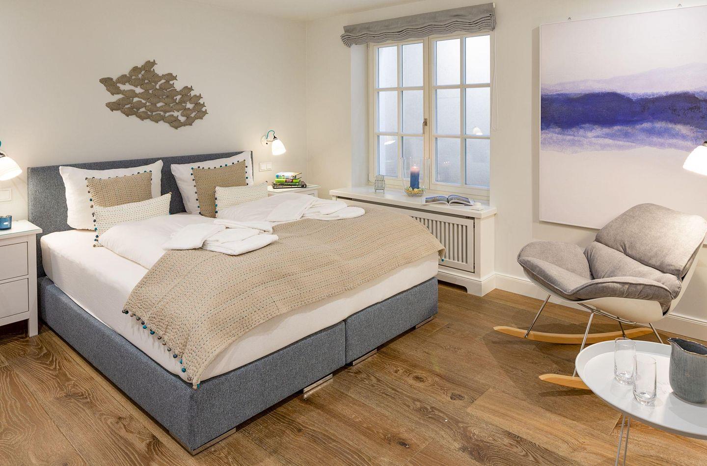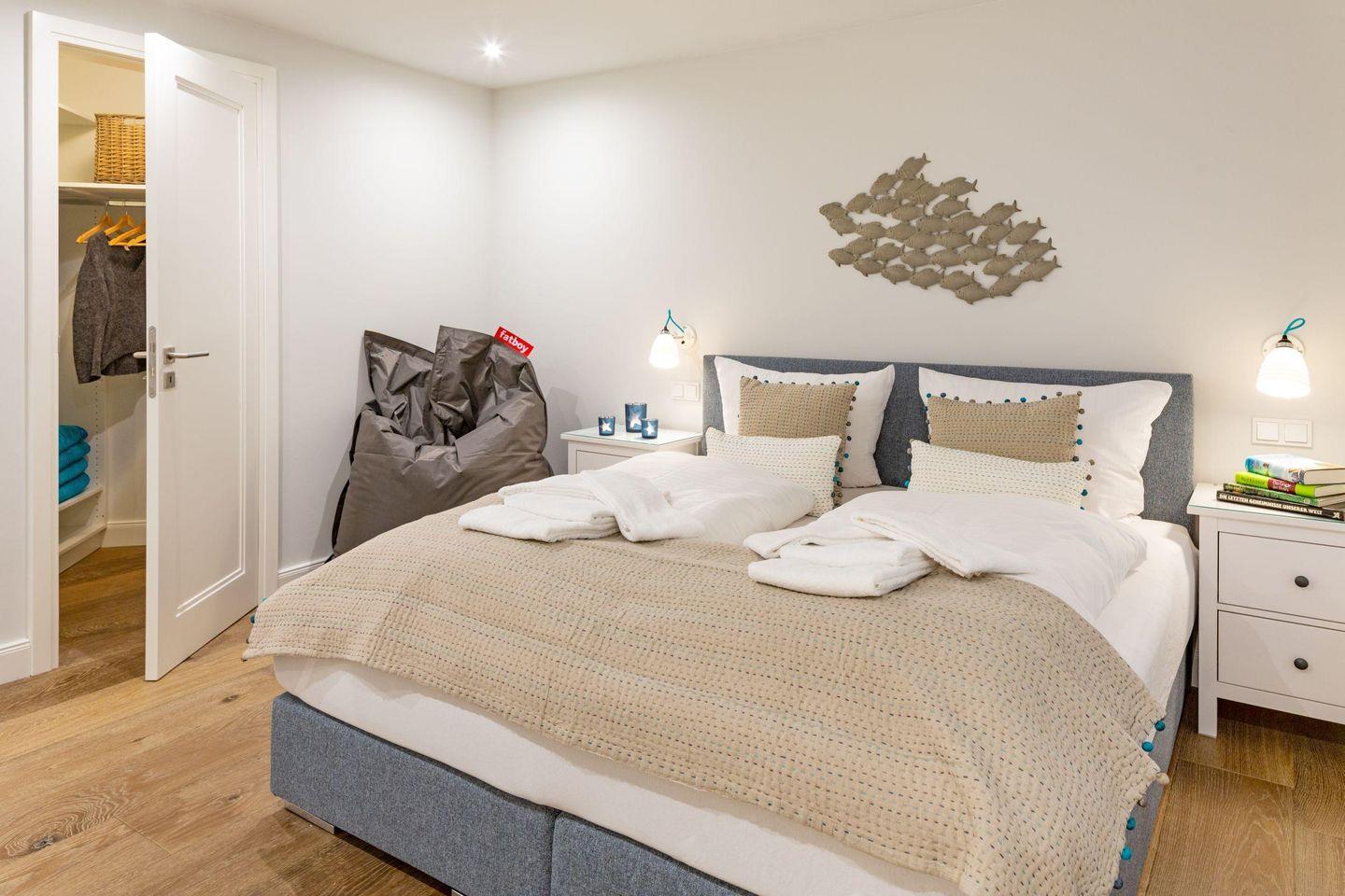Es gibt eine Sonos-Soundanlage, einen Weinkühlschrank und einen Saunabereich mit Wellnessdusche, der das Wohlbefinden im Haus abrundet. Es stehen Ihnen in der ersten Etage zwei Schlafzimmer mit Boxspring-Doppelbetten ein Gäste-WC und ein Bad mit Badewanne zur Verfügung. Im Souterrain befinden sich ein weiteres Schlafzimmer mit mit Boxspring-Doppelbett und ein SZ mit zwei Einzelbetten, sowie ein weiteres Badezimmer.