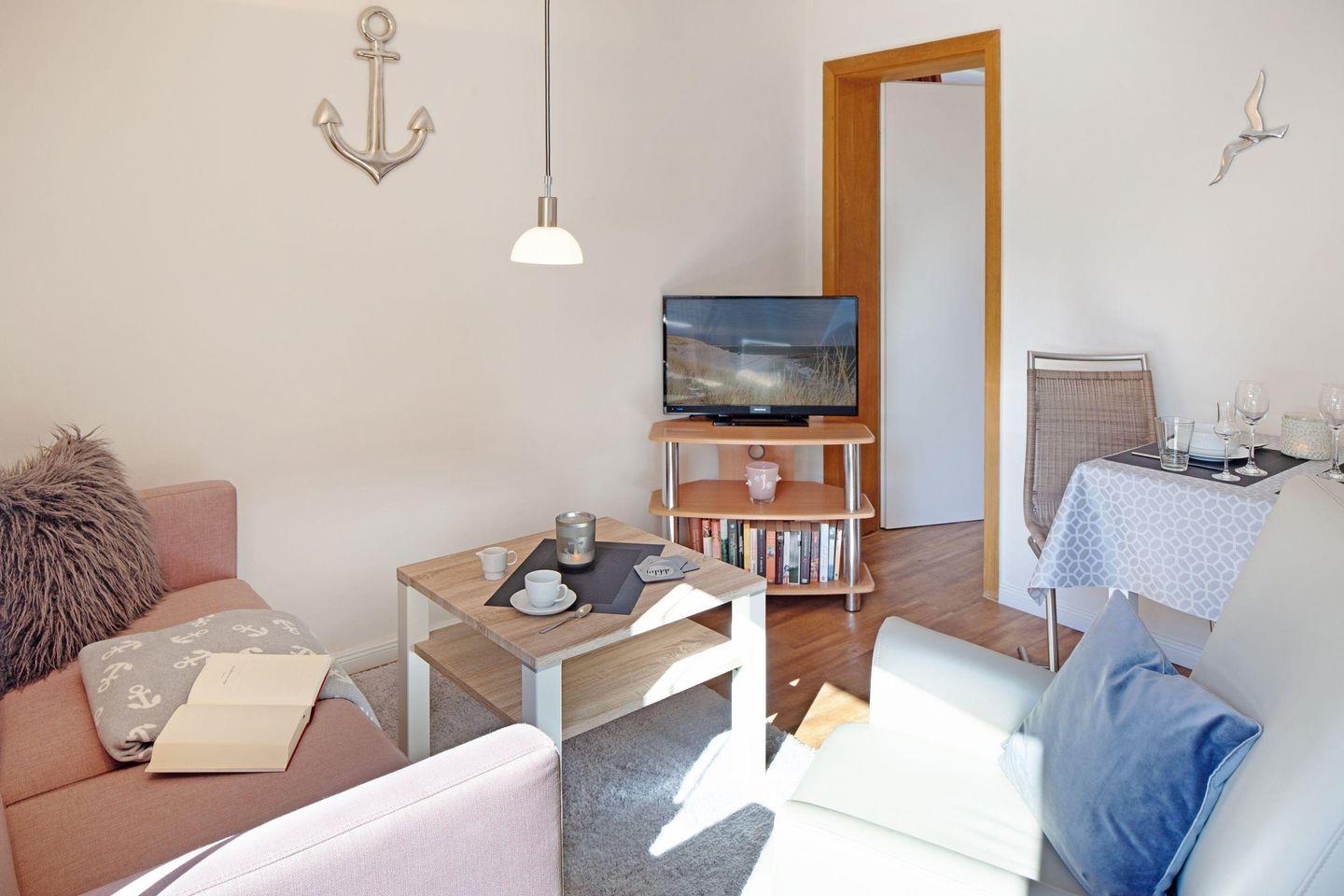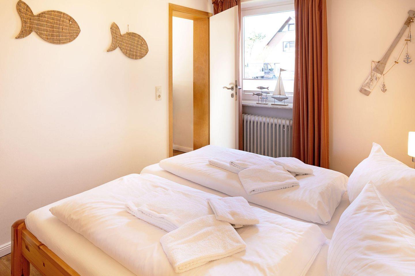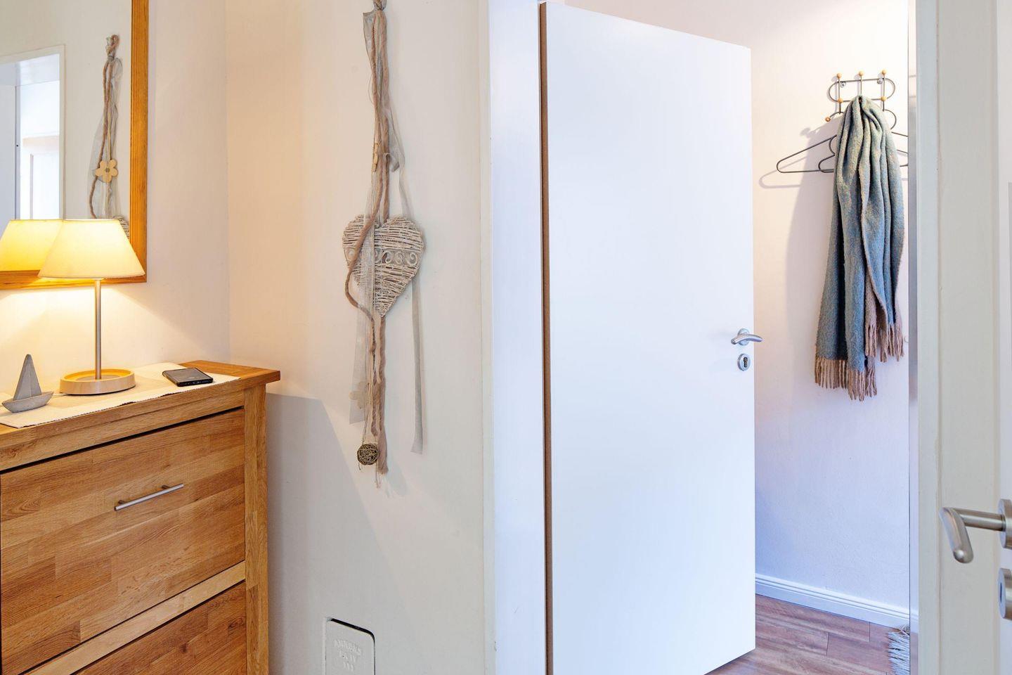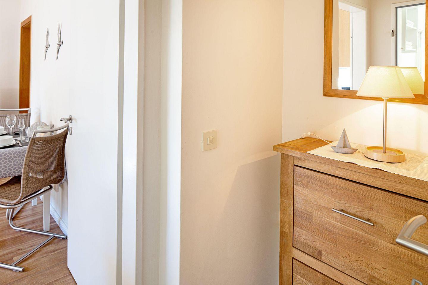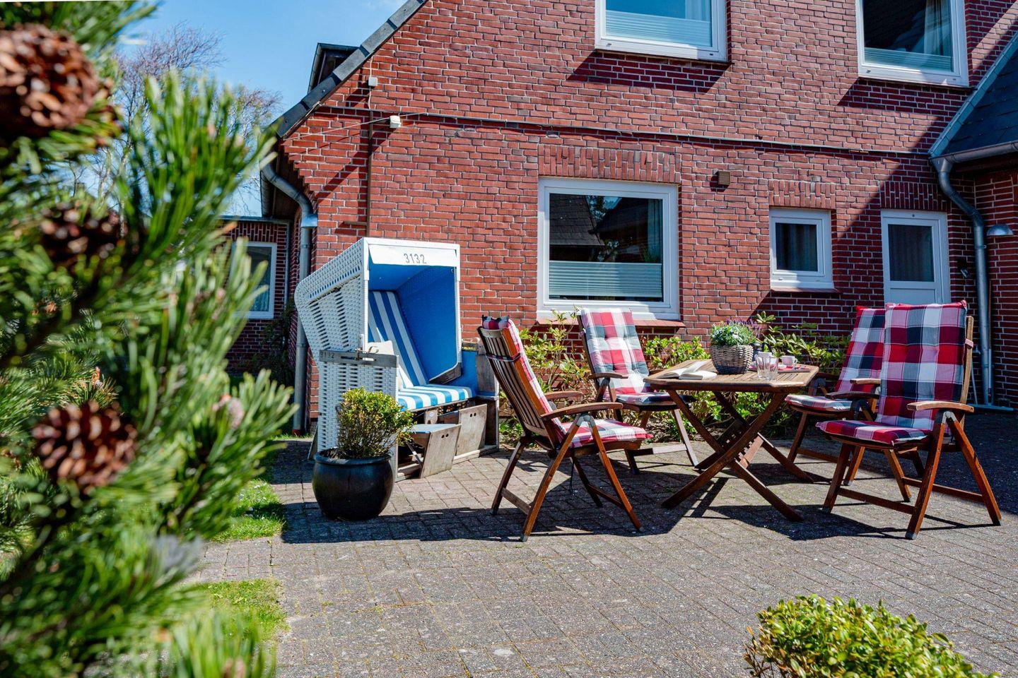 Die Wohnung bietet Ihnen zudem eine Gemeinschaftsterrasse, auf der Sie die frische Meeresluft und die Ruhe der umliegenden Natur erleben können. Gartenmöbel stehen bereit, damit Sie im Freien speisen oder einfach nur relaxen können. Die Liegewiese lädt zum Sonnenbaden ein und bietet Ihnen einen perfekten Rückzugsort nach einem aufregenden Tag auf der Insel.