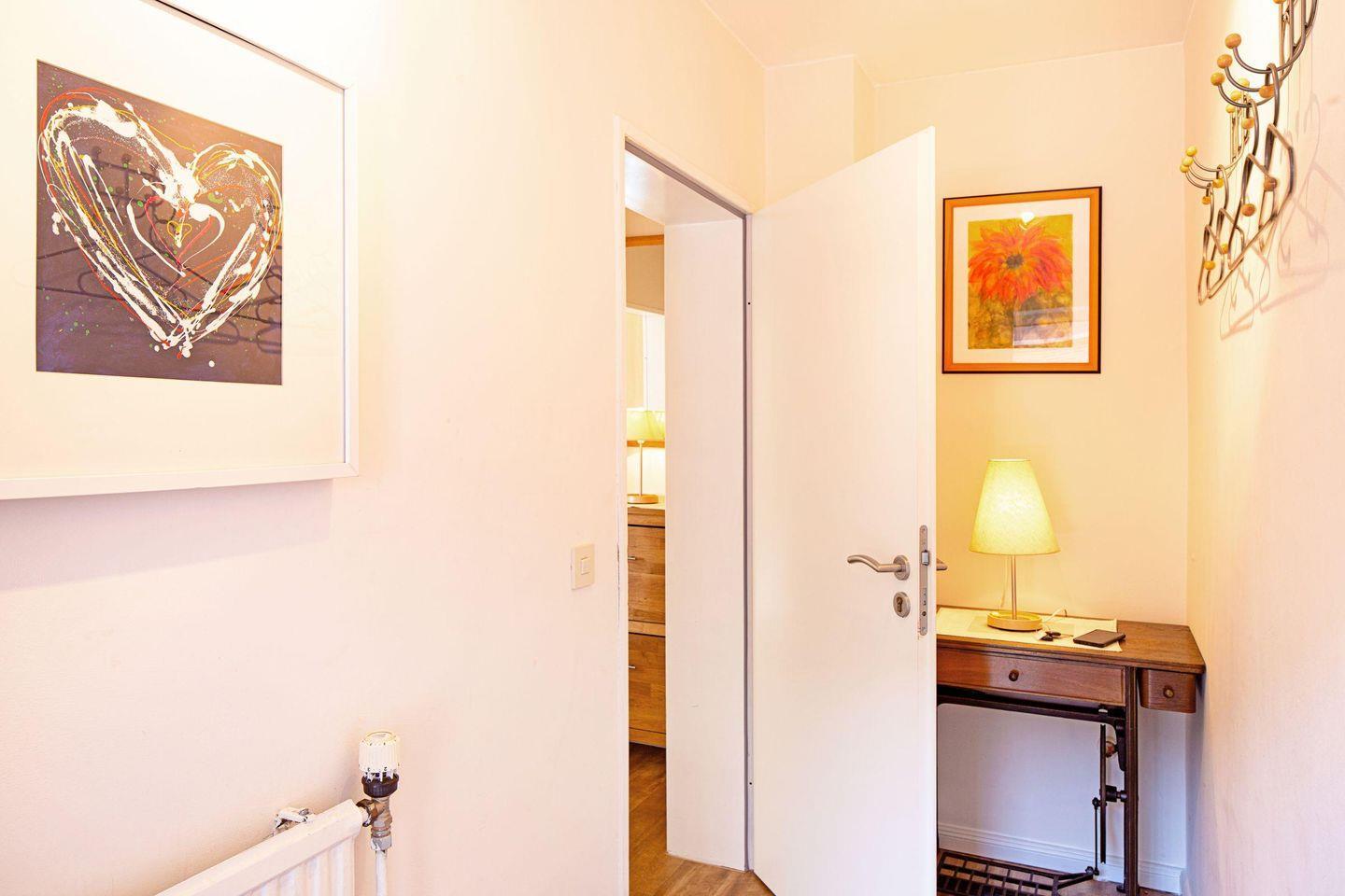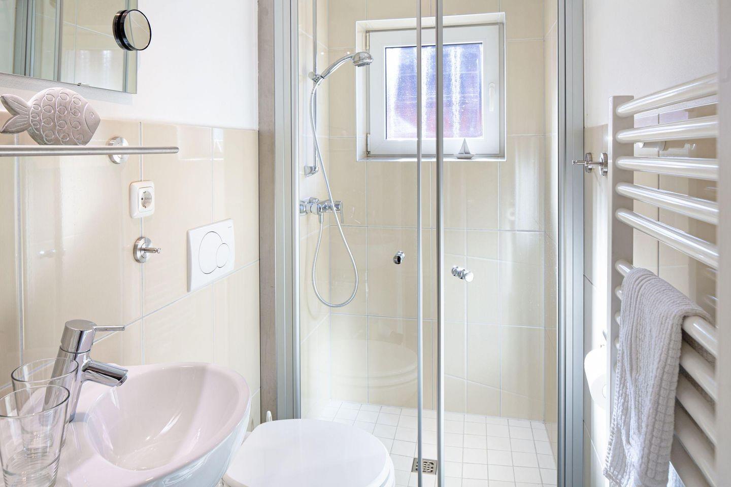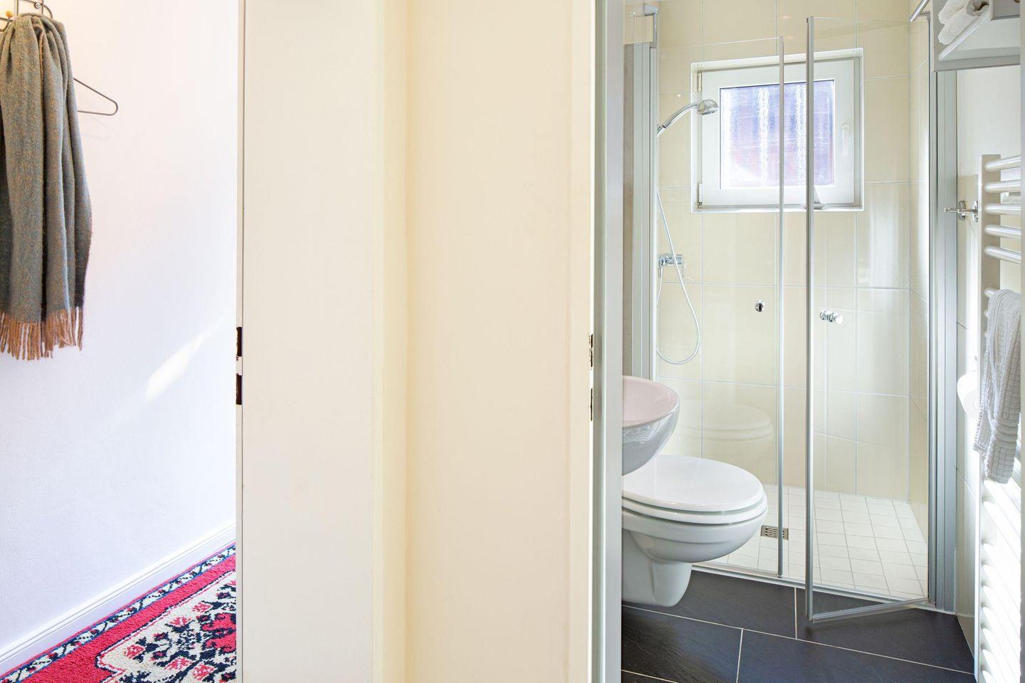 Das Badezimmer ist mit einer bodengleichen Dusche, einem Waschbecken und WC ausgestattet. Hochwertige Handtücher sind bereits für Sie bereitgelegt, ebenso wie ein Haartrockner. Es wird eine Erstausstattung mit wichtigen Utensilien bereitgestellt, sodass Sie sich direkt wohlfühlen werden.