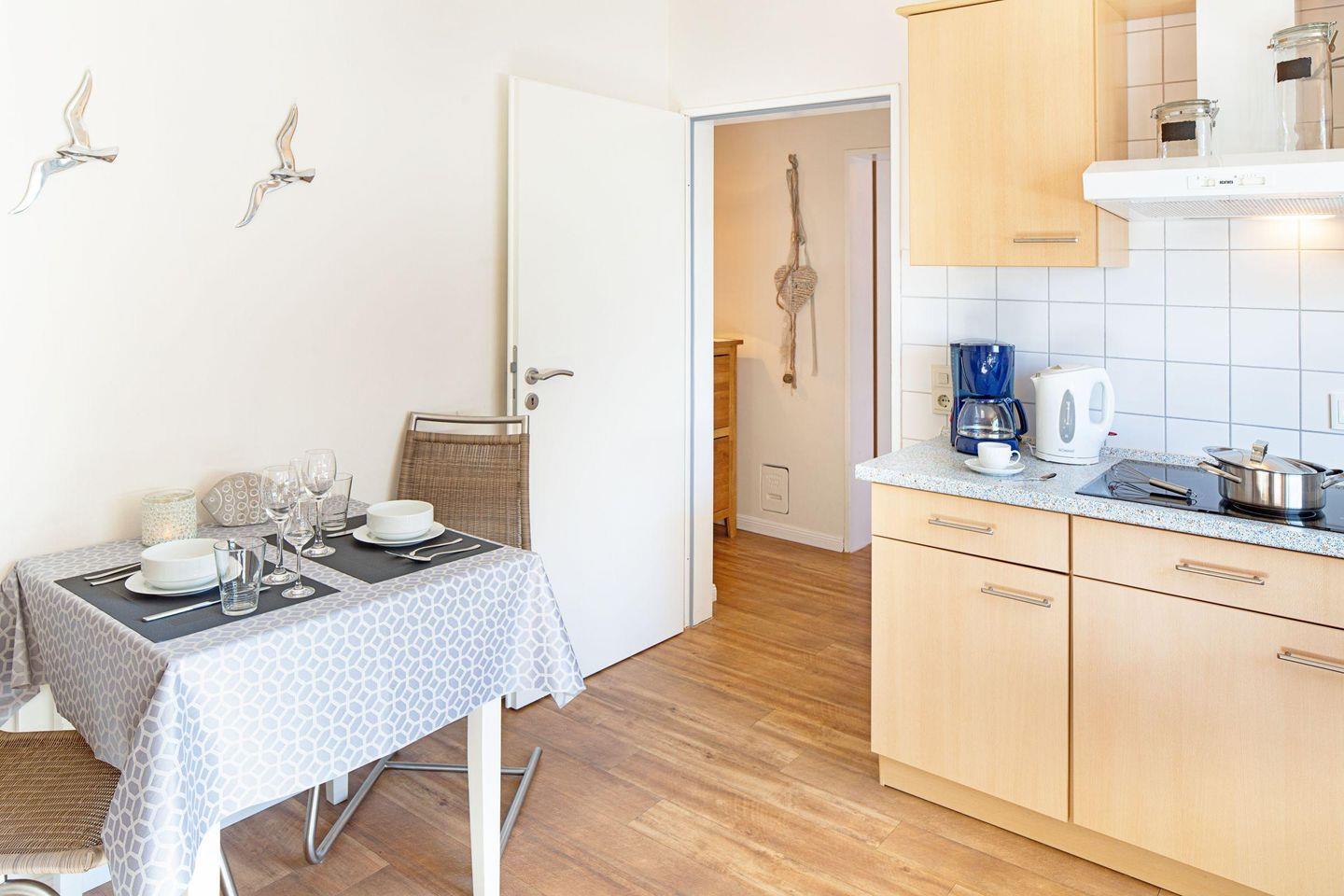 Die Ferienwohnung befindet sich im Erdgeschoss und verfügt über eine liebevoll gestaltete Kochnische, die mit modernen Küchengeräten wie einem Ceran-Herd, Kühlschrank inklusive Gefrierfach sowie einer Nespresso-Maschine ausgestattet ist. Hier können Sie Ihre Lieblingsgerichte zubereiten und dabei die frische Sylt-Atmosphäre genießen. Im angrenzenden Essbereich lässt sich das Frühstück mit Blick in den Garten besonders gut genießen.