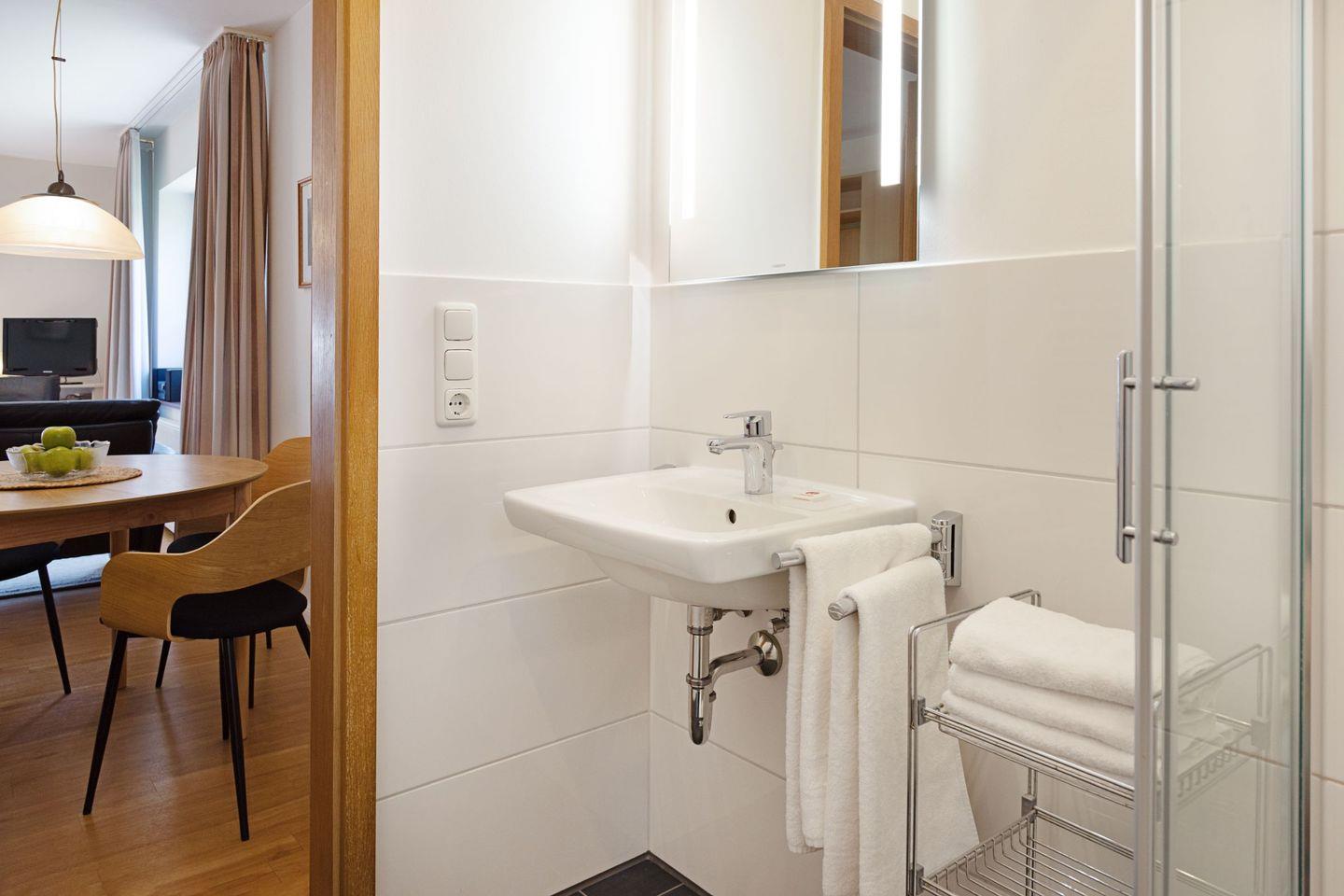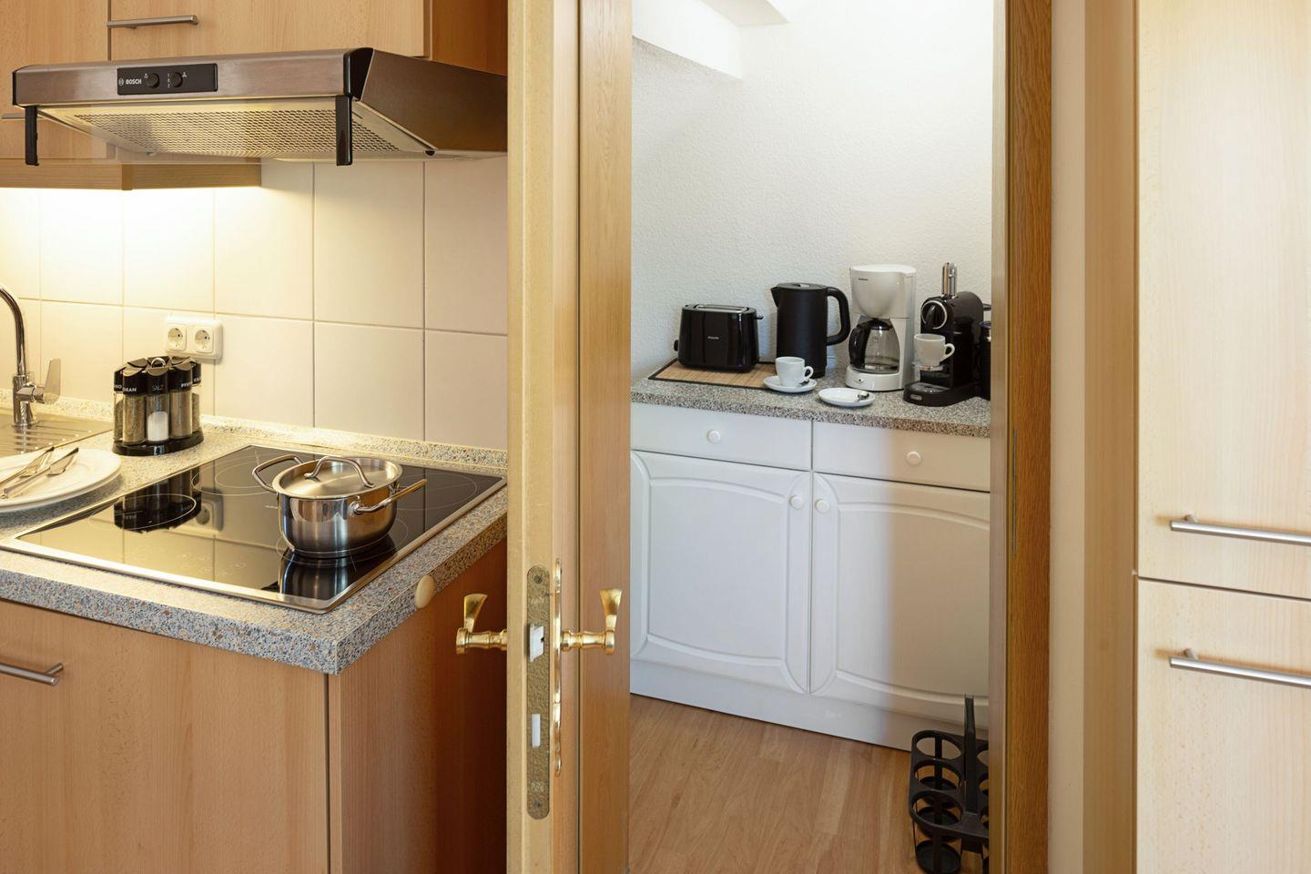 Die modern eingerichtete Ferienwohnung für zwei Personen hat einen kombinierten Wohn-Schlafraum mit einem Doppelbett und einer Couchgarnitur sowie eine Küchenzeile und ein Duschbad.