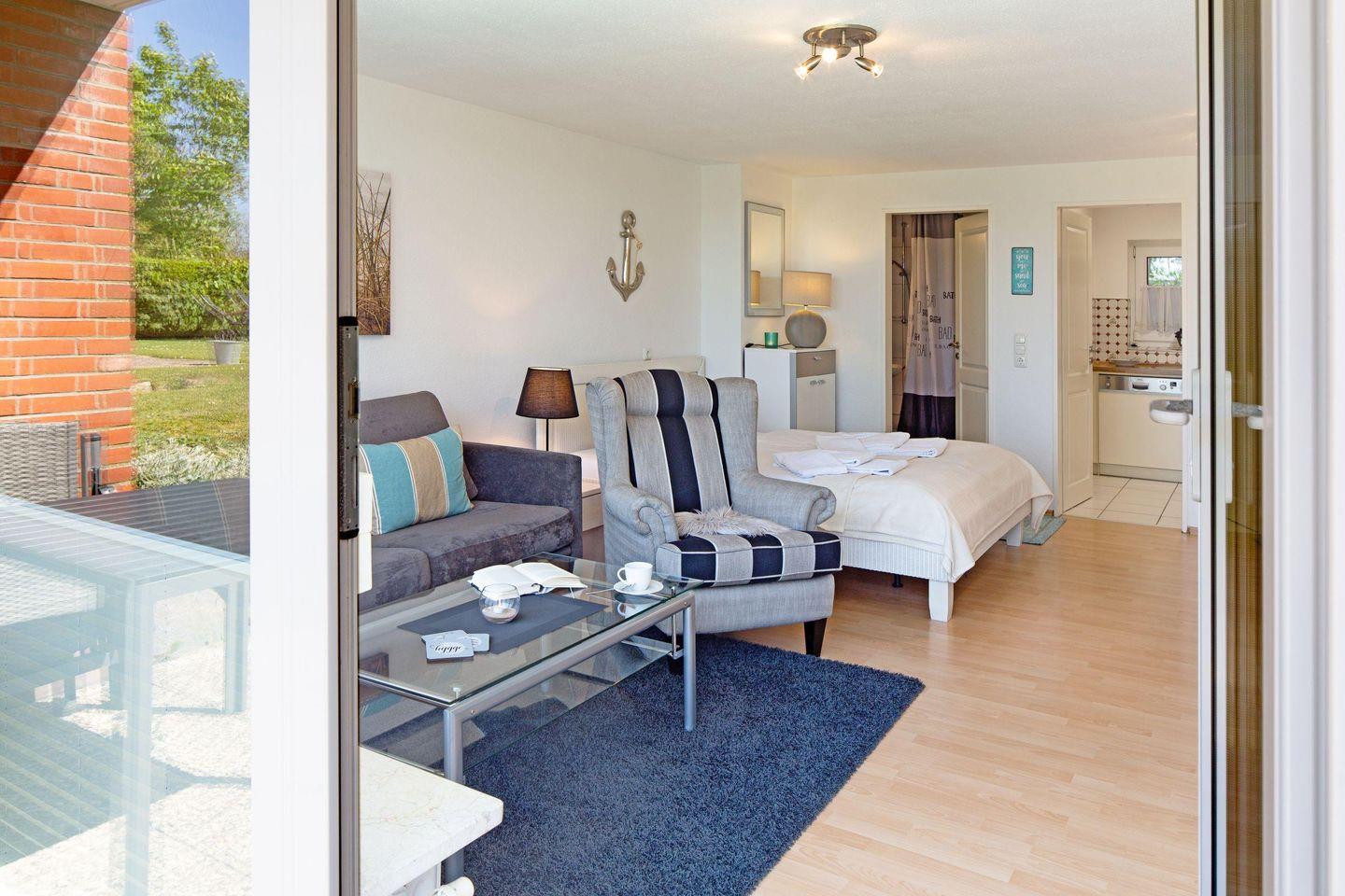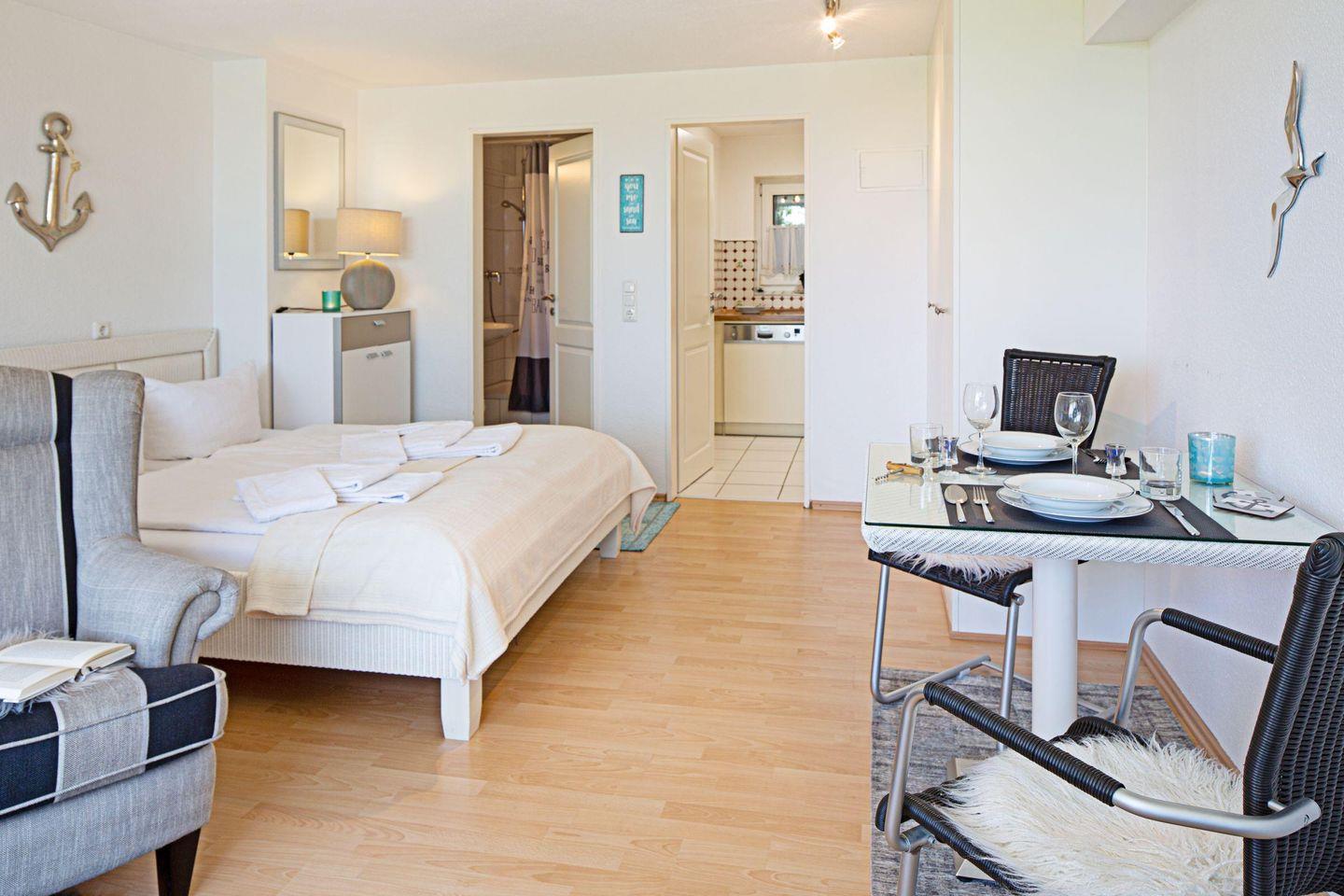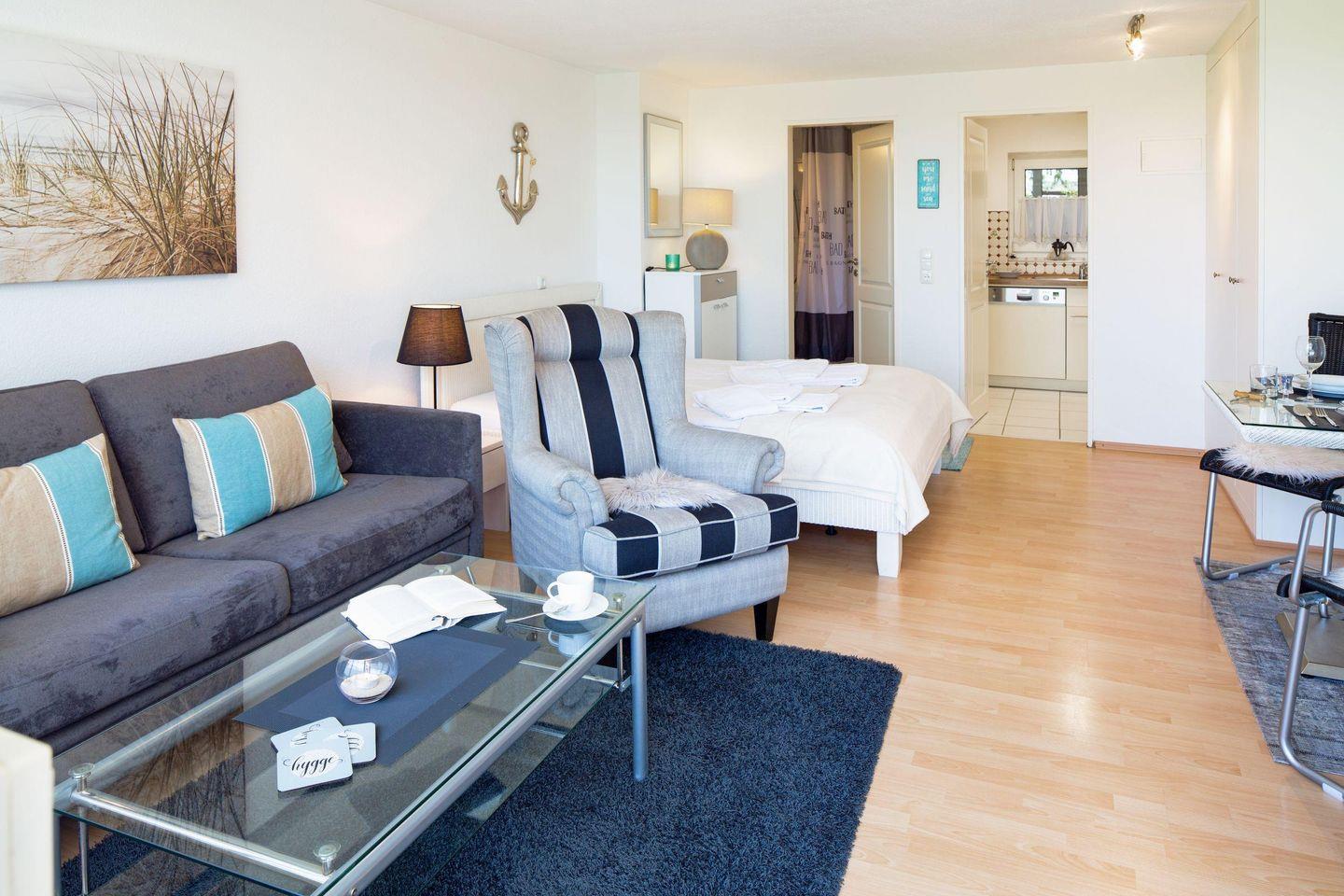 Das große und helle Wohnzimmer lädt zum Verweilen ein und bietet eine einladende Sofaecke, einen Essbereich, um gemeinsame Mahlzeiten zu genießen sowie einen kombinierten Wohn/Schlafraum. Für Ihre Unterhaltung steht Ihnen ein Fernseher sowie eine HiFi-Anlage zur Verfügung. Das offene Küchenkonzept bietet alles, was Sie zum Kochen benötigen – vom Cerankochfeld über einen Geschirrspüler bis hin zu einem Wasserkocher und einer Kaffeemaschine.