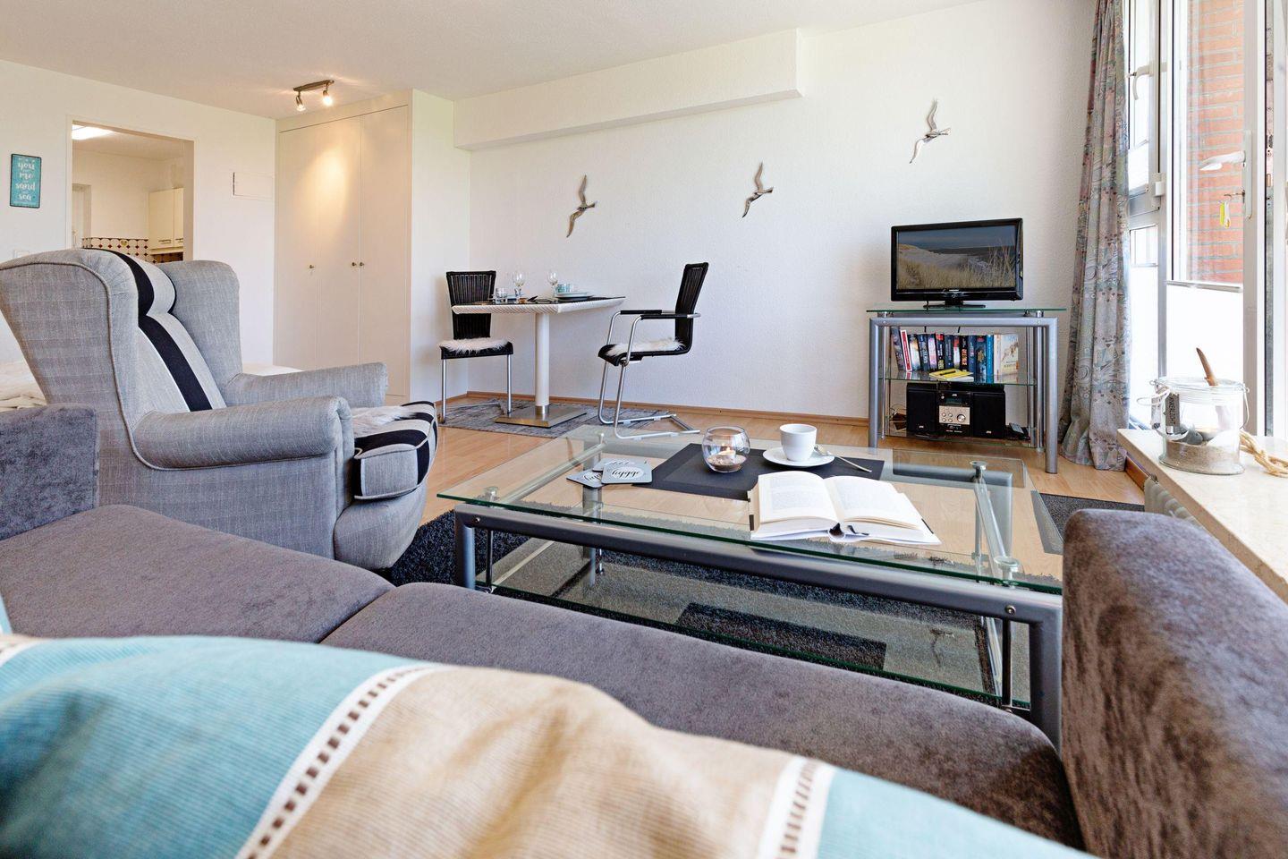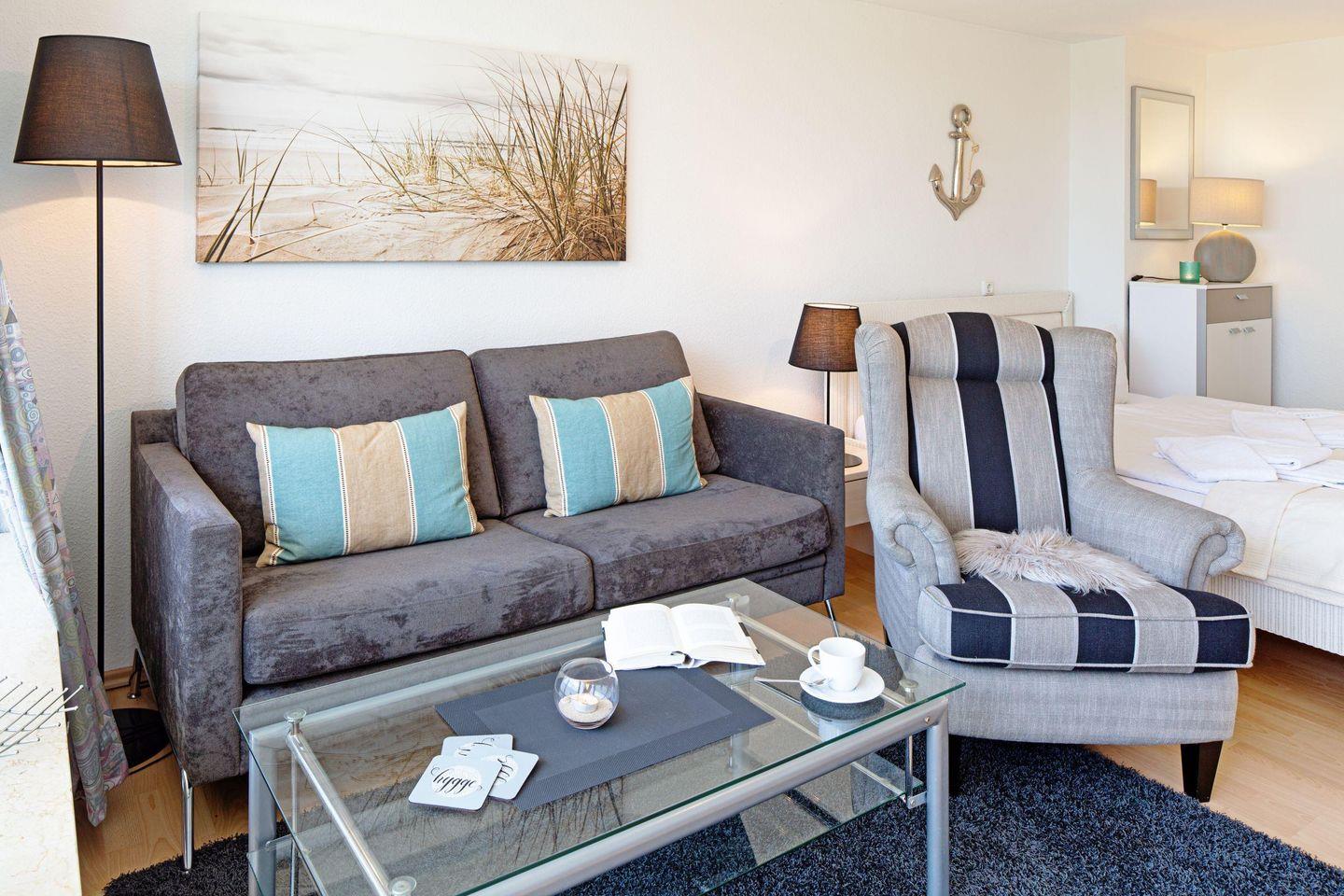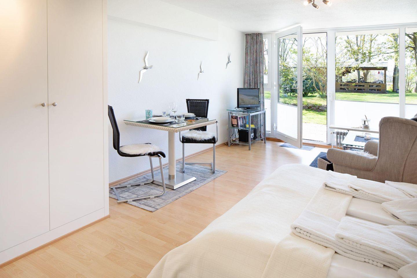 Das große und helle Wohnzimmer lädt zum Verweilen ein und bietet eine einladende Sofaecke, einen Essbereich, um gemeinsame Mahlzeiten zu genießen sowie einen kombinierten Wohn/Schlafraum. Für Ihre Unterhaltung steht Ihnen ein Fernseher sowie eine HiFi-Anlage zur Verfügung. Das offene Küchenkonzept bietet alles, was Sie zum Kochen benötigen – vom Cerankochfeld über einen Geschirrspüler bis hin zu einem Wasserkocher und einer Kaffeemaschine.