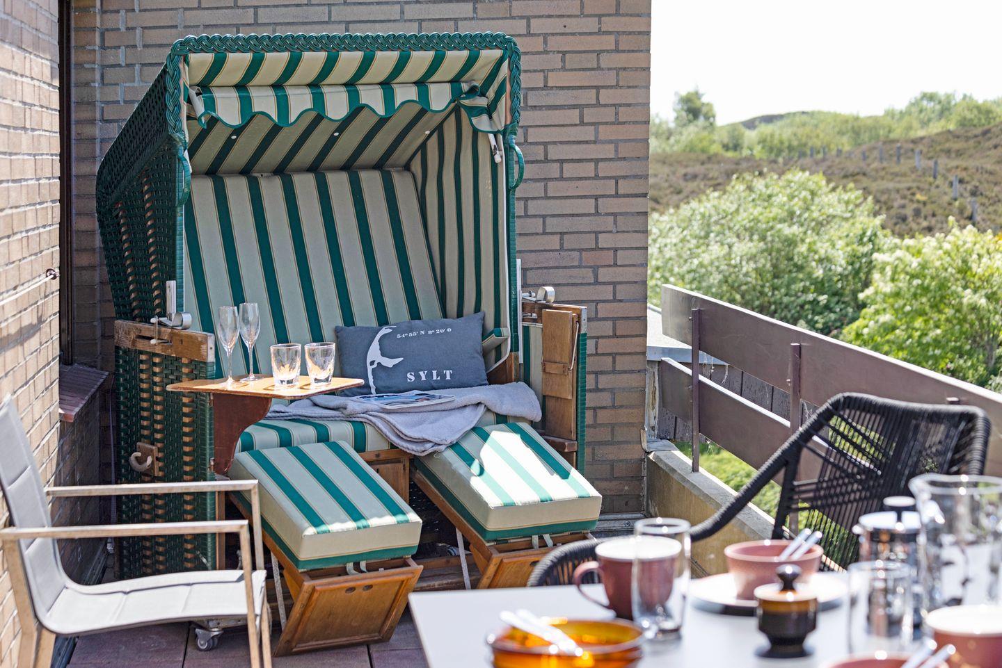 Möchten Sie entspannen? Nutzen Sie den großen Balkon – der ideale Ort für ein Glas Wein bei Sonnenuntergang oder einen lesenden Nachmittag im Strandkorb.
