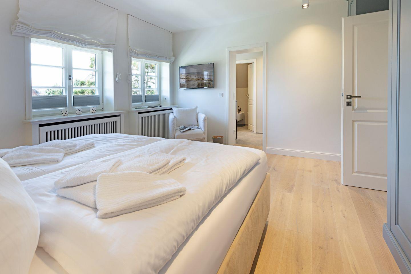 Das dritte Schlafzimmer mit Boxspringbett (Doppelbett) und einem Badezimmer befindet sich im Souterrain.