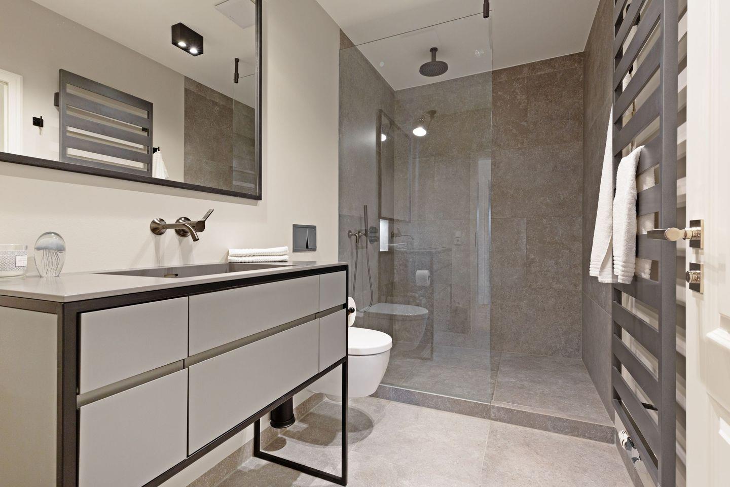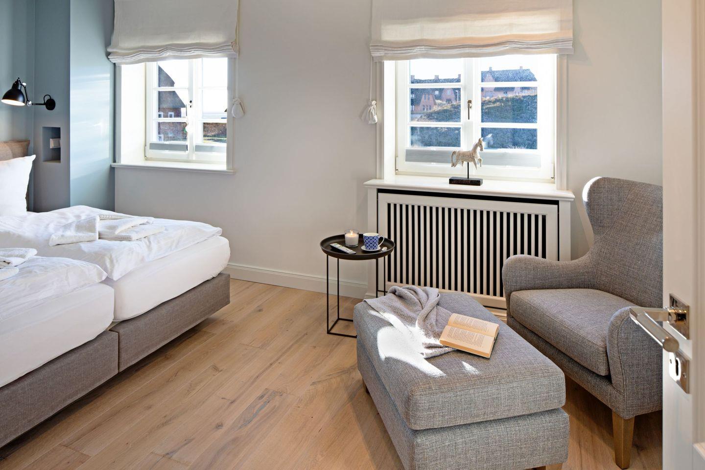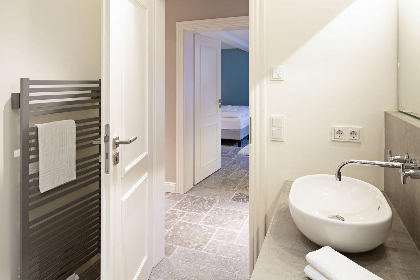 Ein Gäste-WC ist ebenfalls im Erdgeschoss zu finden. Zwei Schlafzimmer mit Boxspringbetten (Doppelbetten) und zwei Bad en Suite finden Sie im 1. OG.