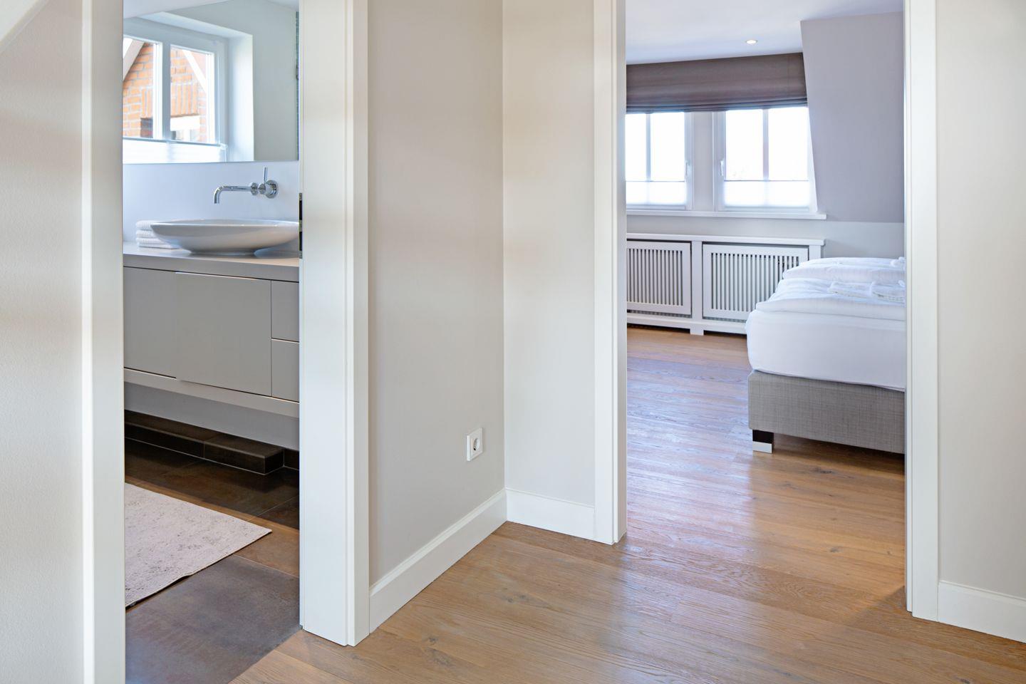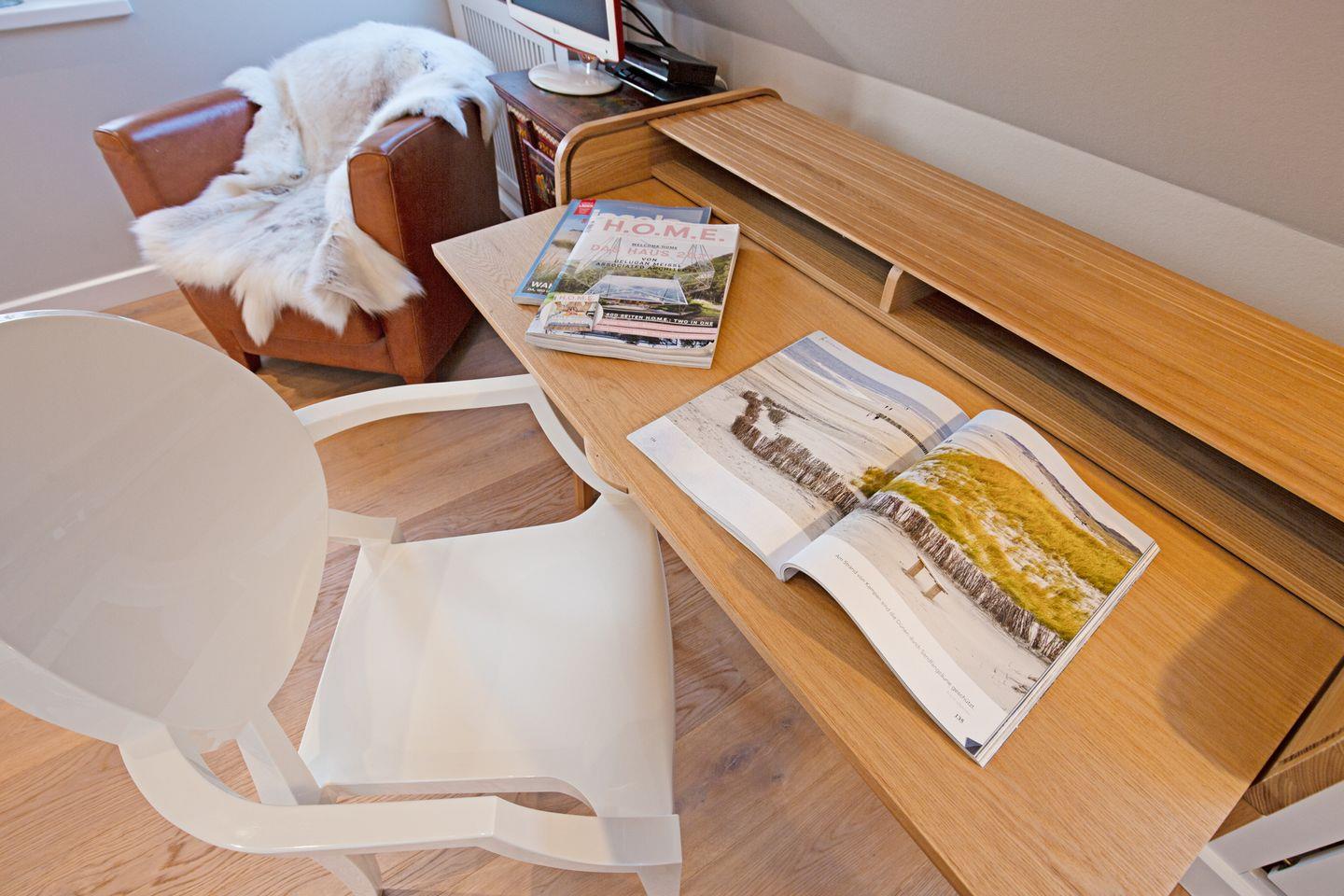 Genießen Sie die sonnige Terrasse in Ihrem Strandkorb, entspannen Sie in der (Infrarot-)Sauna oder der freistehenden Badewanne mit direktem Zugang zum Garten (EG) mit Blick auf die Syltrosen. Im 1. Stock befinden sich zwei Schlafzimmer (eins mit Schreibtisch) und ein Bad. Im Dachgeschoss (stark ansteigende Treppe) befindet sich ein weiteres Arbeitszimmer und einem Bad.