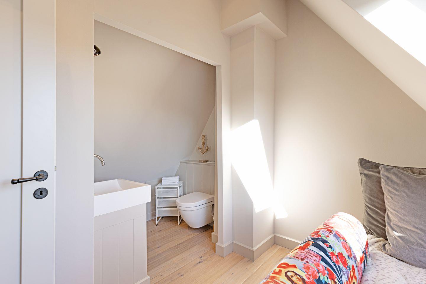 Das Gäste-WC befindet sich direkt nebenan. Das moderne Badezimmer verfügt über eine Dusche, WC und eine Waschmaschine.