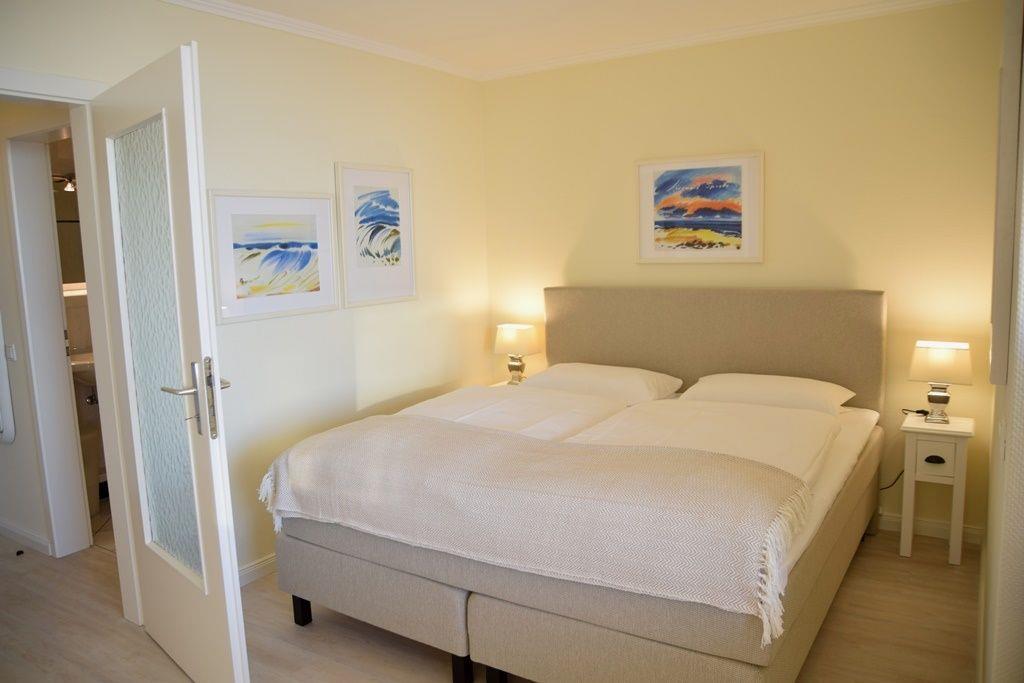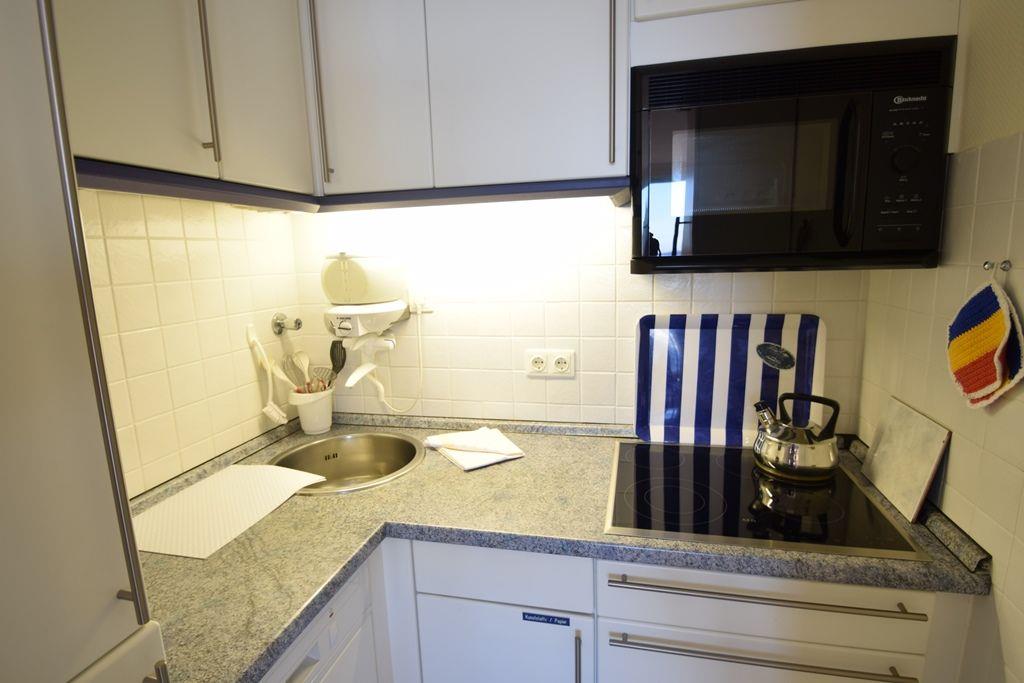 2-Zimmer-Appartement (ca. 45 m²) für 2 Personen in 1A-Lage direkt am Meer. Mit Panoramablick, Ost-Balkon, Garage und WLAN. Heller Wohnbereich mit Doppelbett, voll ausgestattete Küchenzeile. Keine Haustiere erlaubt.