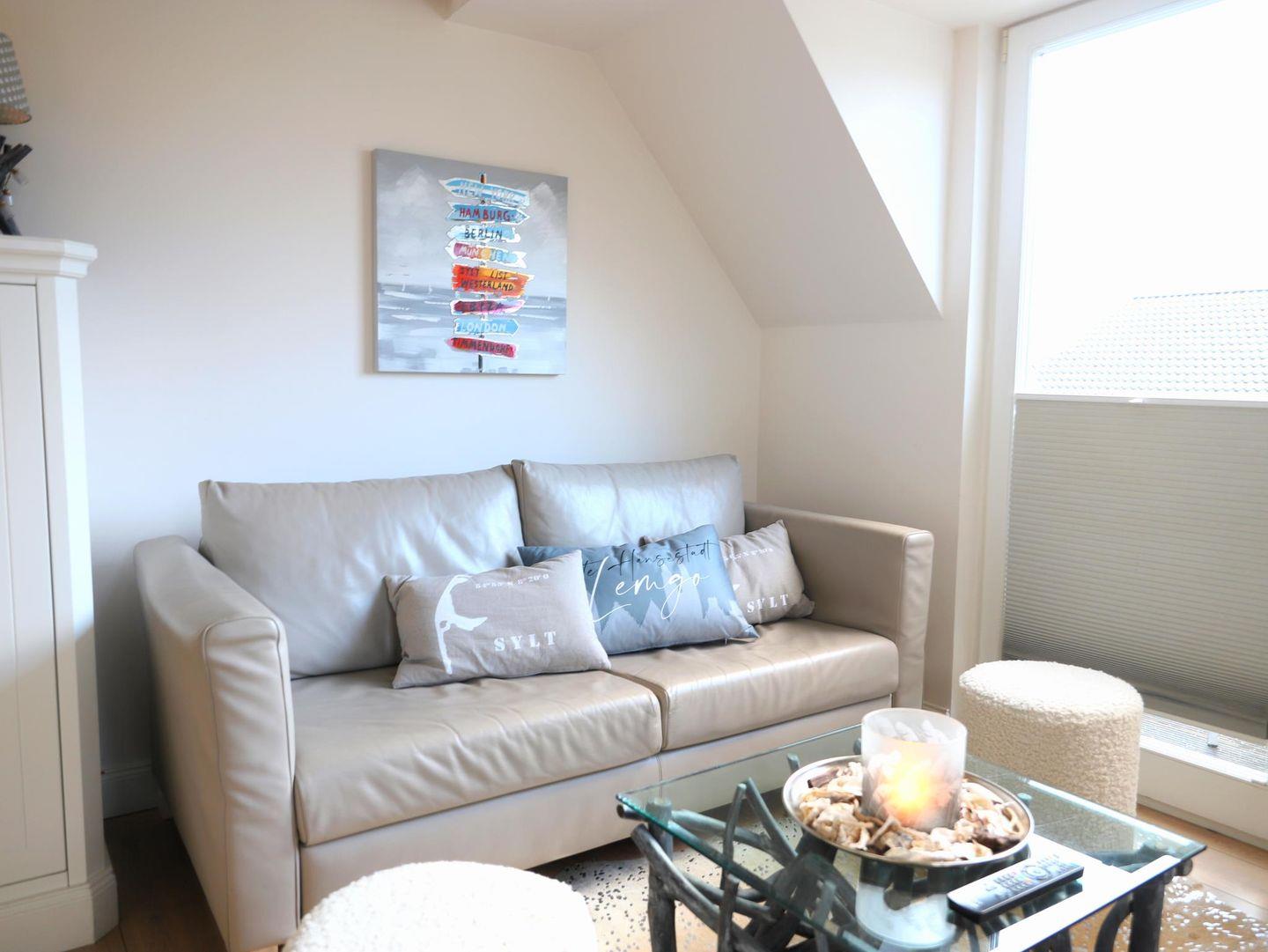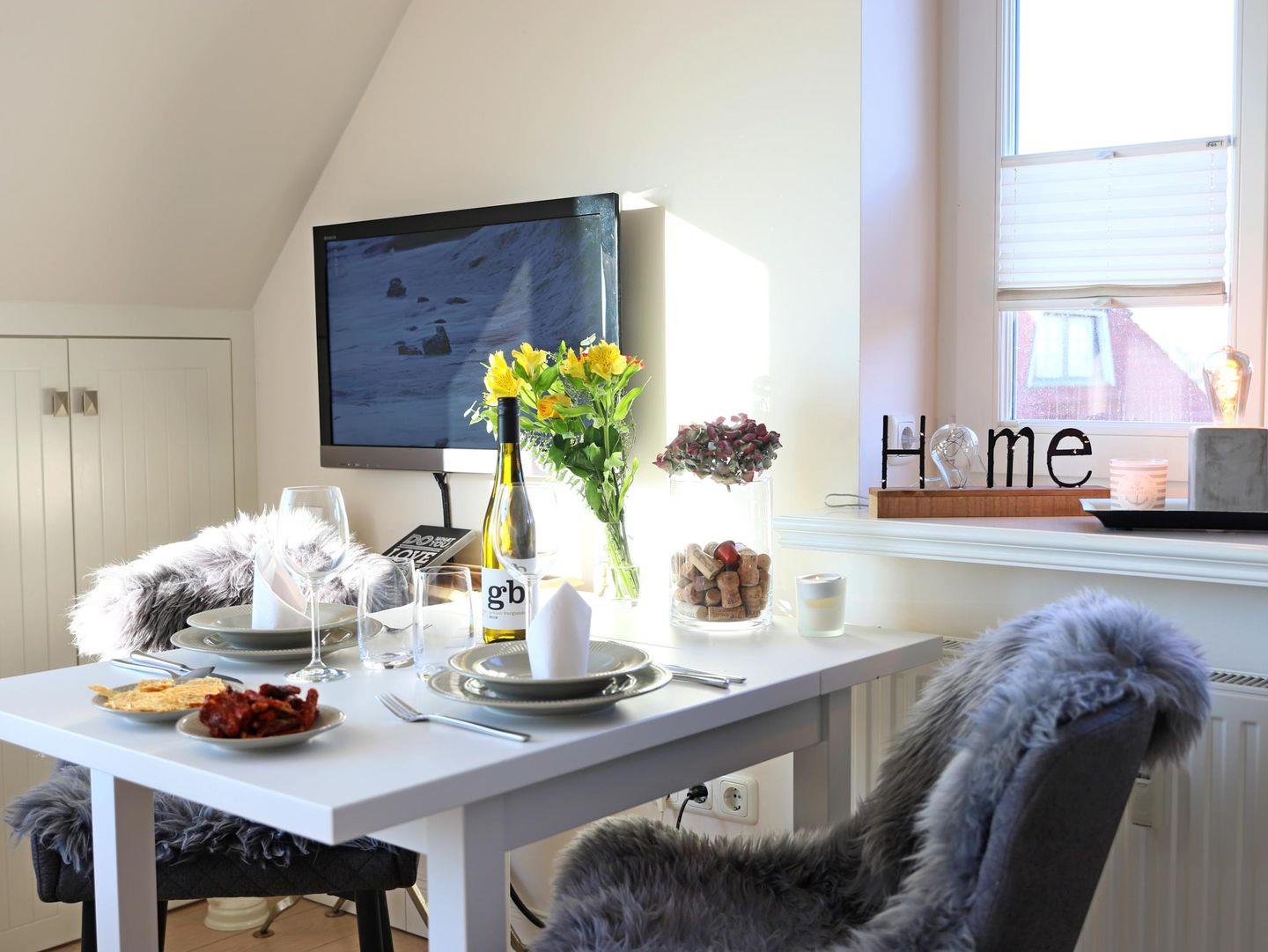 41 m² Dachgeschosswohnung in List für 2 Personen. Hochwertige Ausstattung, Süd-Balkon, 50 m zum Wattenmeer. Waschmaschine und Trockner im Haus. Ruhige, zentrale Lage mit Restaurants, Einkaufsmöglichkeiten und dem Erlebniszentrum Naturgewalten in der Nähe.