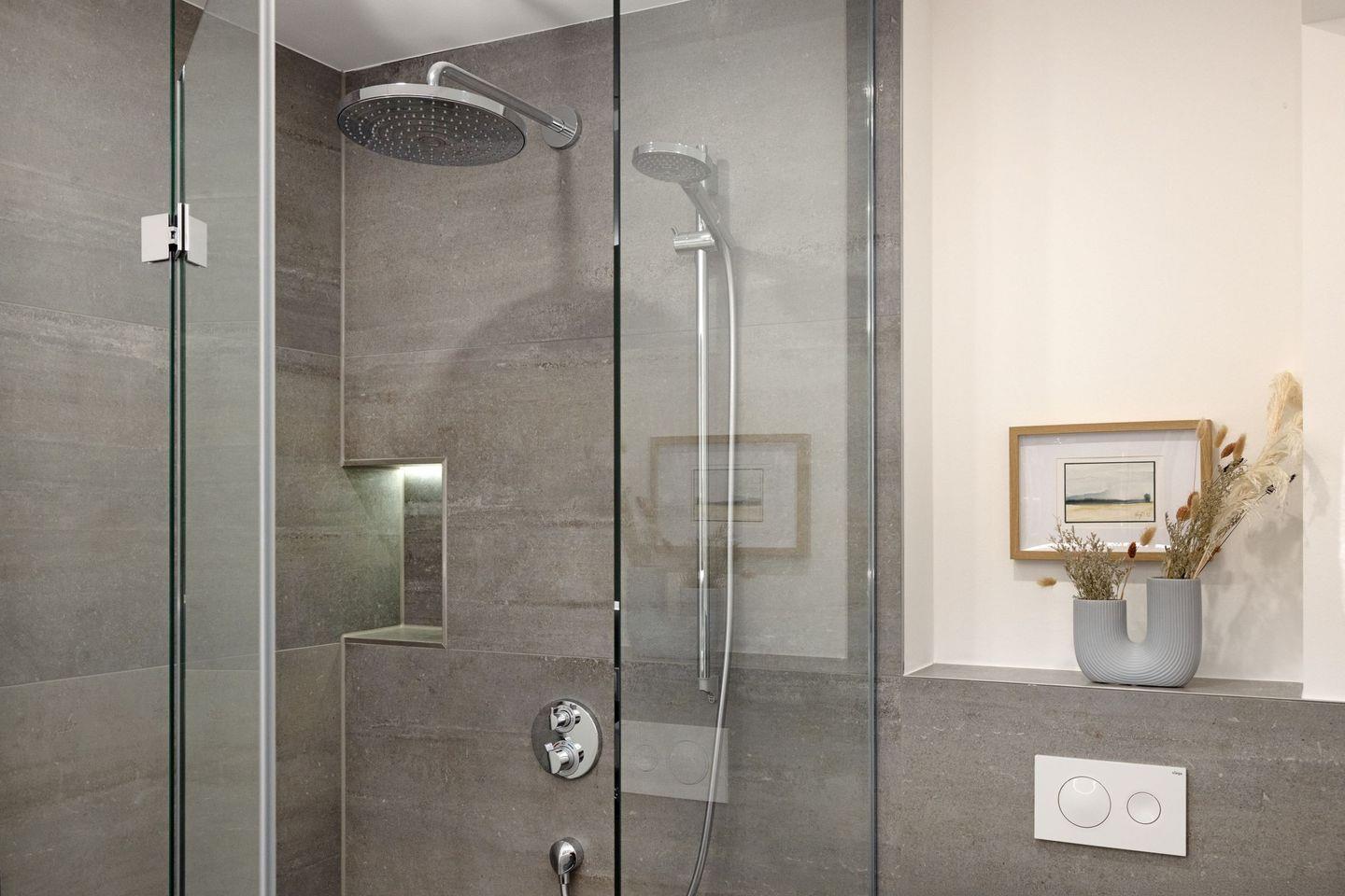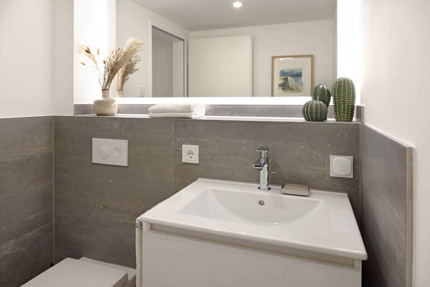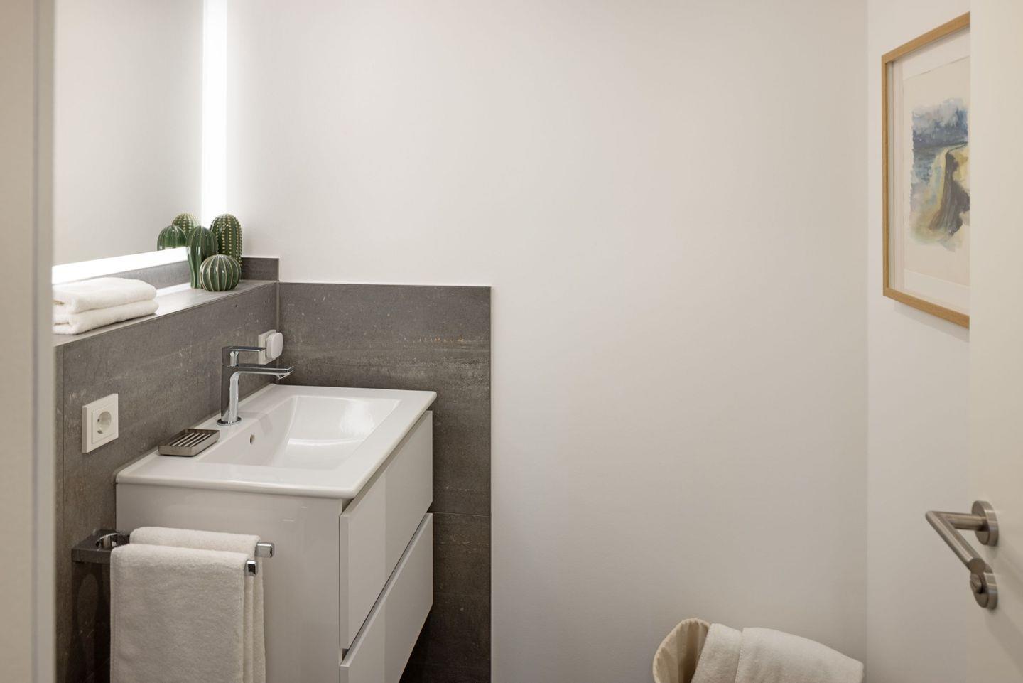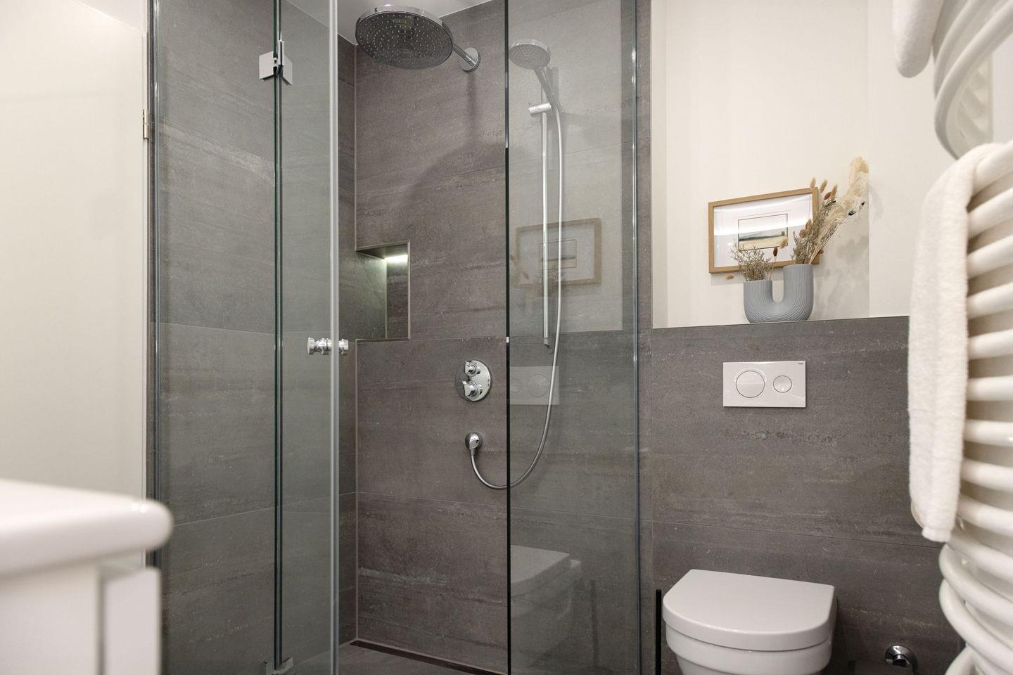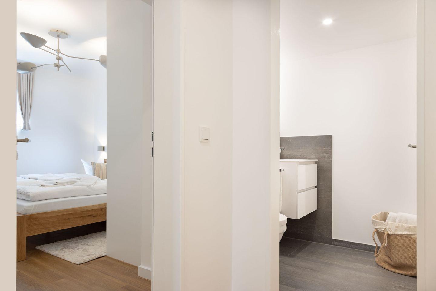 Ein Bad mit Regendusche für den Spa Moment, ein zusätzliches separates WC, schnelles Glasfaserinternet (500 Mbit/s) und Fußbodenheizung bieten höchsten Komfort. Die 15 m² große, windgeschützte Südterrasse ist Ihr Platz für sonnige Frühstücke und laue Sommerabende.