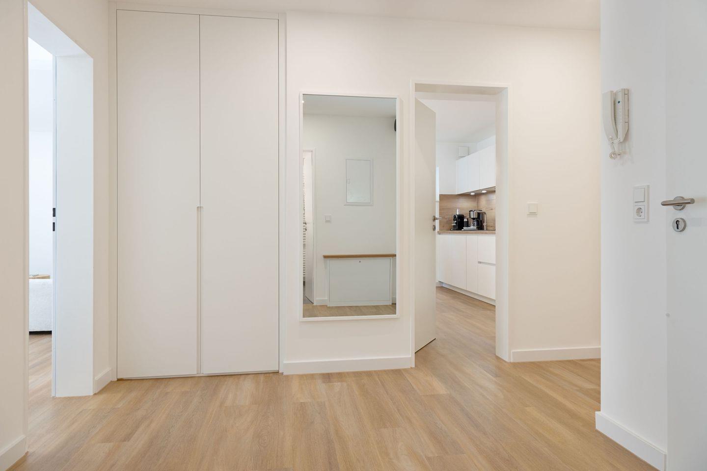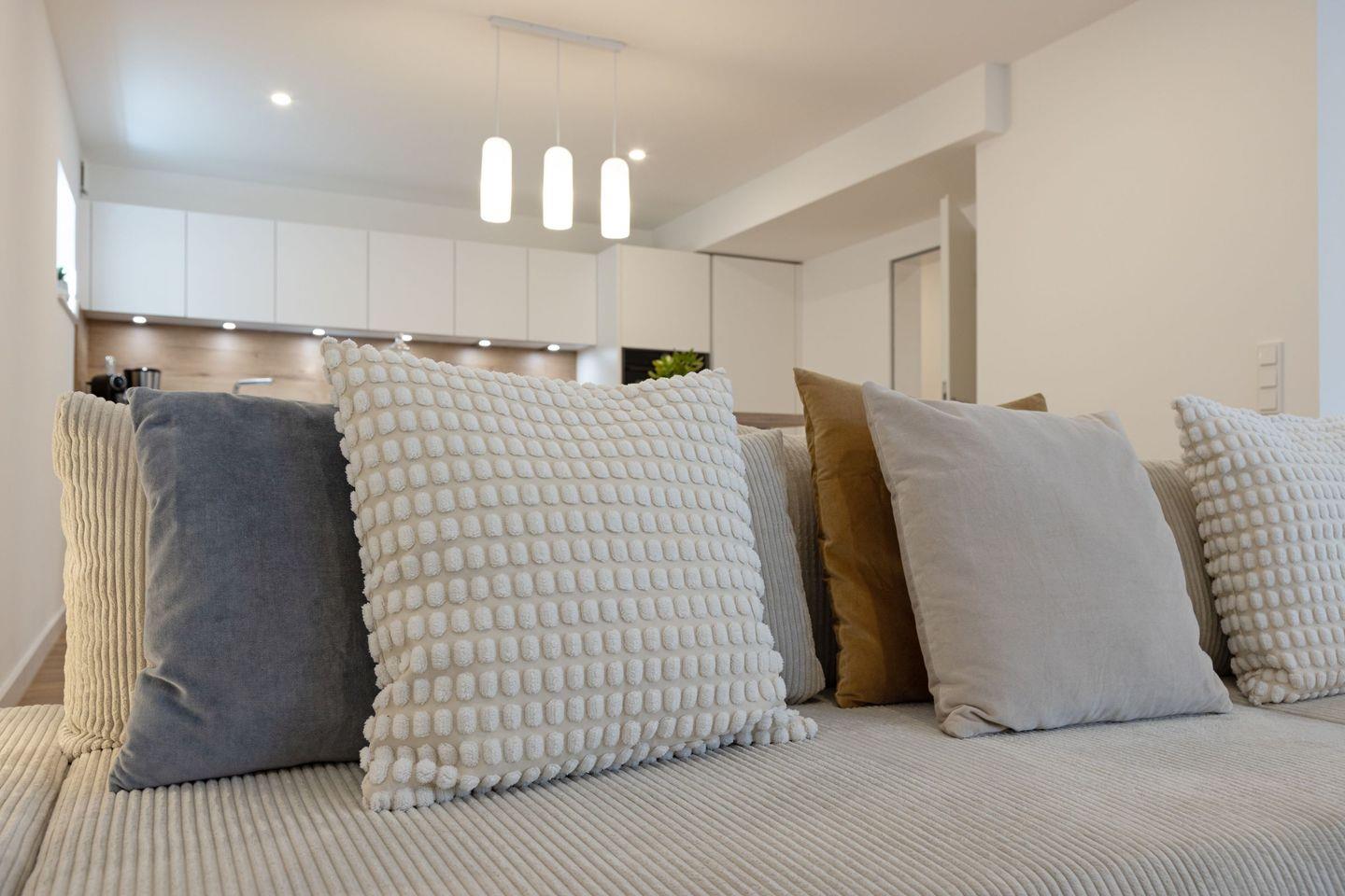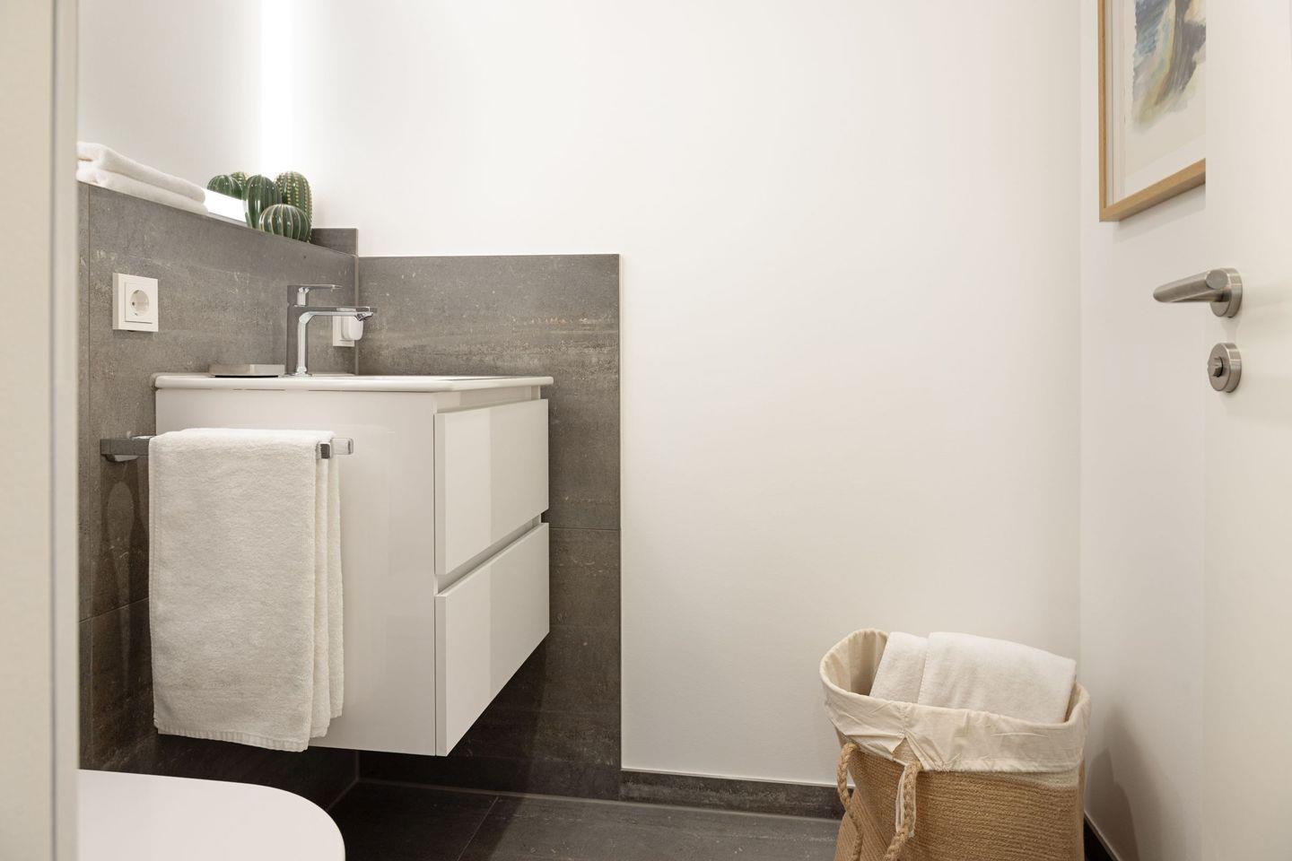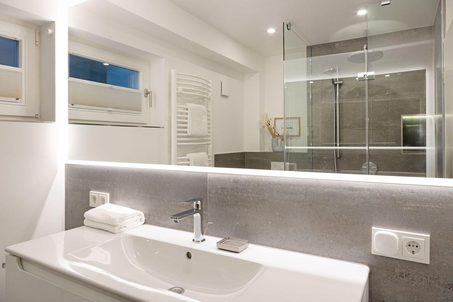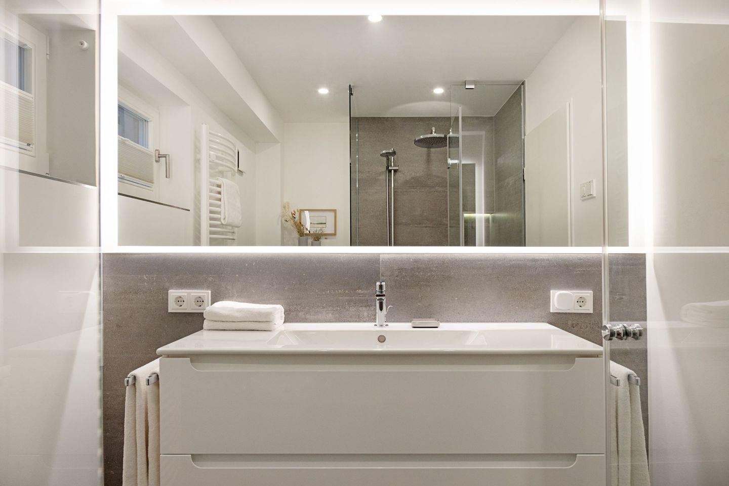 Ein Bad mit Regendusche für den Spa Moment, ein zusätzliches separates WC, schnelles Glasfaserinternet (500 Mbit/s) und Fußbodenheizung bieten höchsten Komfort. Die 15 m² große, windgeschützte Südterrasse ist Ihr Platz für sonnige Frühstücke und laue Sommerabende.