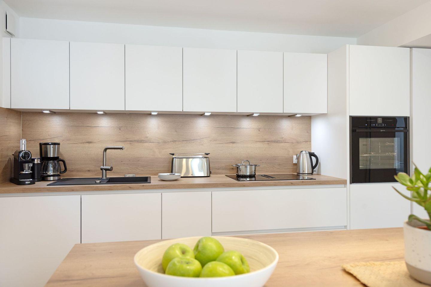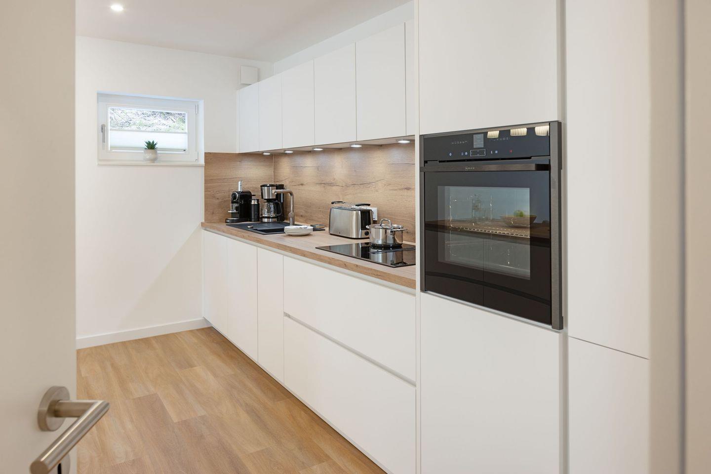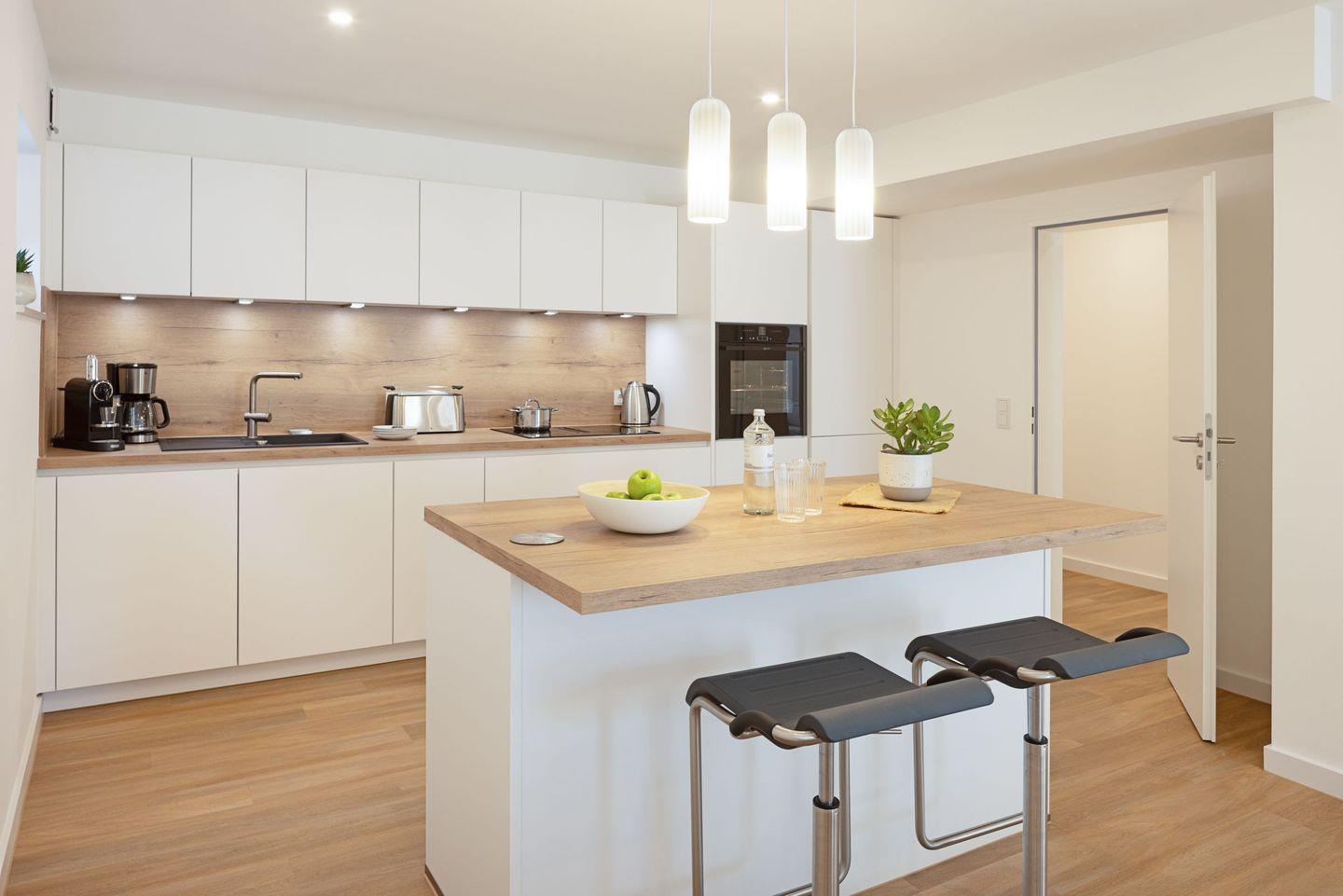 In der offenen Küche mit Barbereich finden Sie alles für kulinarische Genüsse – vom Induktionsherd mit integrierter Abluft über großen Kühlschrank mit Gefrierschrank, Geschirrspüler und Mikrowelle bis hin zu Kaffeemaschine, Gewürzen und komplettem Kochgeschirr.