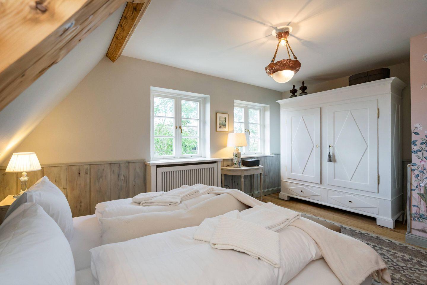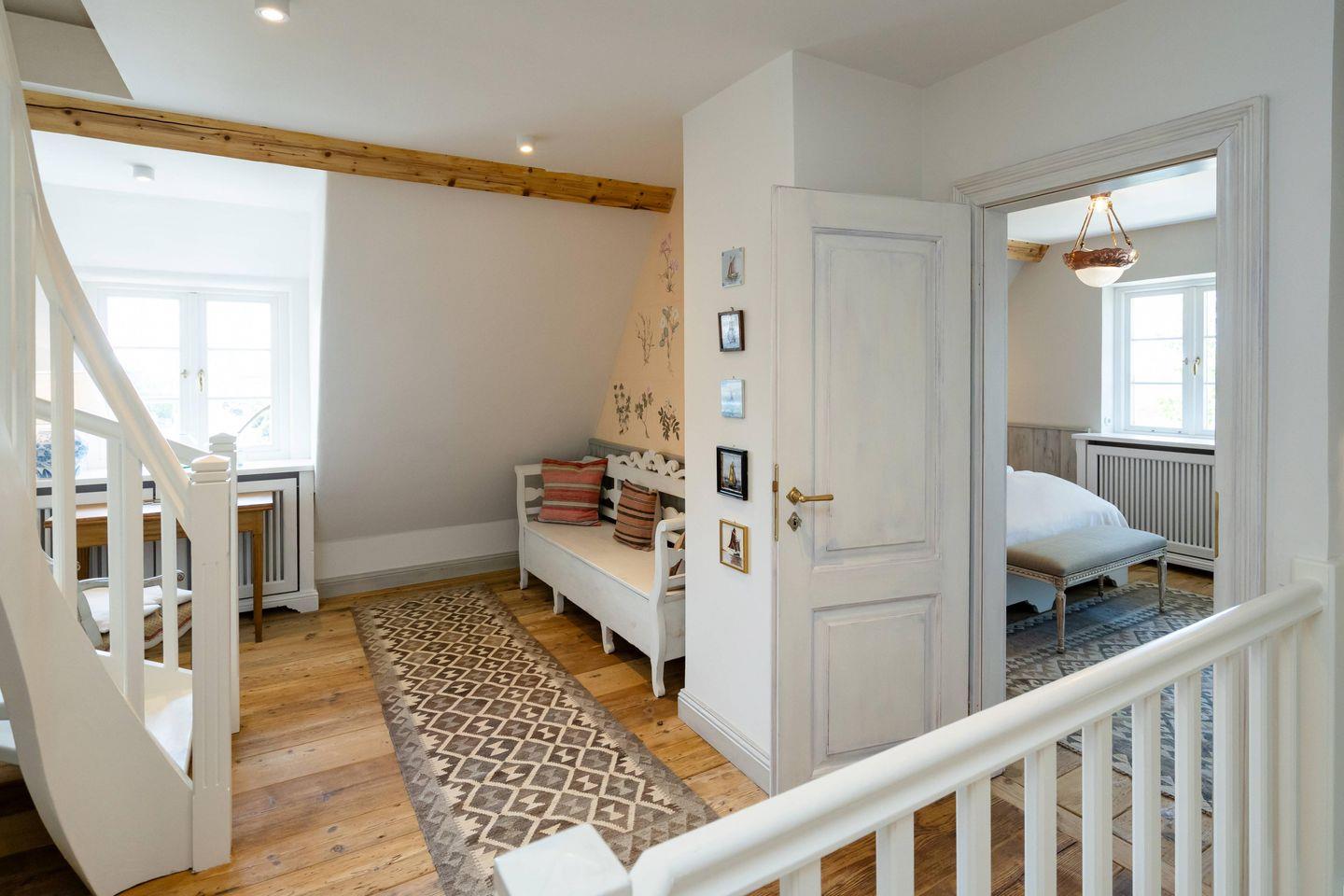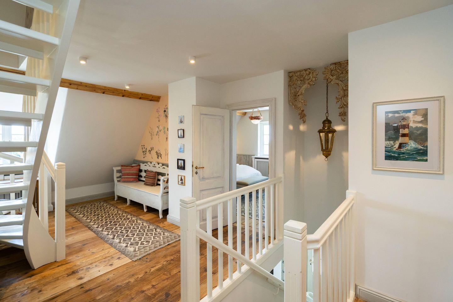 Im Obergeschoss befinden sich ein großzügiges Elternschlafzimmer mit einem kleinen Meerblick sowie ein traumhaftes Kojen-Kinderschlafzimmer, das nordischen Charme und Geborgenheit vereint. Eine liebevoll gestaltete Spielecke mit viel LEGO lädt die kleinsten Gäste zum kreativen Entdecken ein. Der ausgebaute friesische Giebel bietet zusätzlichen Raum zum Arbeiten, Lesen oder Erholen. Der idyllische Garten mit Pavillon und Strandkorb schafft weitere Plätze für entspannte Momente. Ein privater Stellplatz direkt vor dem Haus sorgt für komfortable Anreise und kurze Wege.