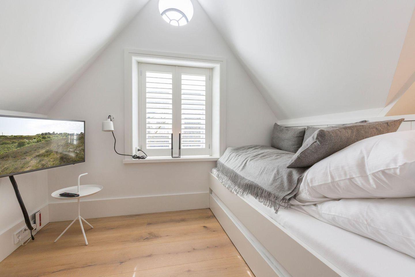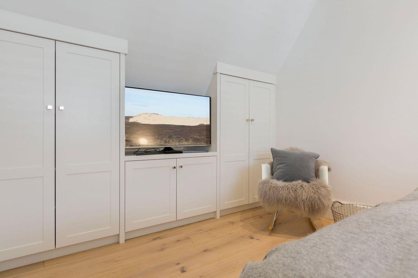 Das großzügige Wohnzimmer besticht durch nordisches Design und hochwertigen Komfort. Ein gemütlicher Kamin sorgt für wohlige Wärme an kühleren Abenden, während die großen Fensterfronten viel Licht hereinlassen und Ihnen direkten Zugang zum weitläufigen Garten und zu den beiden Terrassen bieten. Hier können Sie sich nach einem Tag am Strand entspannen, die Sonne genießen oder den Abend bei einem Glas Wein ausklingen lassen.