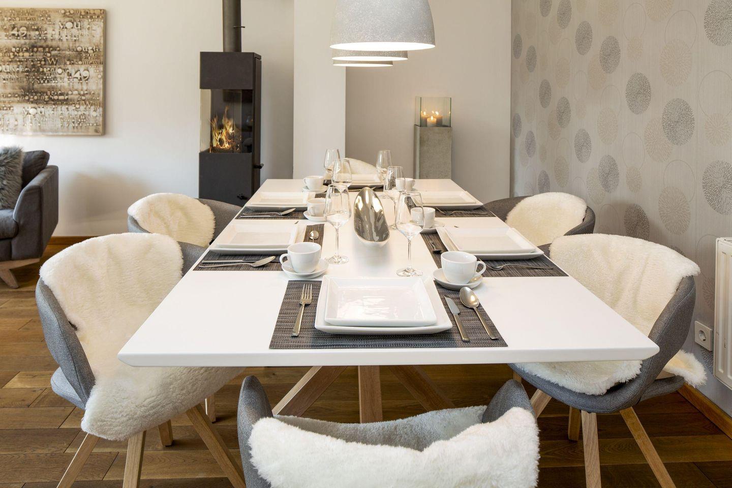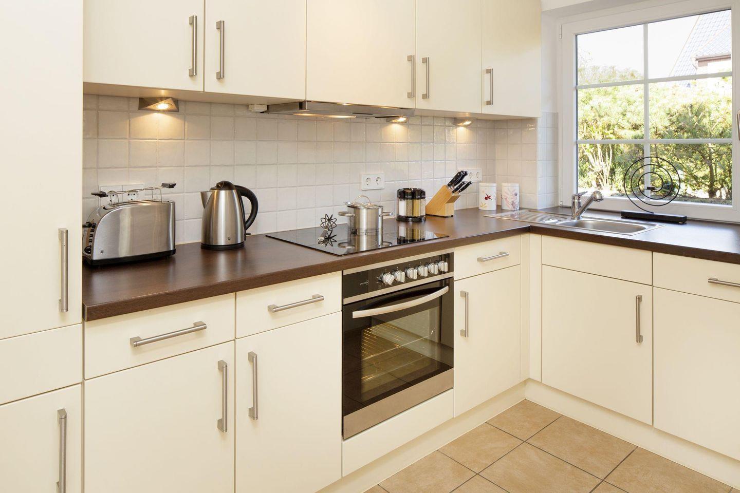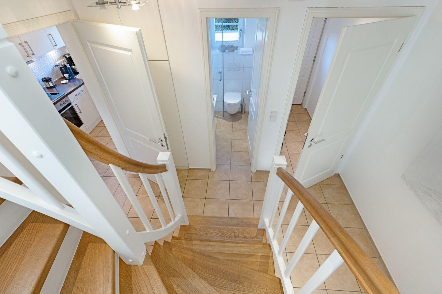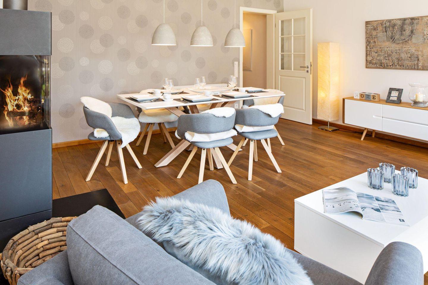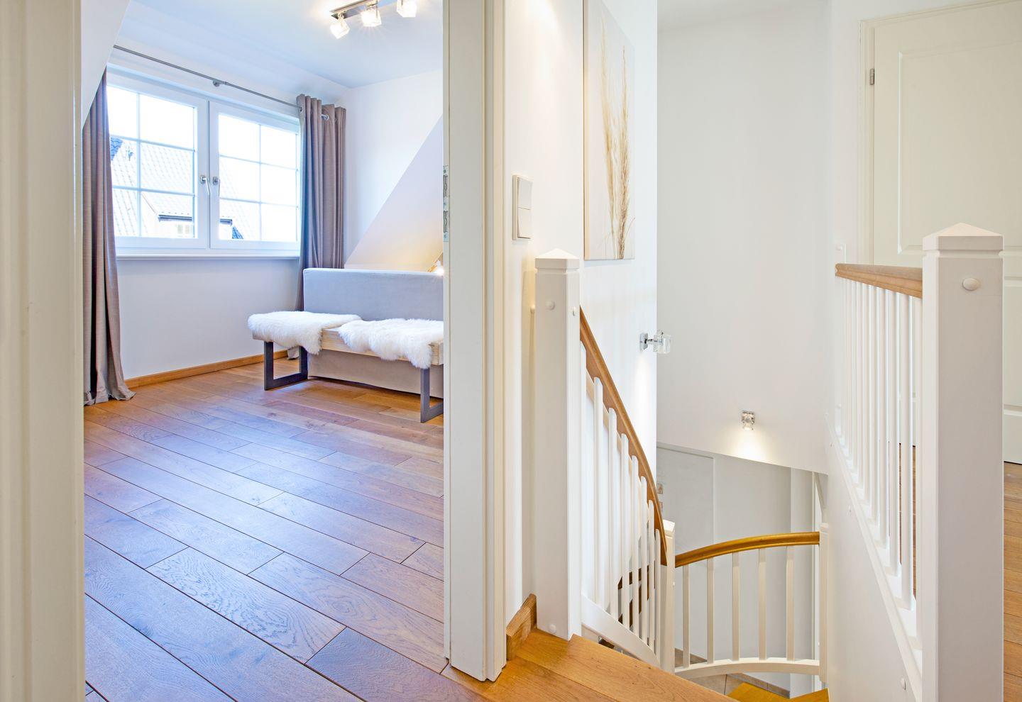 Das modern ausgestattete Ferienreihenhaus ist im Wohnbereich mit Eichenparkett und einem Kaminofen ausgestattet. Im 1. Stock befinden sich die drei Schlafzimmer zwei mit Doppelbett und eins mit großer Schlafcouch sowie ein Bad. Im EG bietet das Haus ein zweites Bad.