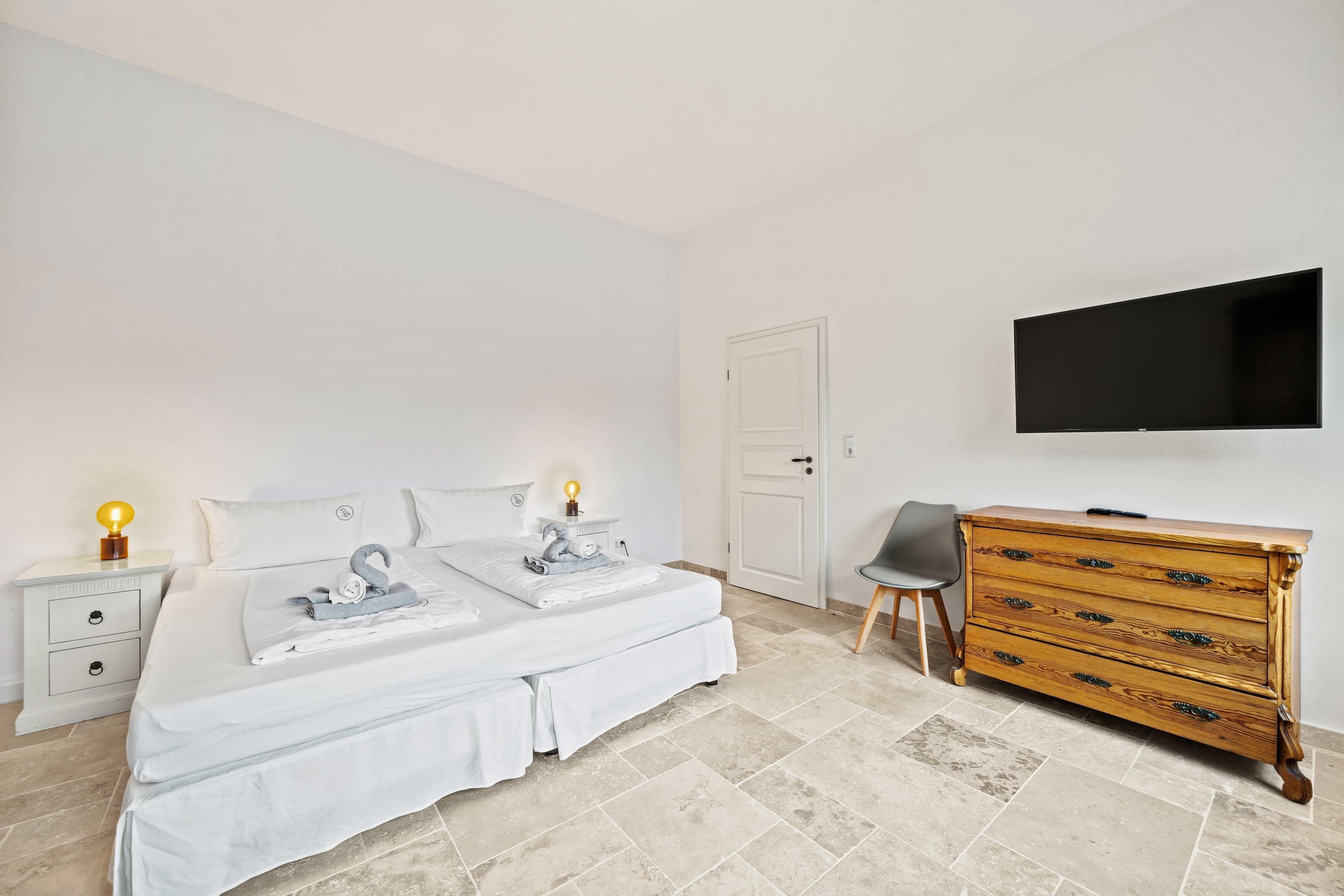 Inmitten der malerischen ostfriesischen Landschaft, im ruhigen Warfendorf Loquard, erwartet Sie das „Schmuckstück an der Nordsee“ – ein stilvolles Ferienhaus, das historische Atmosphäre mit modernem Wohnkomfort verbindet. Das großzügige Domizil befindet sich in einem ehemaligen Gulfhof, der mit viel Liebe zum Detail aufwändig saniert wurde. Hier treffen traditionelle Architektur und modernes Interieur aufeinander, wobei alte Holzbalken erhalten wurden, die das Ferienhaus besonders wohnlich und gemütlich machen. Auf 140qm Wohnfläche finden Familien und Freundesgruppen reichlich Platz zum Entspannen, denn das Haus verfügt über vier einladende Schlafzimmer, jedes davon mit einem komfortablen Doppelbett und TV ausgestattet. Zwei moderne Badezimmer sorgen für ausreichend Privatsphäre: Während eines der Bäder neben einer ebenerdigen Dusche auch eine freistehende Badewanne bietet, überzeugt das zweite Bad ebenfalls mit einer ebenerdigen Dusche und hochwertiger Ausstattung. Das Herzstück der Ferienwohnung ist der große Wohnbereich mit gemütlicher Sofaecke. Etwas abgetrennt finden Sie die voll ausgestattete, hochwertige Küche mit geräumigem Esstisch. Im Außenbereich erwartet Sie vor dem Haus eine möbilierte Terrasse, sowie eine Grün- und Steinfläche, auf der getobt oder gespielt werden kann. Auch vierbeinige Familienmitglieder sind hier herzlich willkommen.
