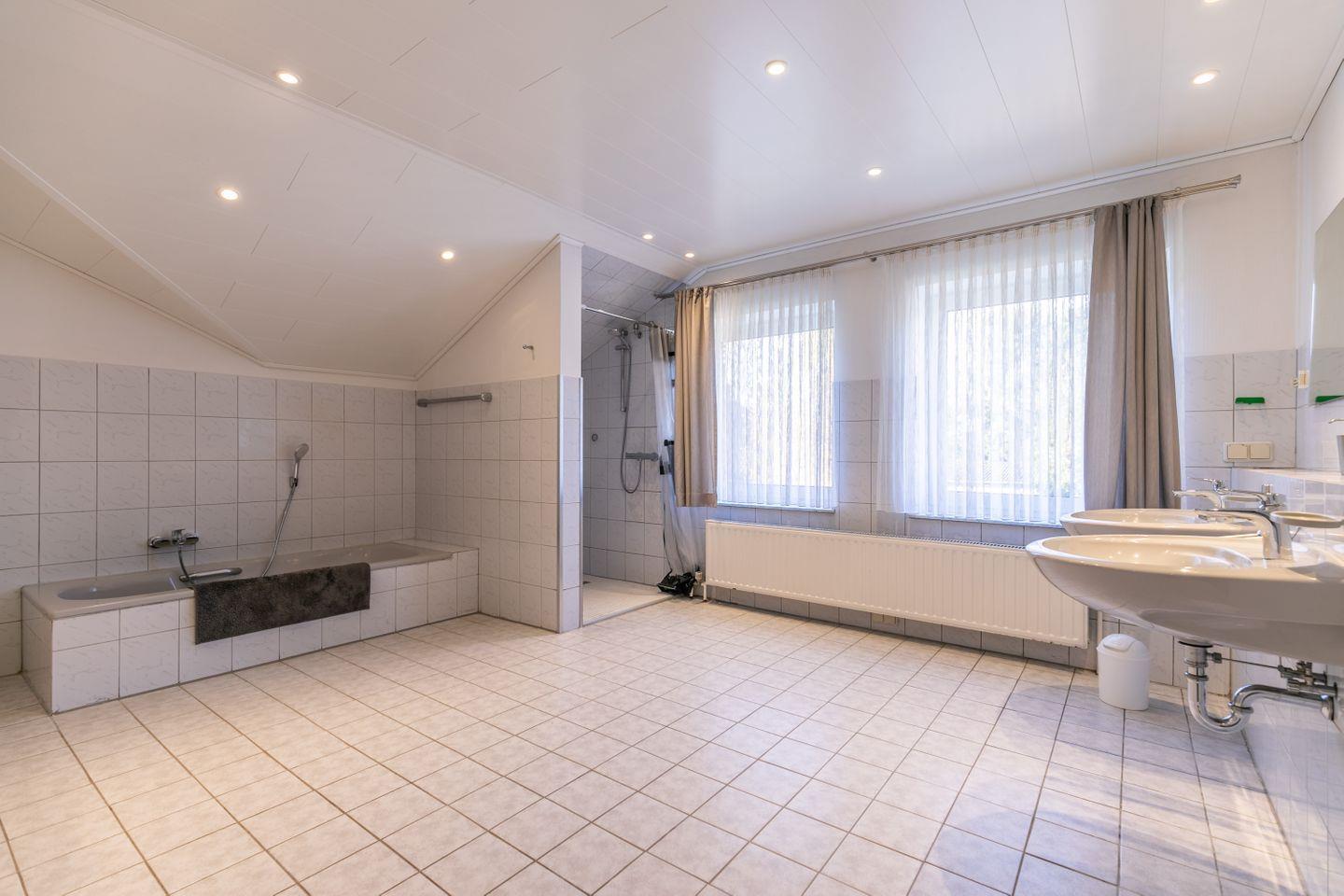 WC, Dusche, Badewanne, 2 Waschbecken, großer Spiegel, Waschmaschine, Fenster