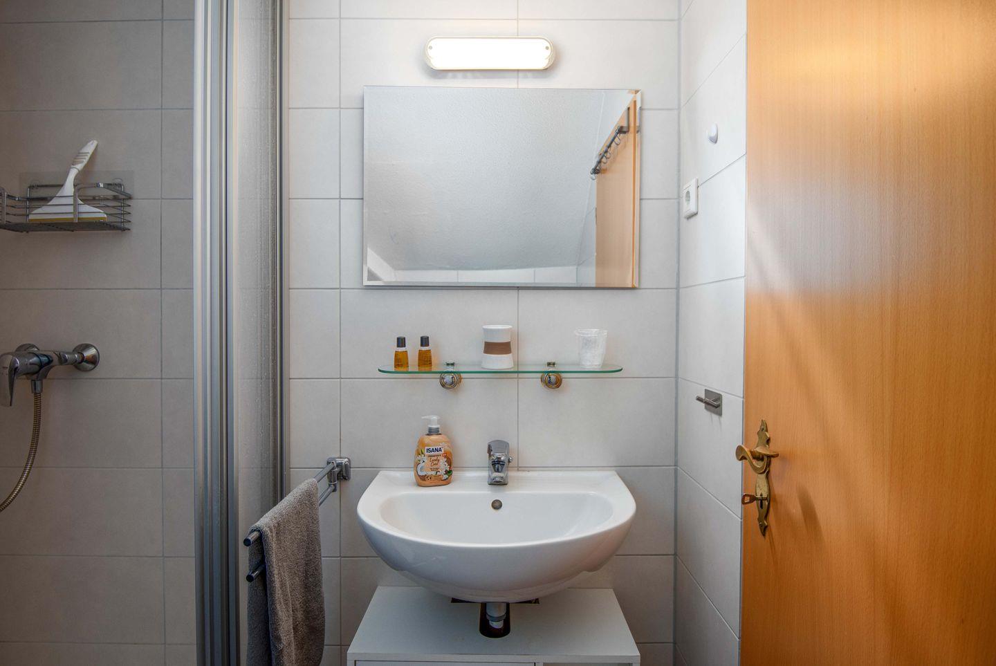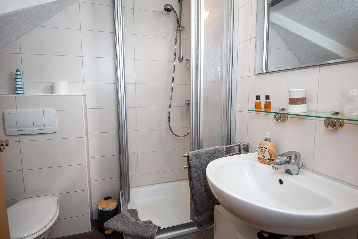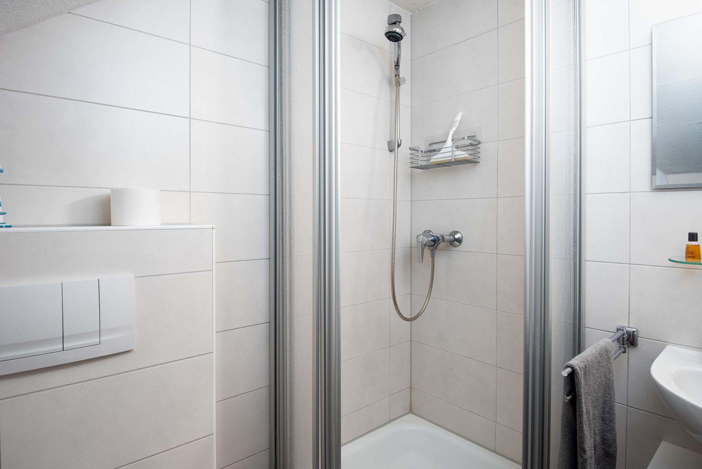 Das moderne Bad ist mit einer Dusche und einem WC ausgestattet. Helle Materialien und klare Formen schaffen eine angenehme Wohlfühlatmosphäre.