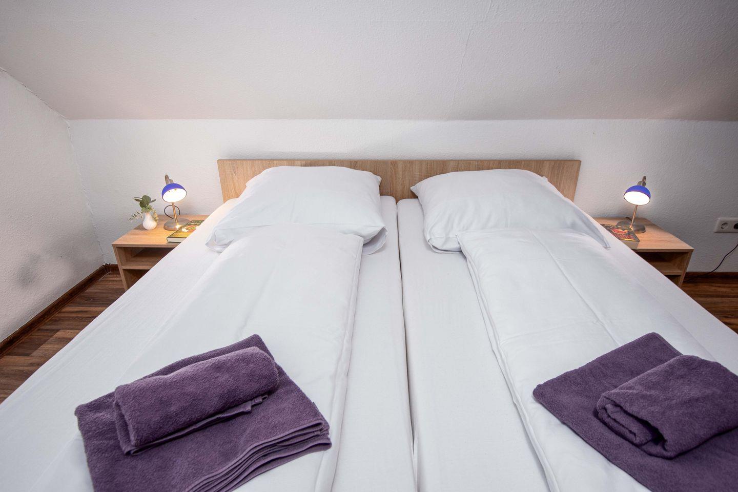 Im separaten Schlafzimmer erwartet Sie ein komfortables Doppelbett (180 × 200 cm), das für erholsame Nächte sorgt. Hochwertige Textilien und ein ruhiges Ambiente bieten beste Voraussetzungen, um nach einem erlebnisreichen Tag zur Ruhe zu kommen.