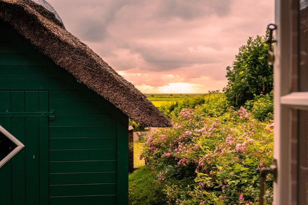 Gemütliches Reetdachferienhaus in Midlum mit großem Garten und Schwimmbecken, ideal für Familien und Radfahrer.