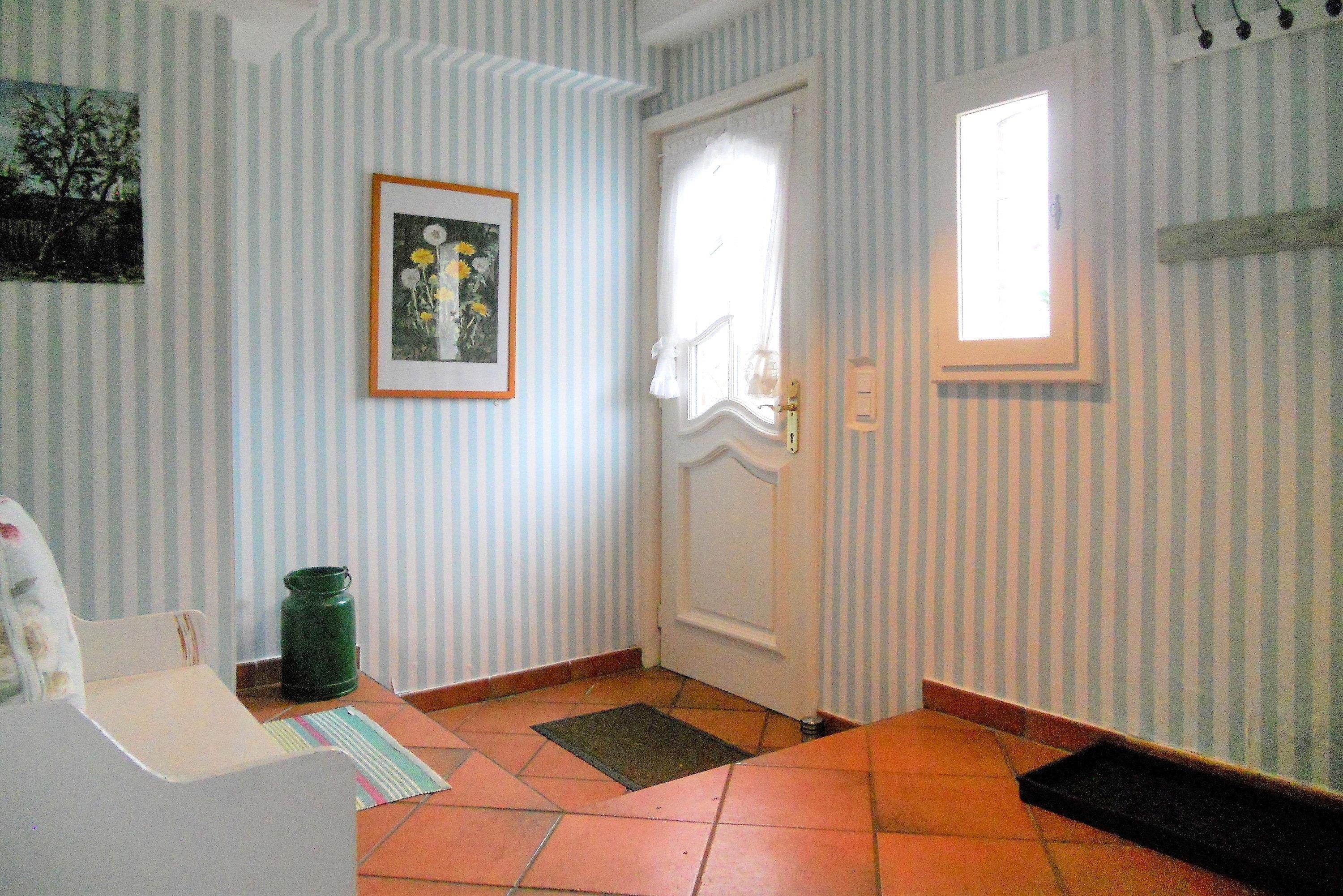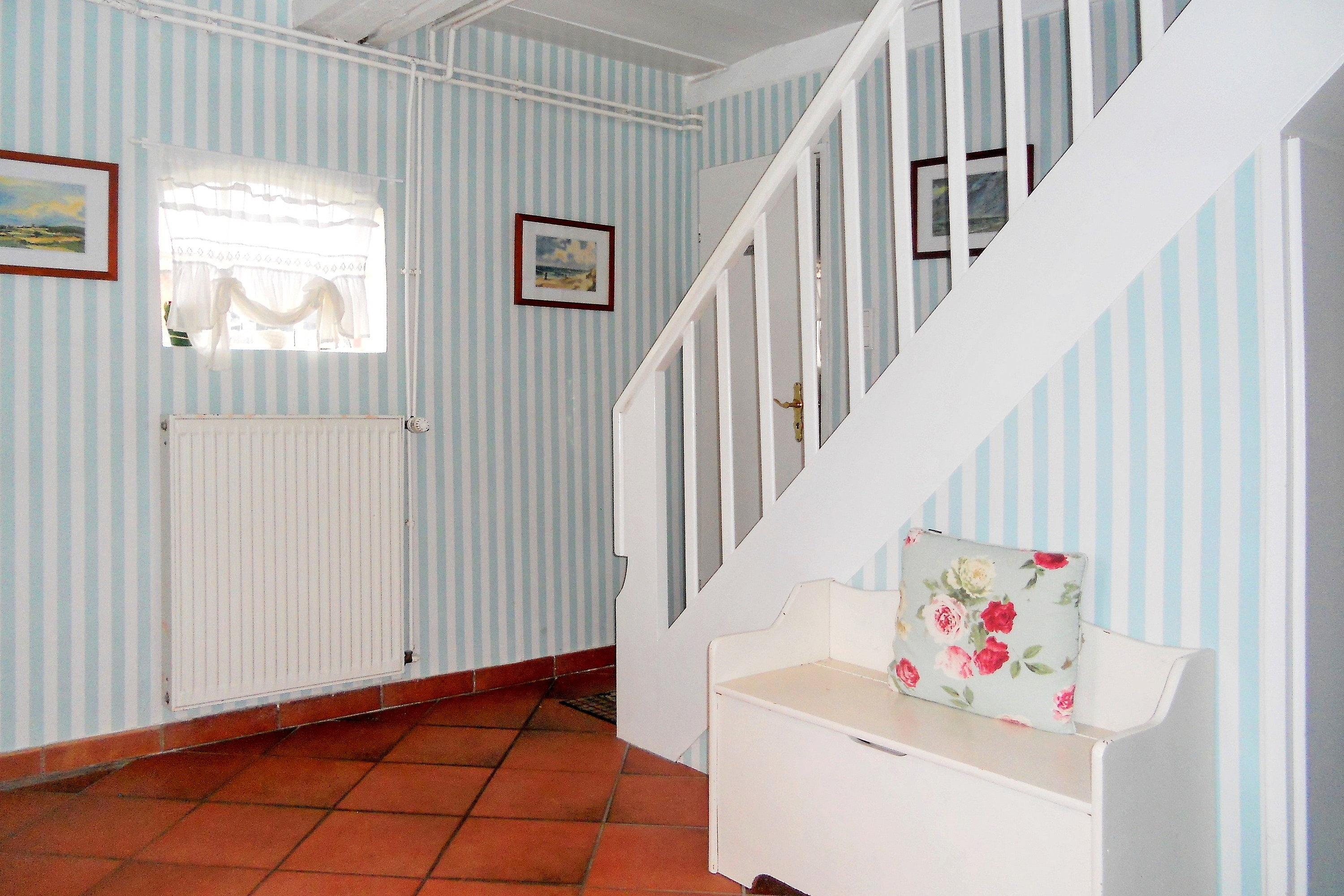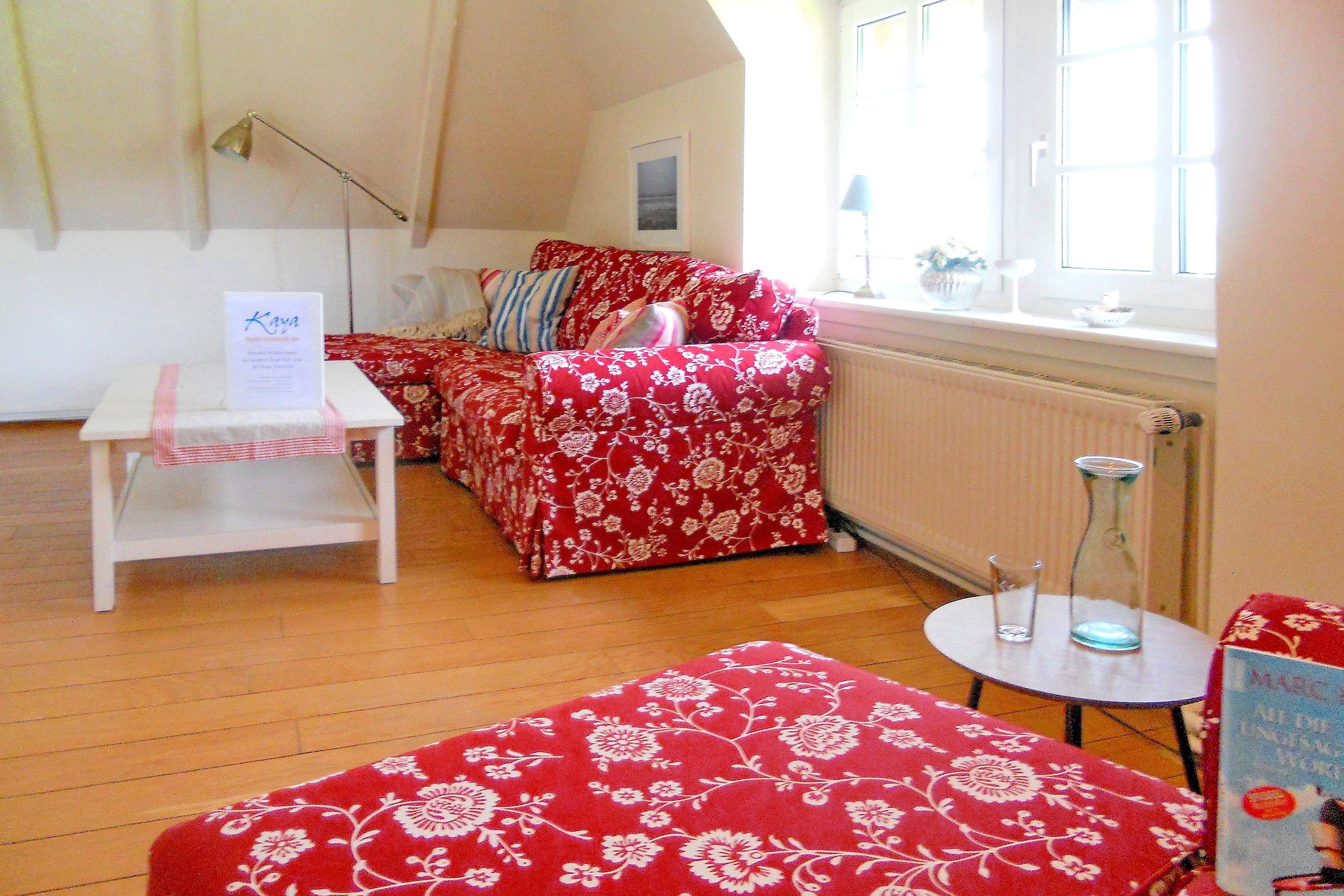 Die Obergeschosswohnung "Peppin" bietet bis zu sechs Personen herrliche Urlaubstage im ruhigen Ort Midlum- ca. 5 Kilometer von der Stadt Wyk entfernt. Über die eigene Terrasse gelangen Sie durch einen separaten Eingang in die Wohnung mit dem im Erdgeschoss befindlichen Badezimmer. Von hier aus führt eine Treppe hinauf zu dem großen Wohnbereich mit integrierter Wohnküche. Friesische Gastfreundlichkeit heißt Sie willkommen und lässt Sie sich sogleich Wohlfühlen. Drei abgehende Schlafzimmer, eines mit Doppelbett (180 x 200 cm) und die anderen beiden mit je zwei Einzelbetten (2x 100 x200 cm und 2x 80x 190cm), versprechen ruhige Nächte nach aufregenden Urlaubstagen. Die Wohnung ist liebevoll eingerichtet und gut ausgestattet. Ihr vierbeiniger Freund (max. 2 Hunde) ist hier ebenfalls Willkommen und wird sich über die weitreichende Marsch, die zu Spaziergängen einlädt, freuen.