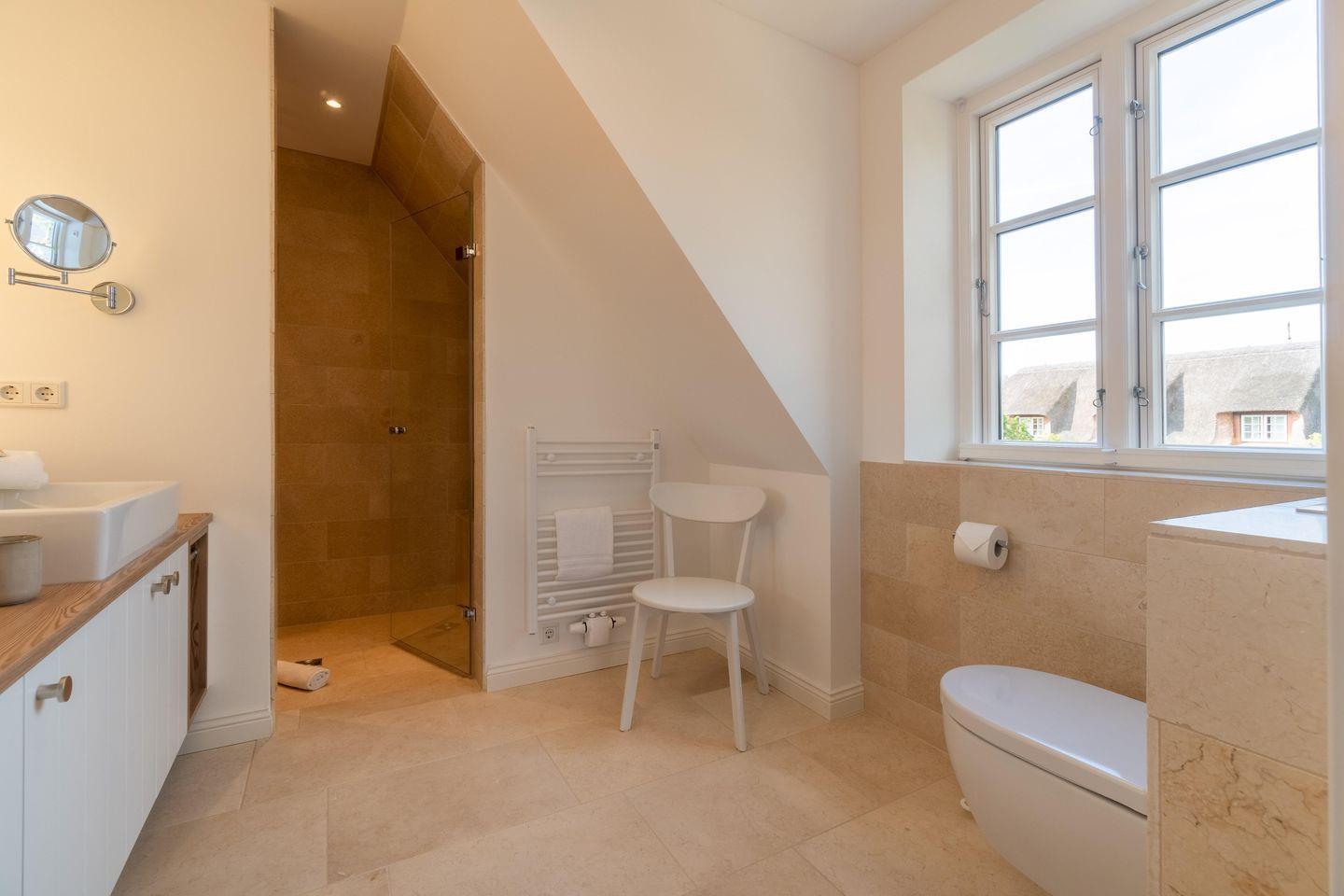 Im Obergeschoss befindet sich ein Schlafzimmer mit Doppelbett (2,00m x 2,00m) und einem en-suite Bad mit Dusche. Im großzügigen Masterbedroom (Doppelbett 2,00m x 2,00m) mit Récamière und Lesesessel befindet sich auch ein Arbeitsbereich. Direkt nebenan liegt ein weiteres Bad mit Dusche und Badewanne.