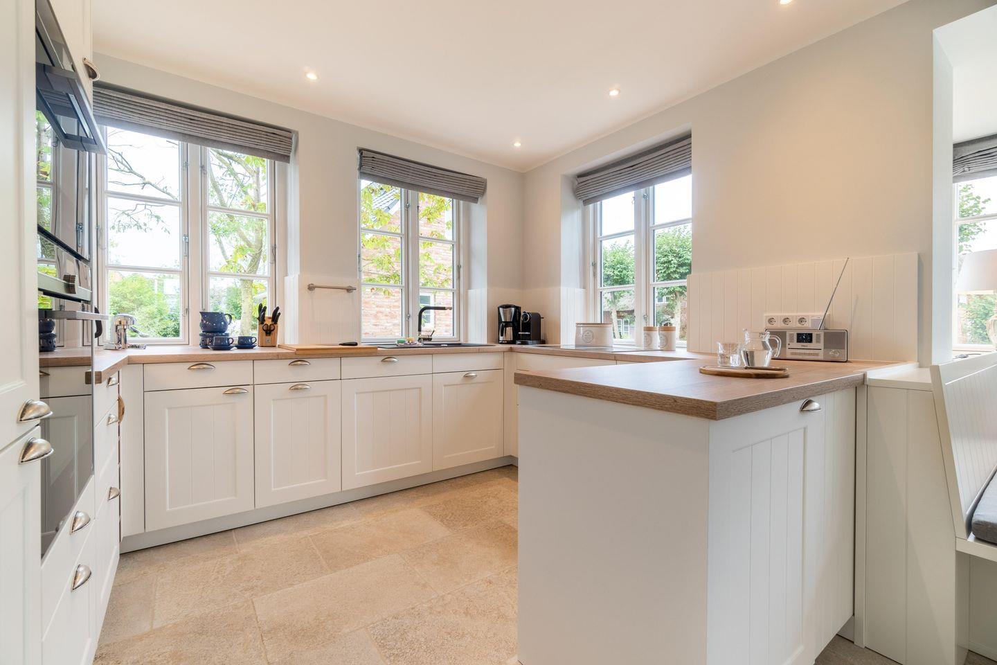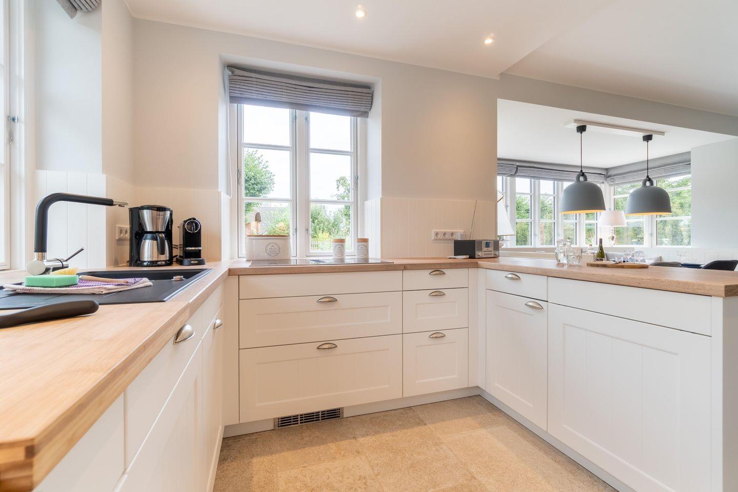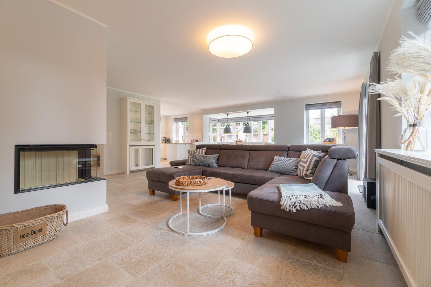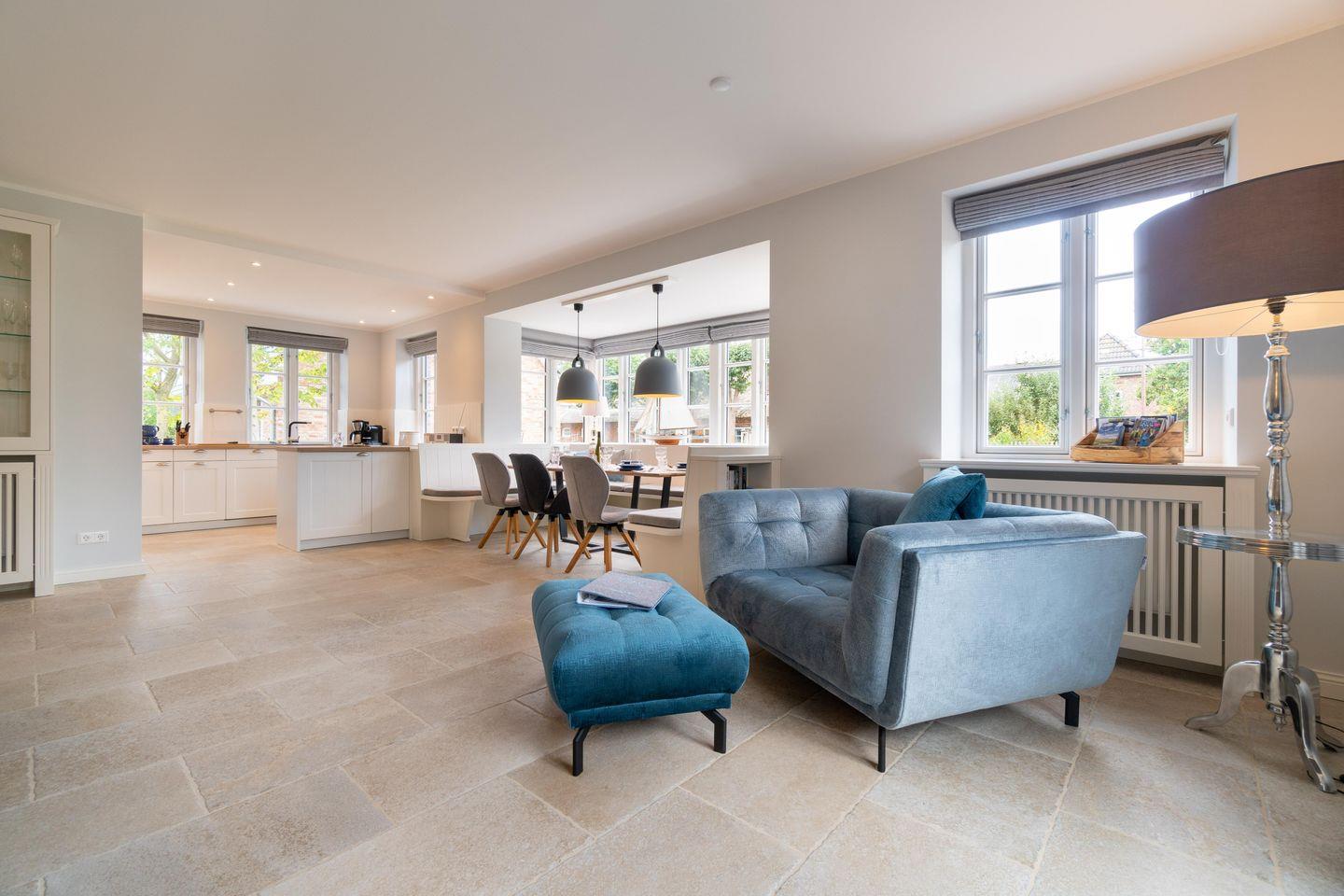Durch den einladenden Flur gelangen Sie in den großen, lichtdurchfluteten Wohn-/Essbereich mit offener Landhausküche. Die mit hochwertigen Markengeräten und Nespressomaschine ausgestattete Küche lädt mit Dampfgarer zum Kocherlebnis ein. So lässt sich auch im Winter ein herrliches Weihnachts- oder Silvestermenü zaubern. Genießen Sie gesellige Stunden in der gemütlichen „Utlucht“ am Eichentisch oder entspannen Sie im bequemen Lesesessel. Vom Wohnraum aus gelangen Sie direkt auf die große Terrasse mit Blick auf den urigen Friesenwall und seinen für Föhr typischen Rosen. Im Sommer entspannen Sie hier im hauseigenen Strandkorb oder genießen wundervolle Grillabende. Im Herbst oder Winter, wenn der Wind über die Insel weht, laden Sauna und ein prasselndes Feuer im Kamin zu gemütlichen Stunden ein.