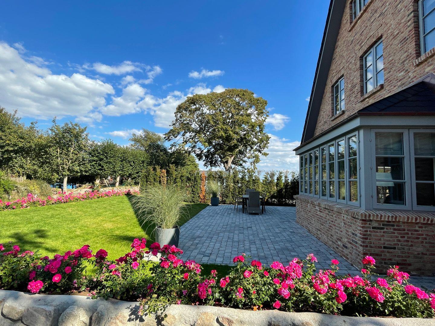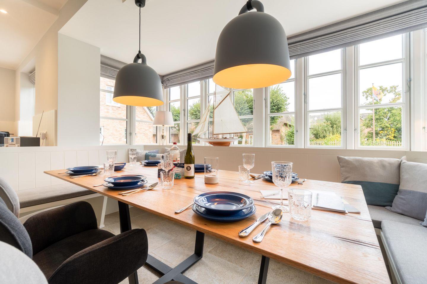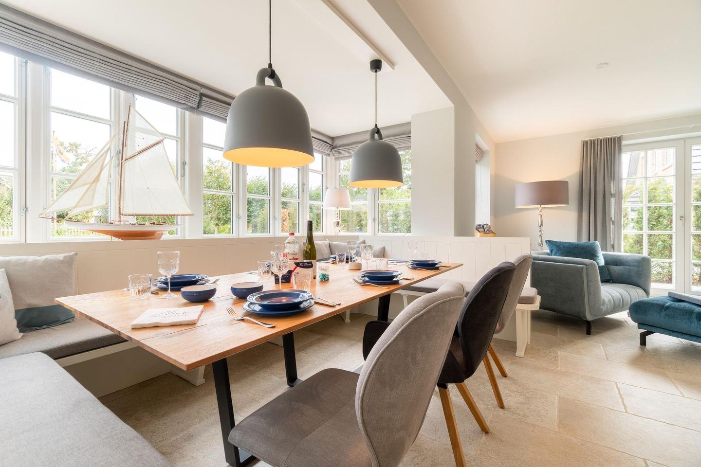 Durch den einladenden Flur gelangen Sie in den großen, lichtdurchfluteten Wohn-/Essbereich mit offener Landhausküche. Die mit hochwertigen Markengeräten und Nespressomaschine ausgestattete Küche lädt mit Dampfgarer zum Kocherlebnis ein. So lässt sich auch im Winter ein herrliches Weihnachts- oder Silvestermenü zaubern. Genießen Sie gesellige Stunden in der gemütlichen „Utlucht“ am Eichentisch oder entspannen Sie im bequemen Lesesessel. Vom Wohnraum aus gelangen Sie direkt auf die große Terrasse mit Blick auf den urigen Friesenwall und seinen für Föhr typischen Rosen. Im Sommer entspannen Sie hier im hauseigenen Strandkorb oder genießen wundervolle Grillabende. Im Herbst oder Winter, wenn der Wind über die Insel weht, laden Sauna und ein prasselndes Feuer im Kamin zu gemütlichen Stunden ein.