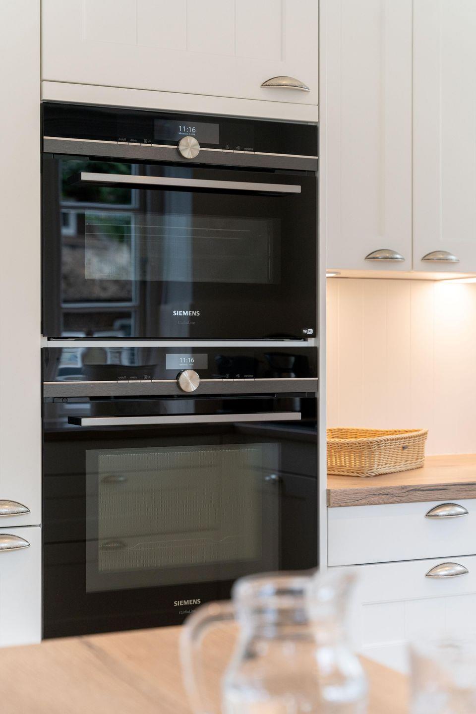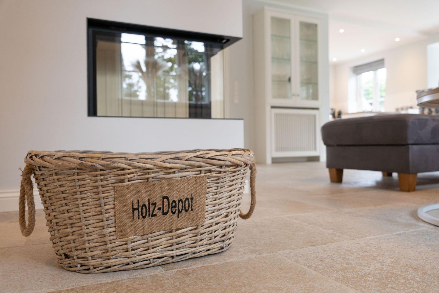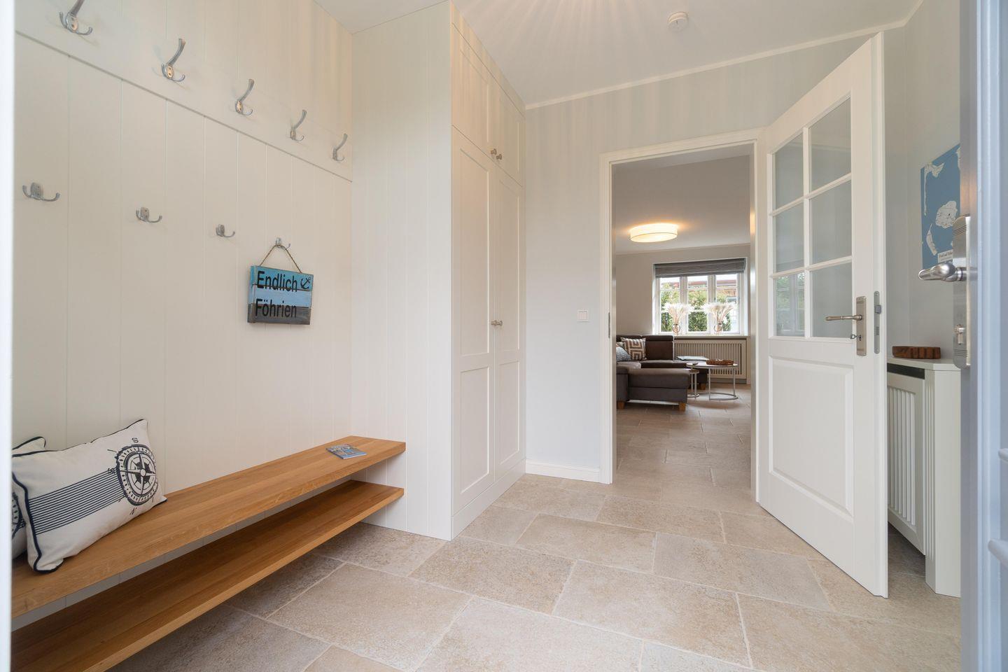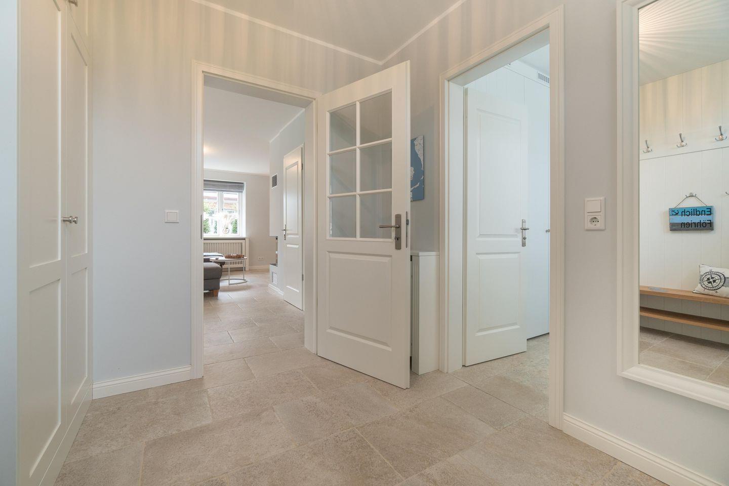 Durch den einladenden Flur gelangen Sie in den großen, lichtdurchfluteten Wohn-/Essbereich mit offener Landhausküche. Die mit hochwertigen Markengeräten und Nespressomaschine ausgestattete Küche lädt mit Dampfgarer zum Kocherlebnis ein. So lässt sich auch im Winter ein herrliches Weihnachts- oder Silvestermenü zaubern. Genießen Sie gesellige Stunden in der gemütlichen „Utlucht“ am Eichentisch oder entspannen Sie im bequemen Lesesessel. Vom Wohnraum aus gelangen Sie direkt auf die große Terrasse mit Blick auf den urigen Friesenwall und seinen für Föhr typischen Rosen. Im Sommer entspannen Sie hier im hauseigenen Strandkorb oder genießen wundervolle Grillabende. Im Herbst oder Winter, wenn der Wind über die Insel weht, laden Sauna und ein prasselndes Feuer im Kamin zu gemütlichen Stunden ein.