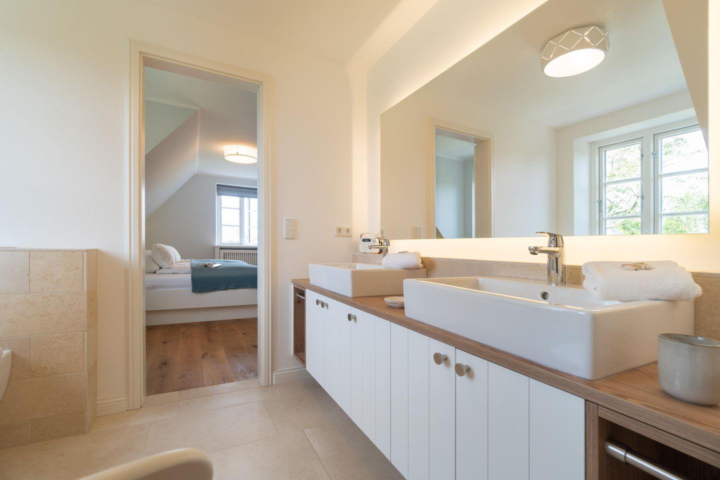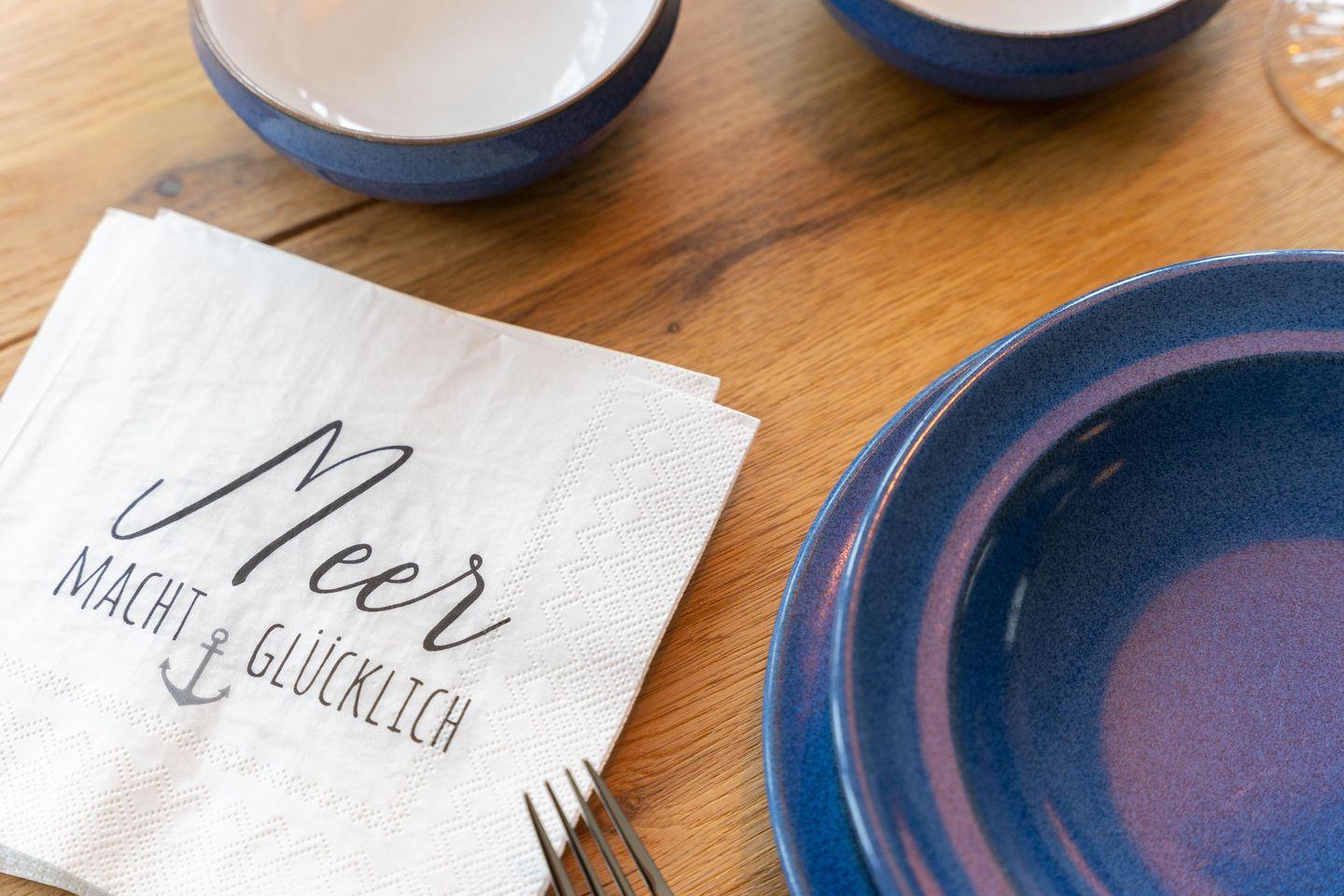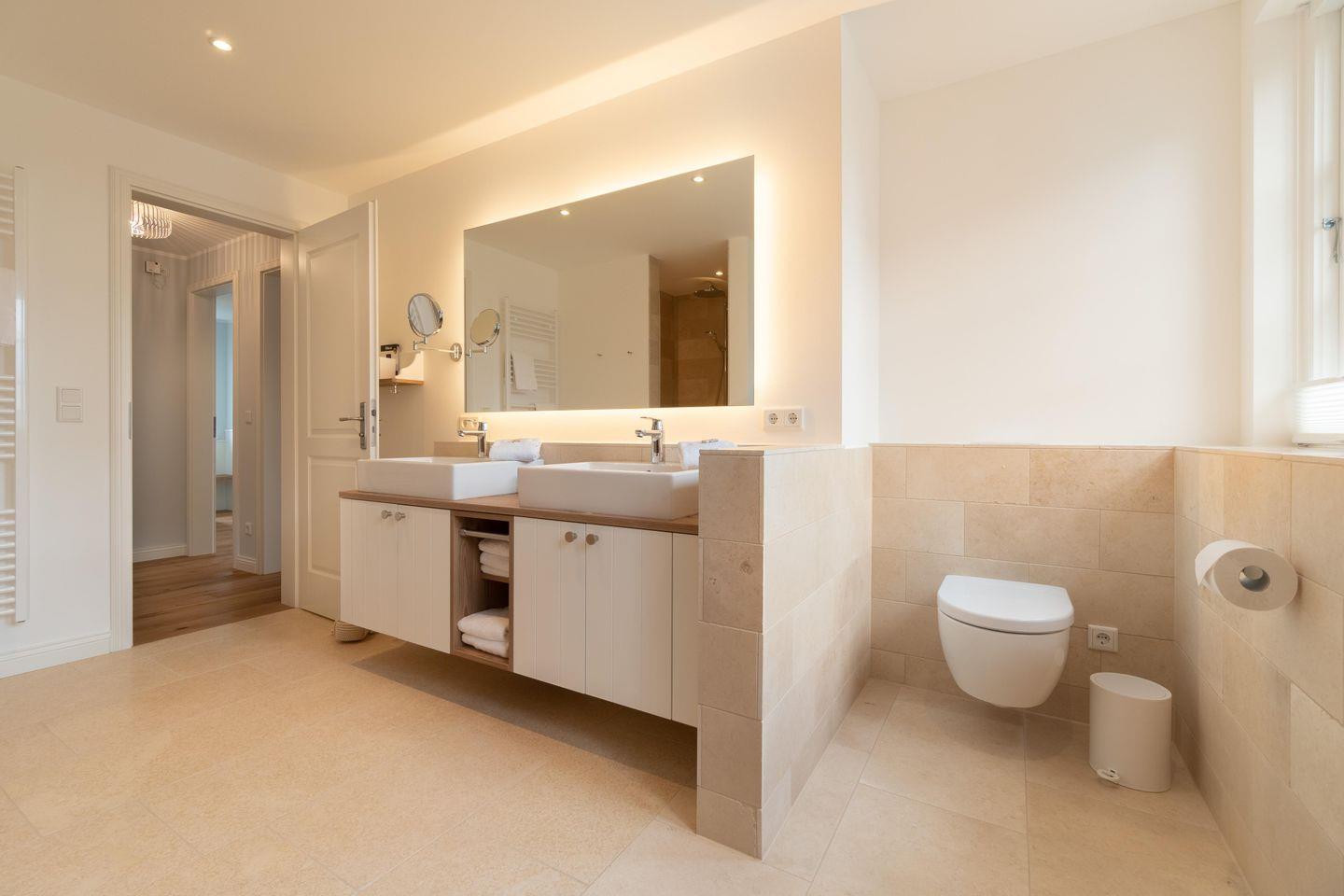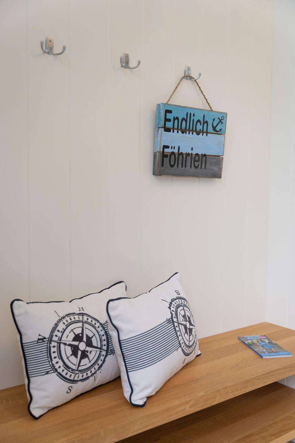 Ob edle Holzböden aus Eiche, Holzmöbeleinbauten auf Maß vom hiesigen Tischler angefertigt oder Bäder in Naturstein, in harmonischer Farbgestaltung verbinden sich Moderne, nordischer Küsten-Charme und friesische Gemütlichkeit und verbreiten Ruhe und Exklusivität. Liebevolle Details machen es leicht, vom Alltag Erholung zu finden.