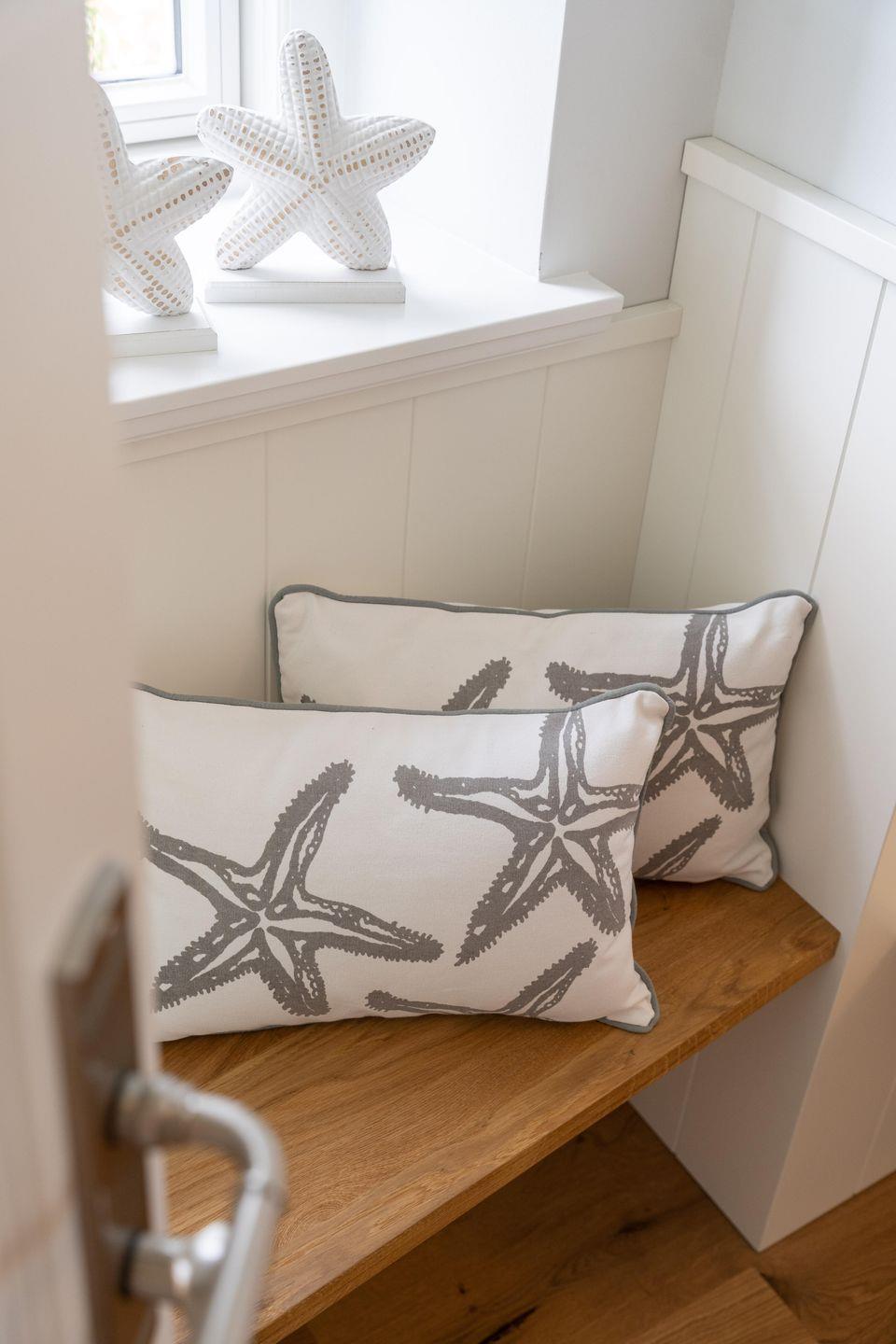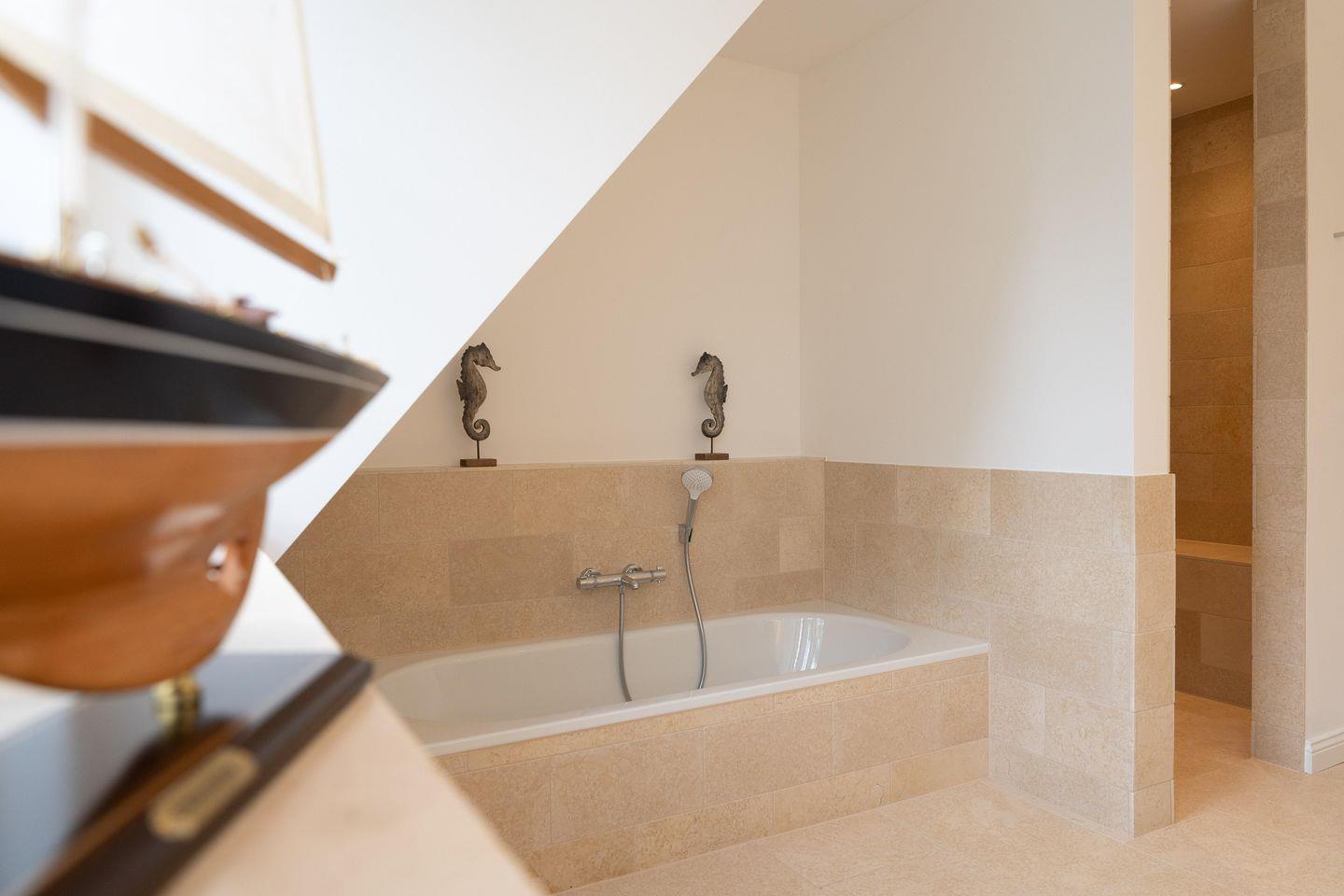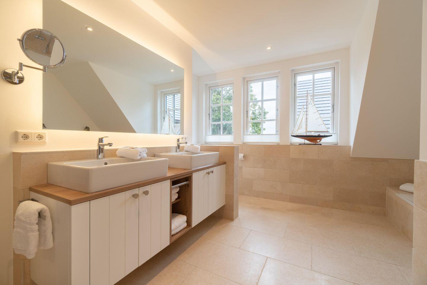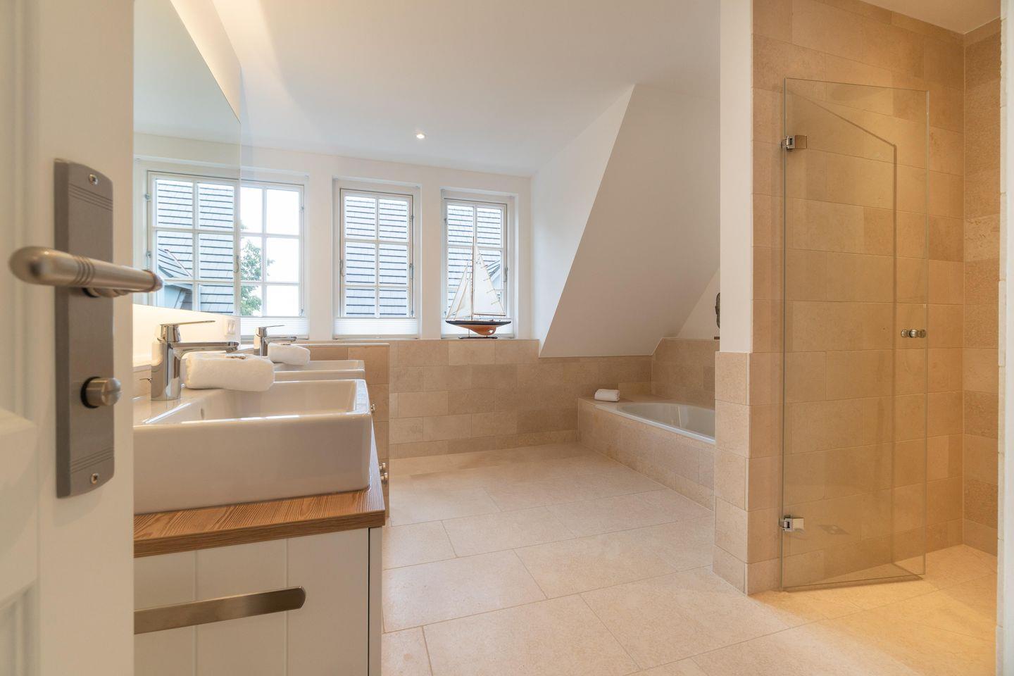 Ob edle Holzböden aus Eiche, Holzmöbeleinbauten auf Maß vom hiesigen Tischler angefertigt oder Bäder in Naturstein, in harmonischer Farbgestaltung verbinden sich Moderne, nordischer Küsten-Charme und friesische Gemütlichkeit und verbreiten Ruhe und Exklusivität. Liebevolle Details machen es leicht, vom Alltag Erholung zu finden.