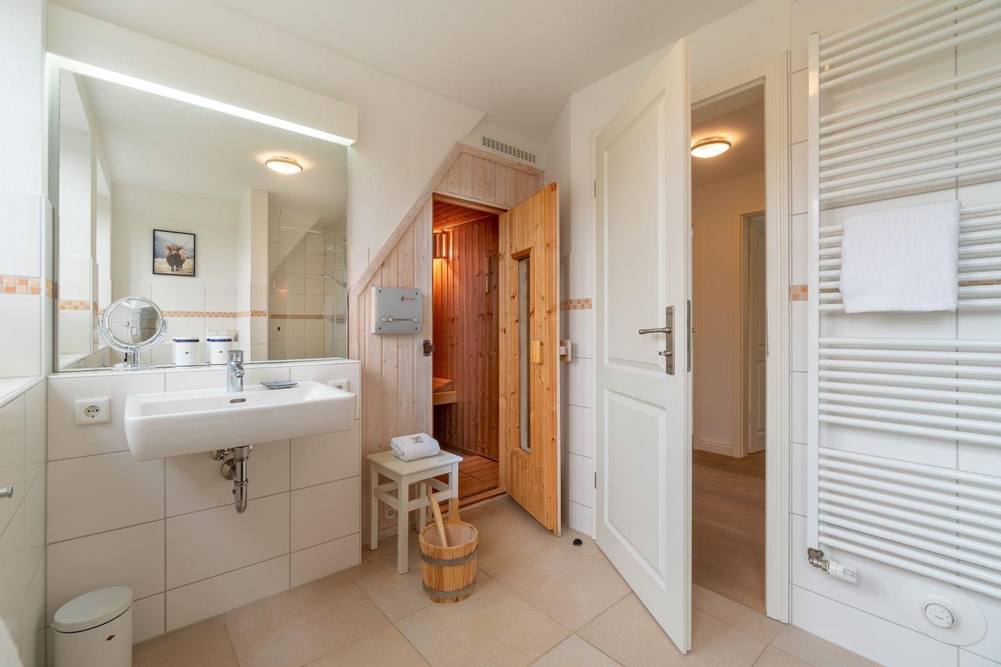 Im Obergeschoss sind die drei Schlafzimmer - eines mit einem Doppelbett, eines mit zwei Einzelbetten und eines mit einem Einzelbett - sowie ein Duschbad mit der hauseigenen Sauna gelegen.