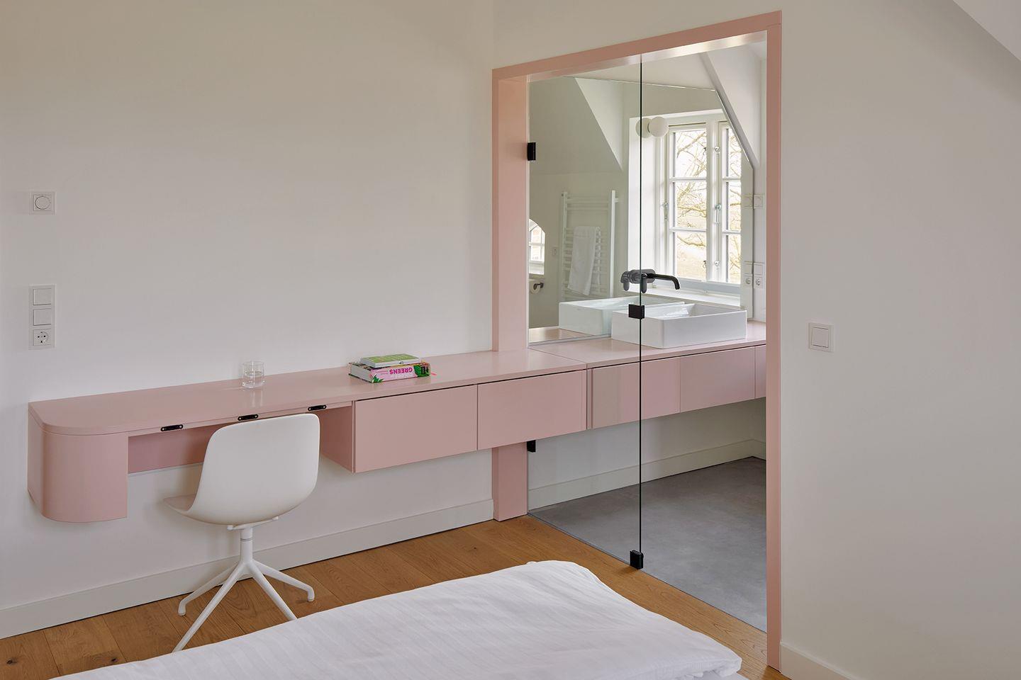 Schlafzimmer mit Bad-en-Suite im Obergeschoss: Das Schlafzimmer geht durch eine großzügige Glastür in das angeschlossene Badezimmer über. Die Öffnung sorgt dafür, dass zu verschiedenen Tageszeiten im Raum eine unterschiedliche Stimmung wirkt. Ein Sideboard zieht sich vom Schlafzimmer ins Badezimmer und verbindet die Funktionen eines Schreibtisches, einer Kommode und des Waschtisches. Der Raum ist zum First geöffnet und sorgt mit einer indirekt beleuchteten Raumhöhe von mehr als 7,50 m für ein offenes Wohngefühl.