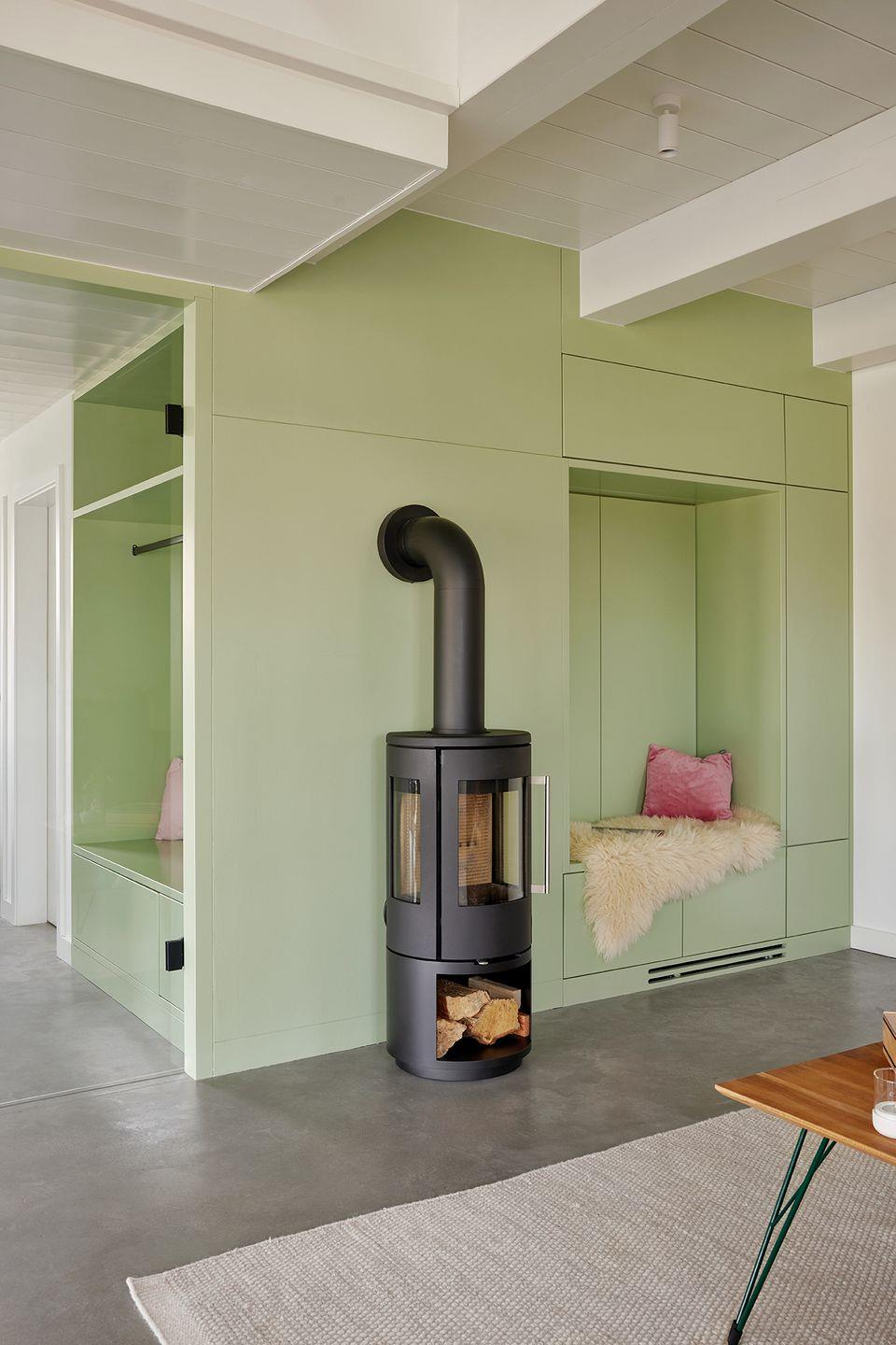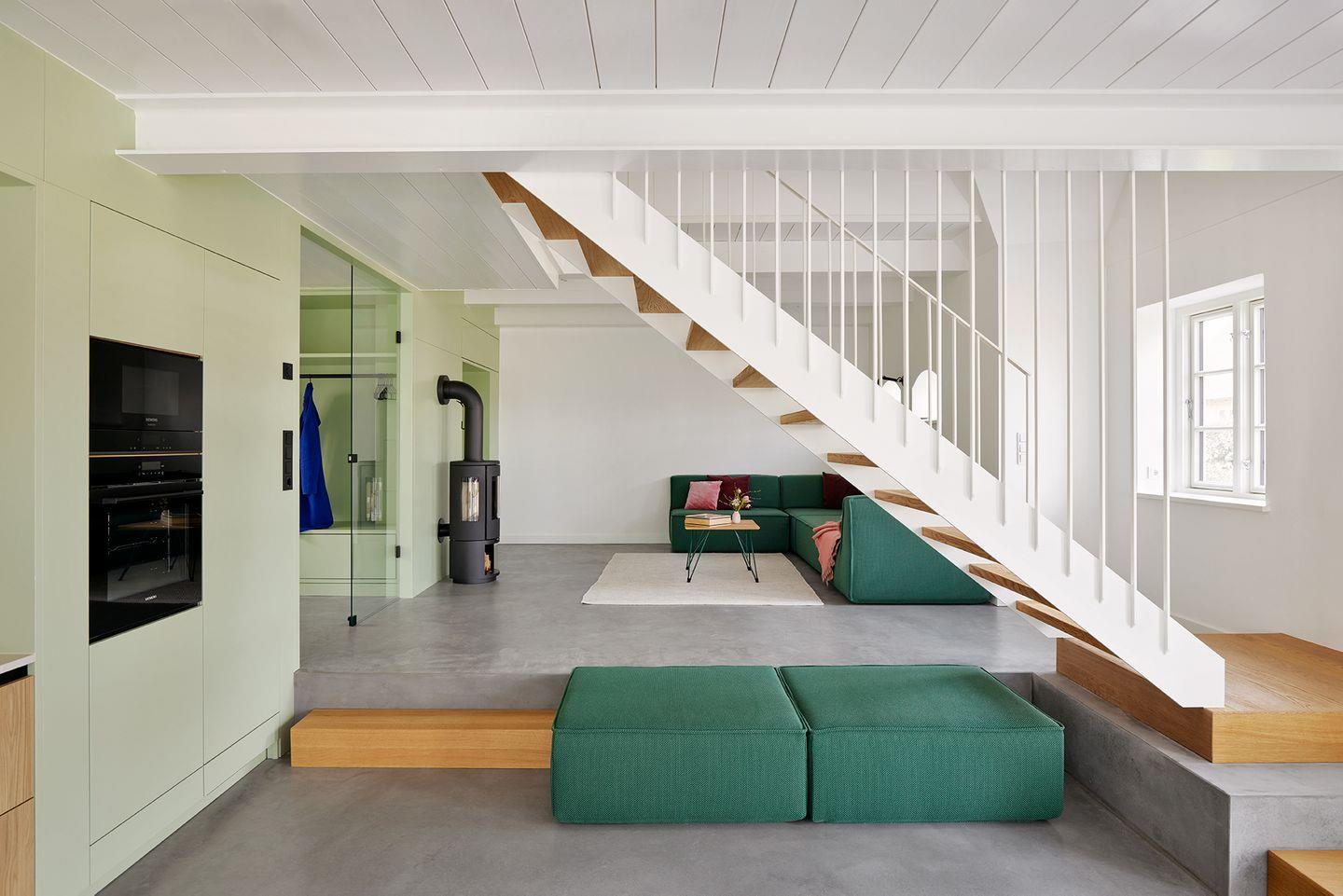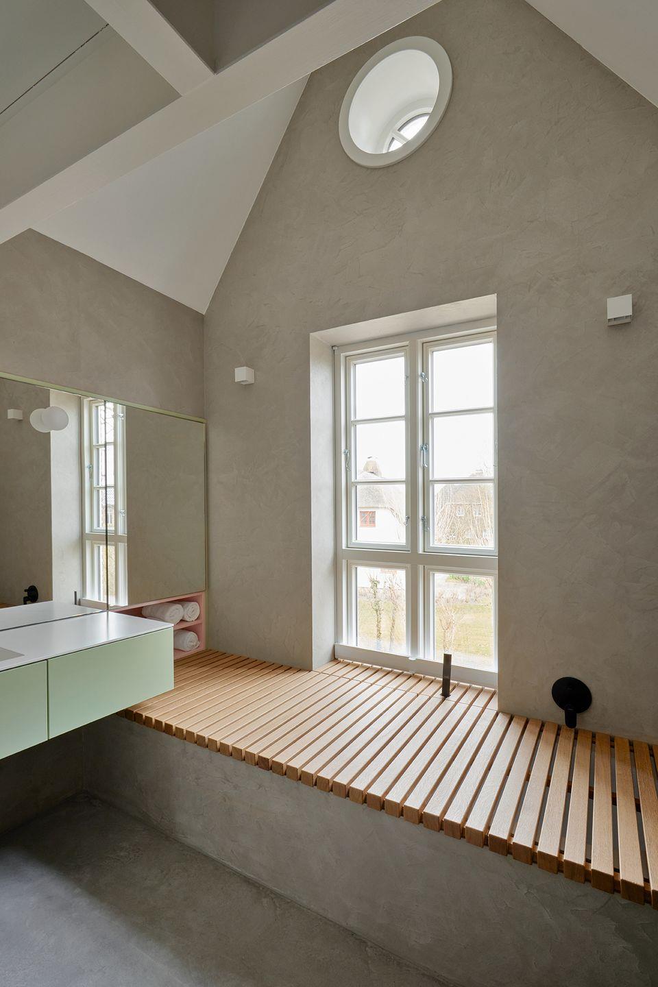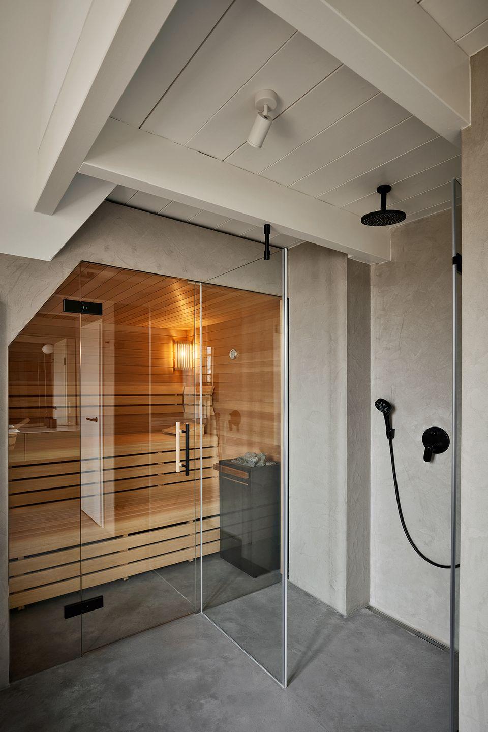 Durch den Kamin der Traditionsmarke Morsoe, der abgesenkten Badewanne mit Blick ins Grüne sowie der maßgefertigten Sauna vom Tischler werden weitere Orte der Entspannung geschaffen. Durch die professionelle Lichtplanung wird für stimmungsvolles Licht in den verschiedenen Zonen des Hauses gesorgt und ein zusätzlicher Wohlfühlfaktor hervorgerufen. Im gesamten Haus herrscht durch die integrierte Fußbodenheizung Barfußklima.